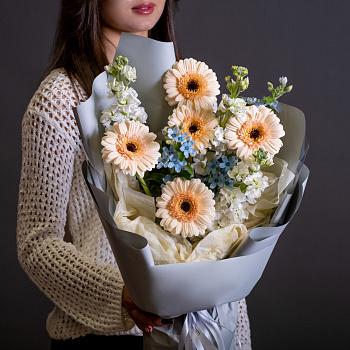 гербера мини 2, роза эквадор 50 см 3, роза кустовая джульетта 2, маттиола 2, гвоздика 3, пистач 2, упаковка, лента