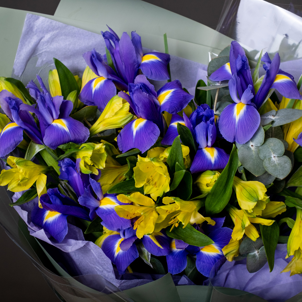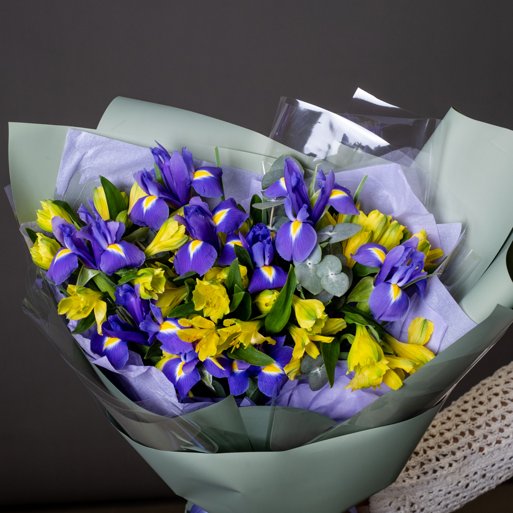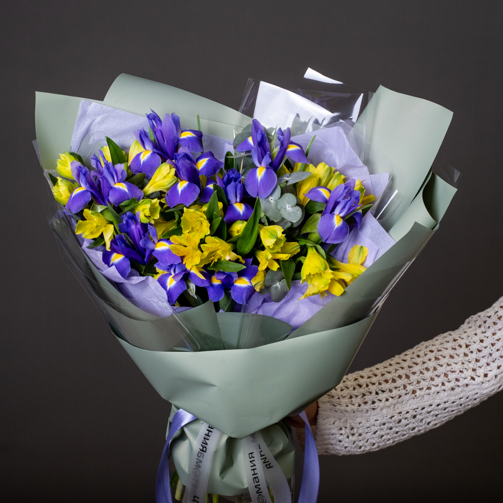 ирис 9, альстромерия 4, эвкалипт 1, упаковка, лента