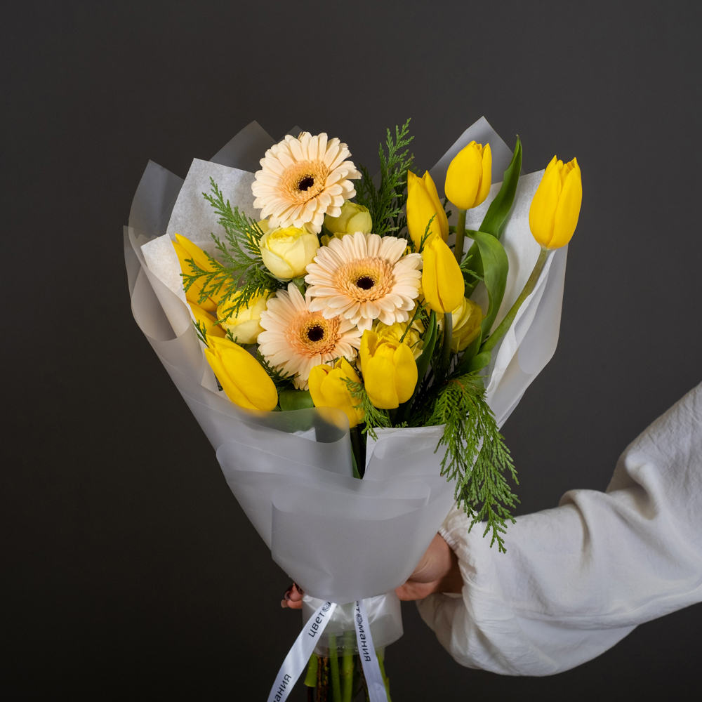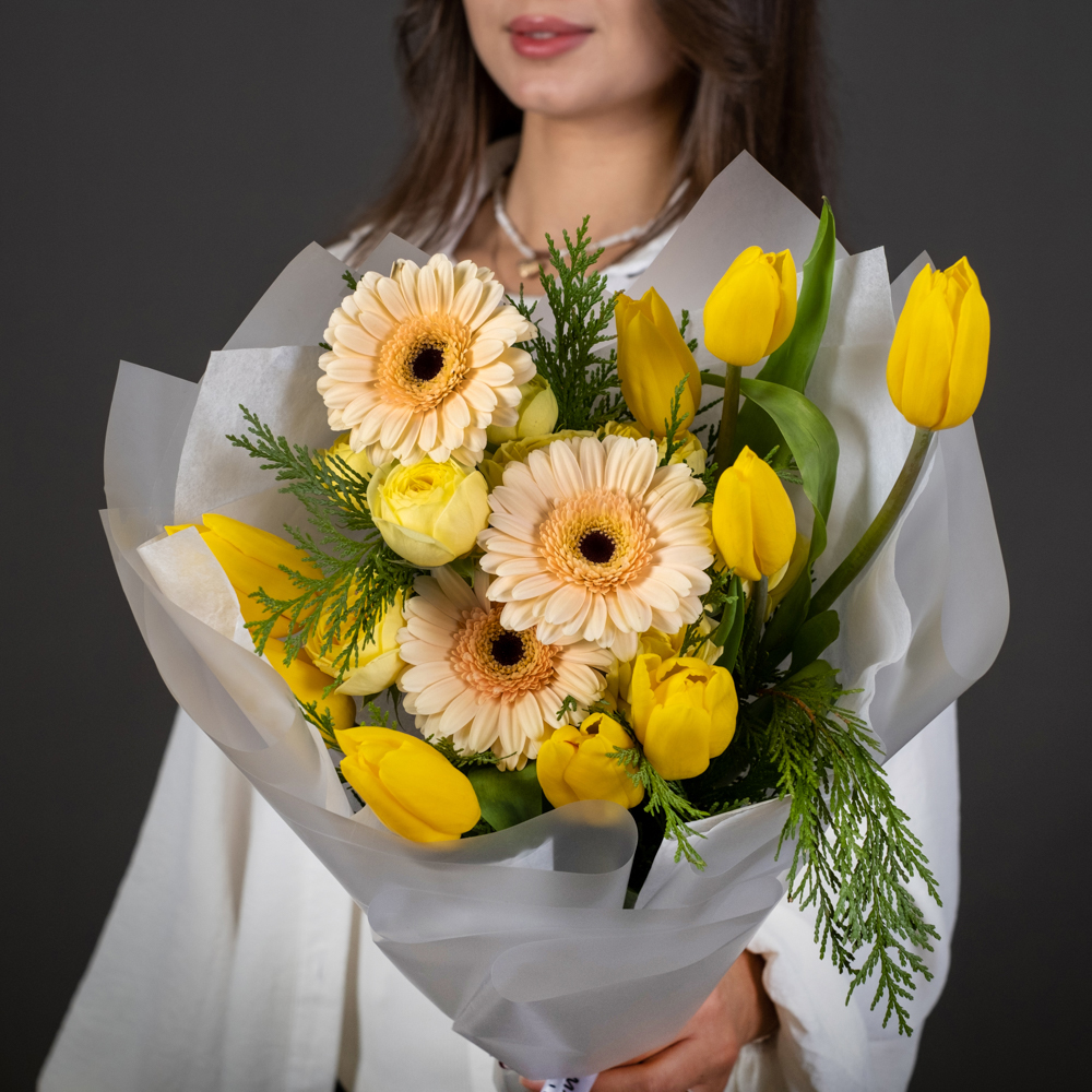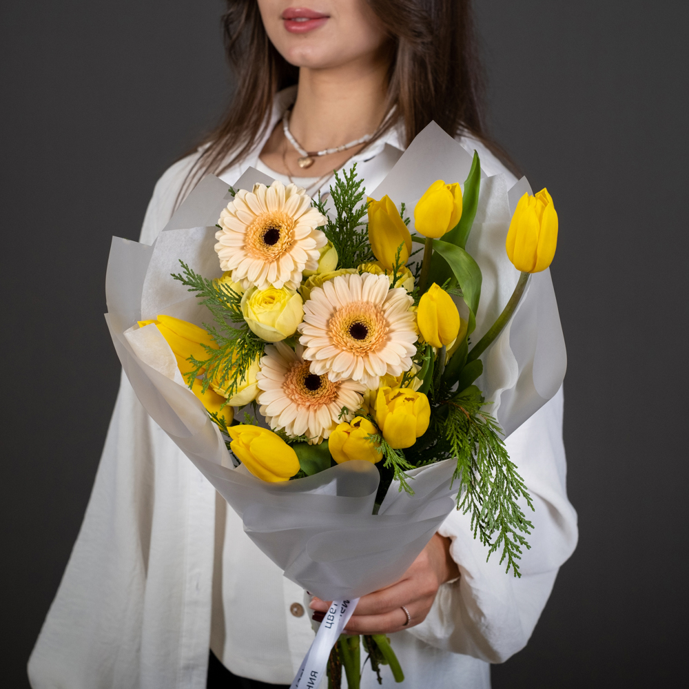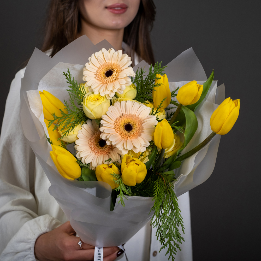 гербера мини 3, тюльпан 9, кустовая роза 2, туя 1, упаковка, лента