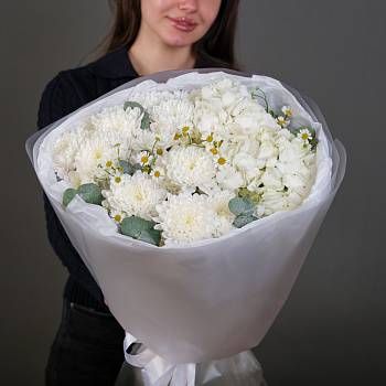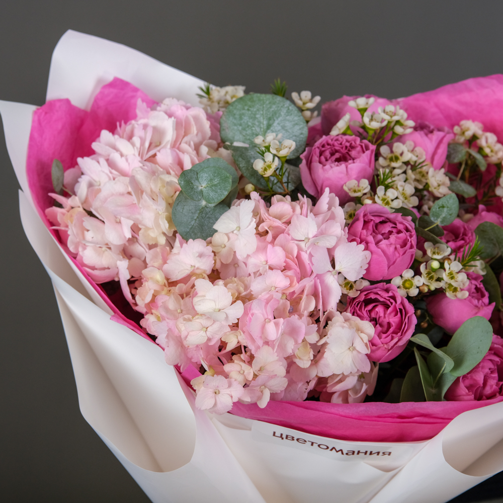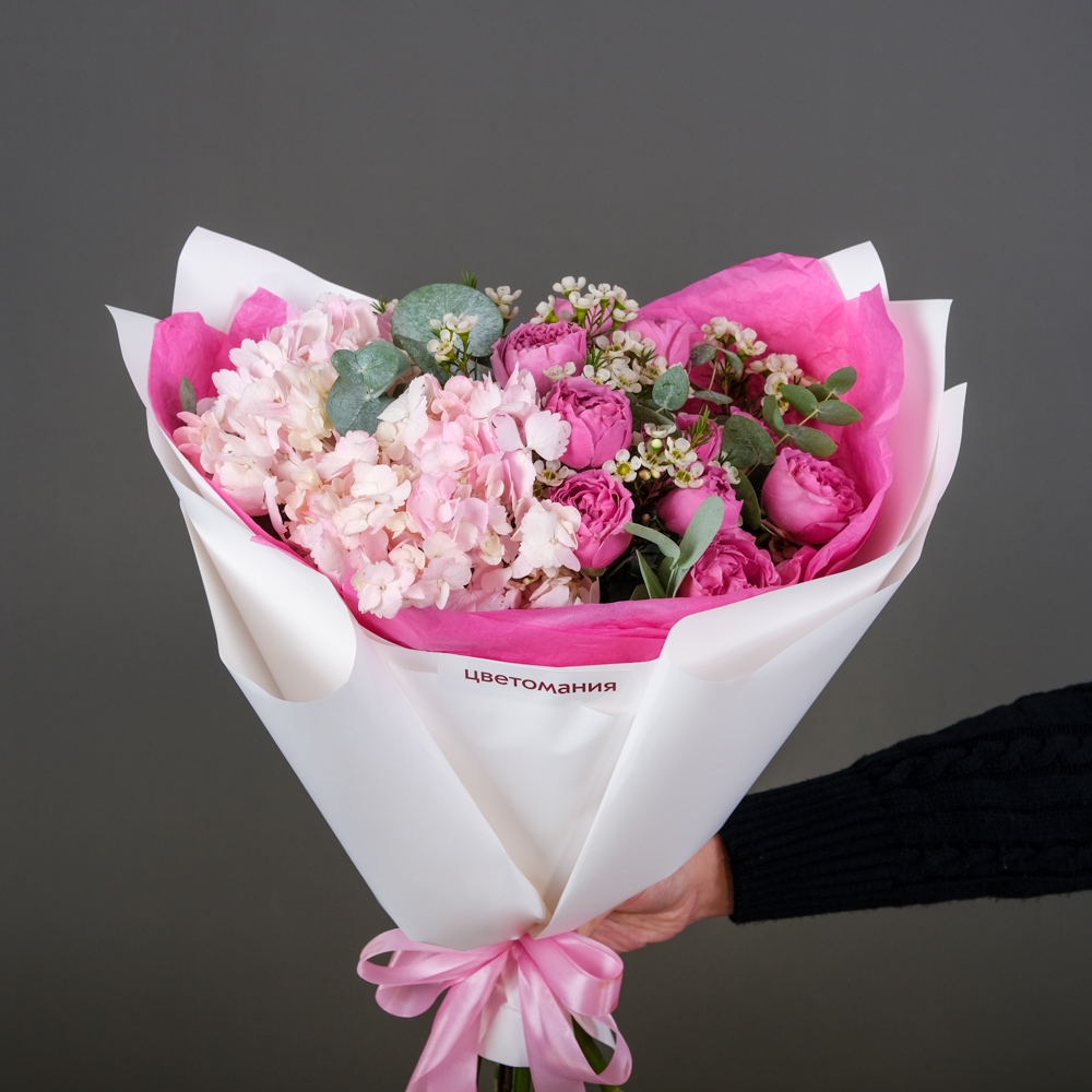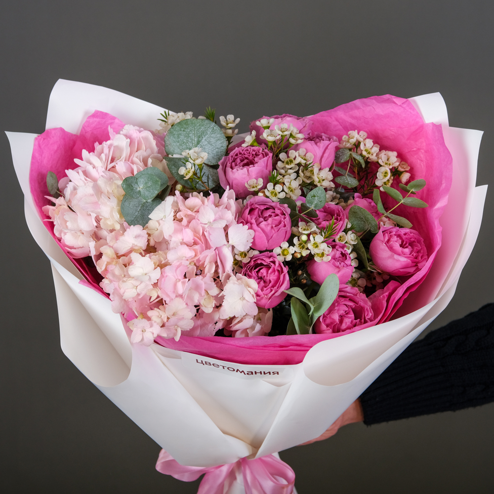кустовая роза мисти бабблс 3, гортензия 2, хамелациум 2, эвкалипт 1, упаковка, тишью, лента