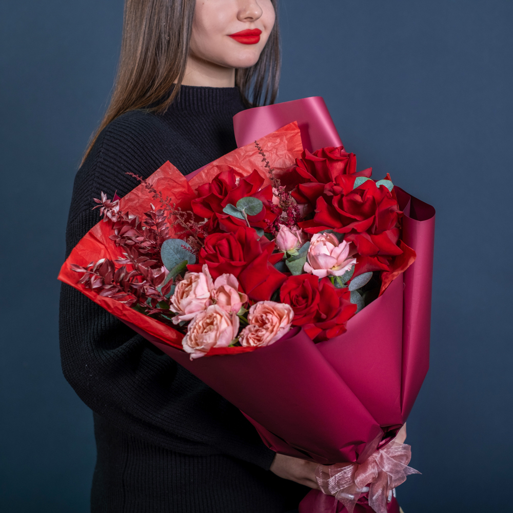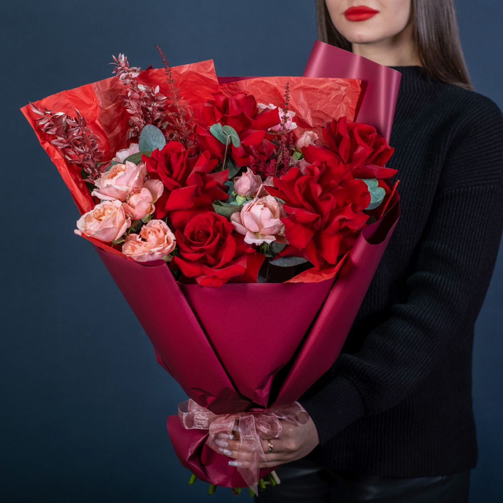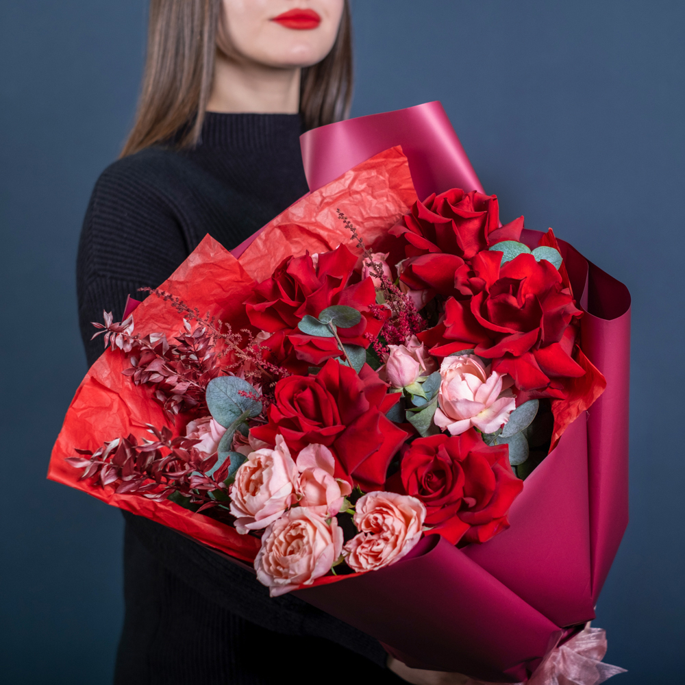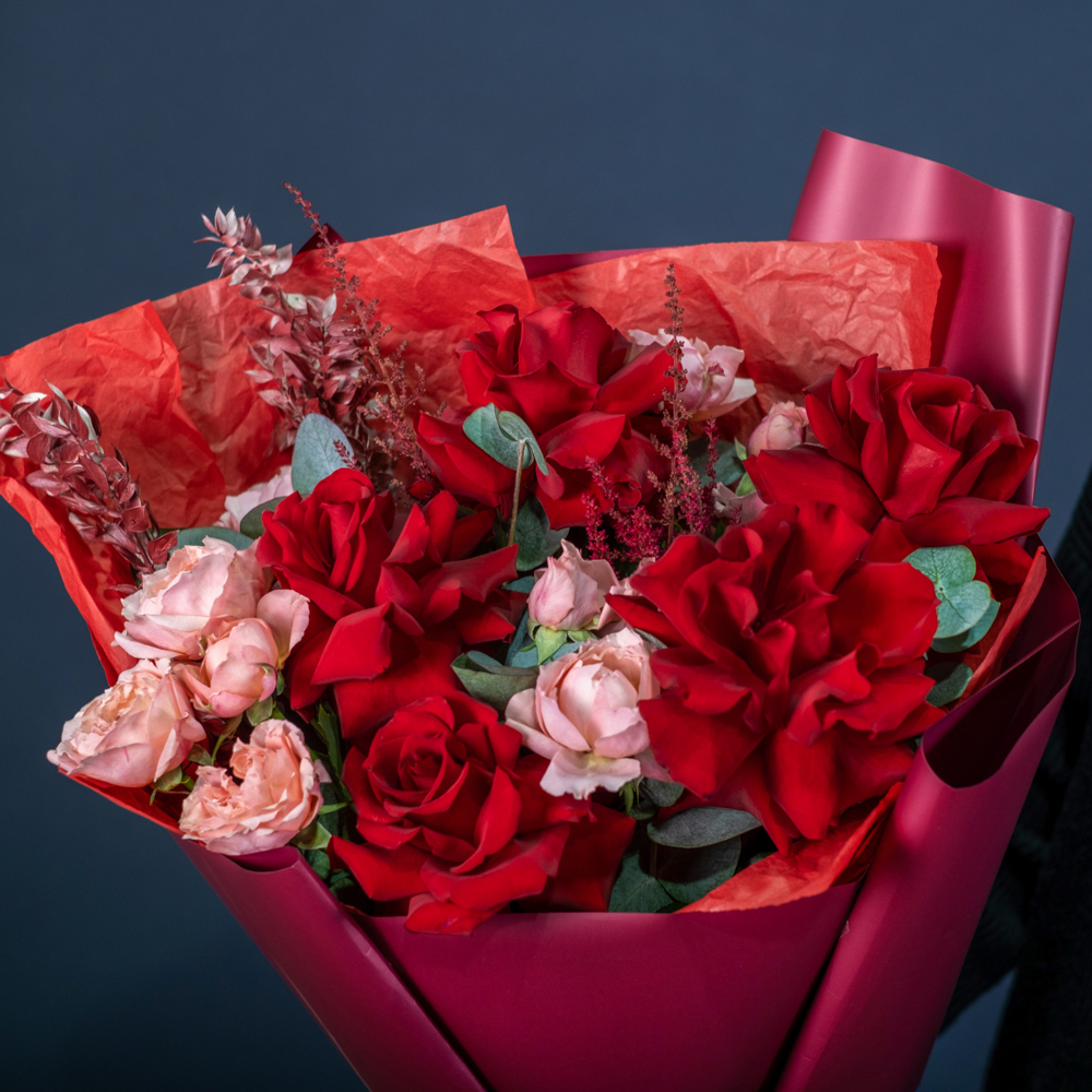 роза кустовая джульетта 4, эвкалипт 0,5, роза эквадор 50 см 5, рускус стабилизированный 2, астильба 2, краска 0,3, упаковка, лента