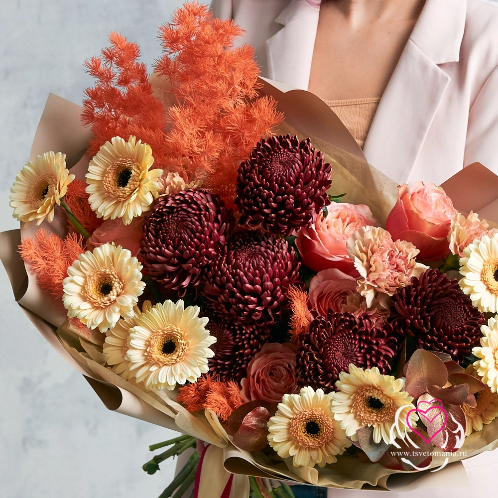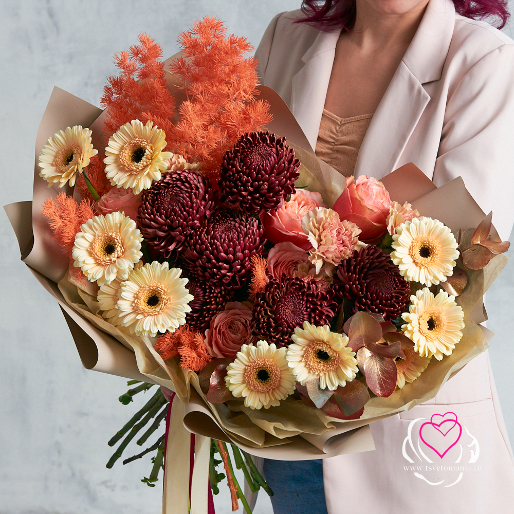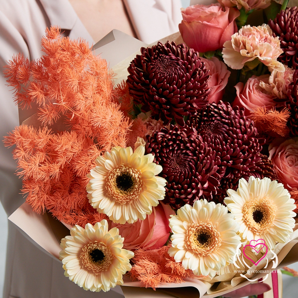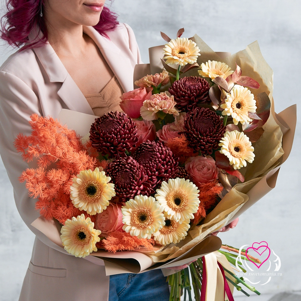 роза кагала 5, гербера мини 10, хризантема бигуди рэд 6, гвоздика голландия 5, аспарагус стабилизированный 1, эвкалипт цинерея 2, пистач 3, упаковка, лента