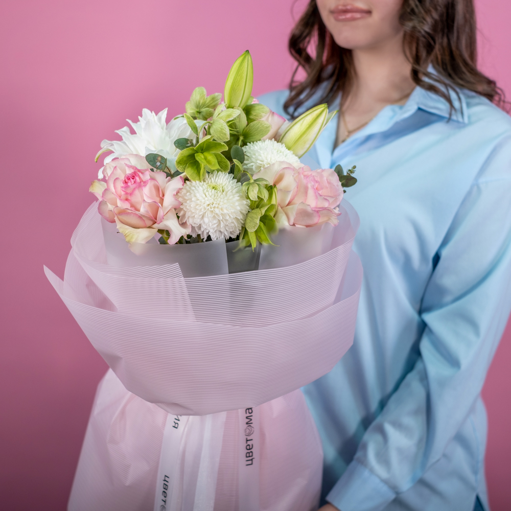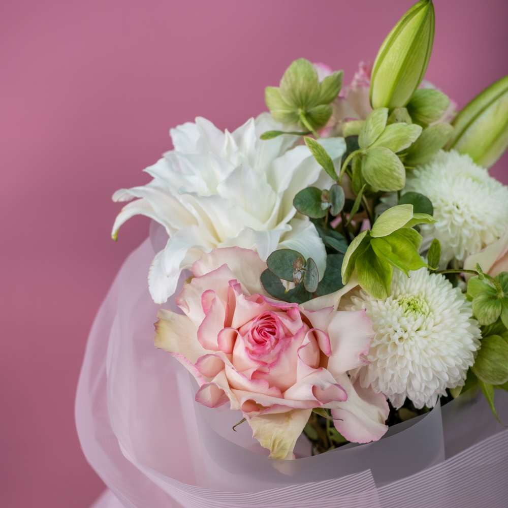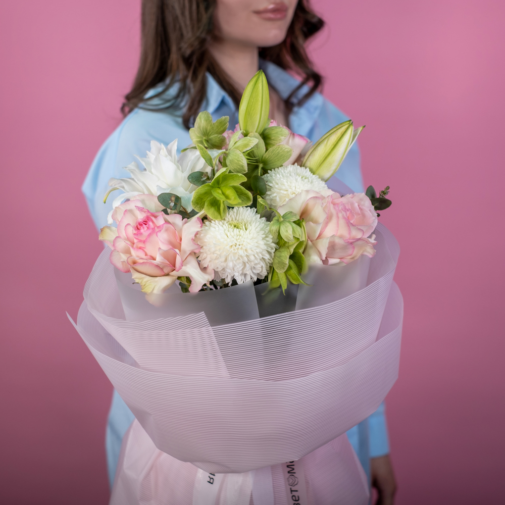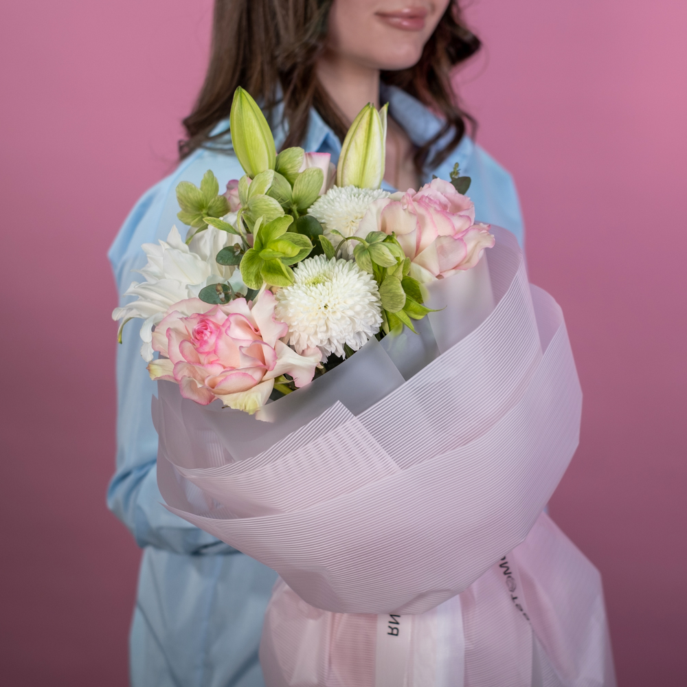 лилия евро 1, французская роза 3, хелеборус 1, хризантема стандарт 3, эвкалипт 0,5 упаковка, лента