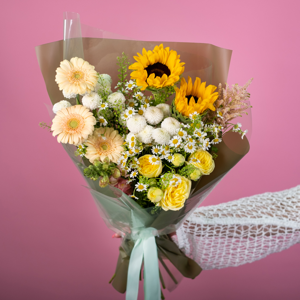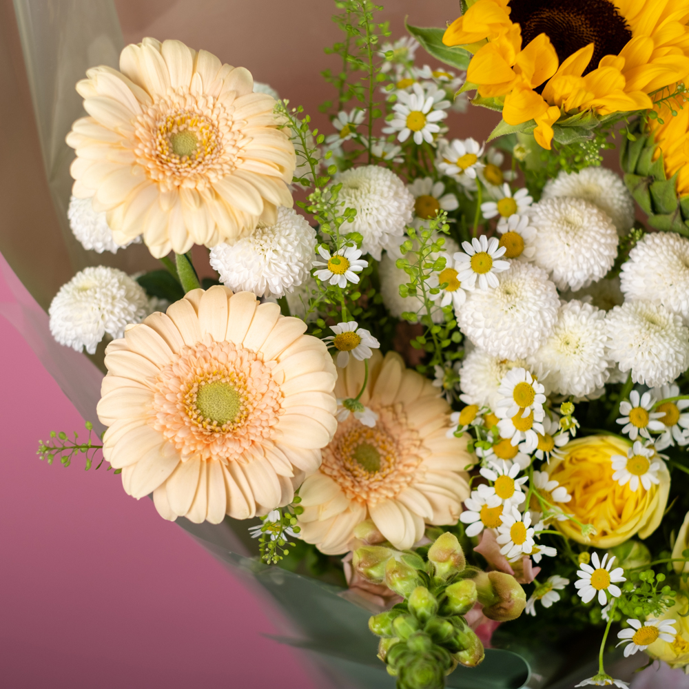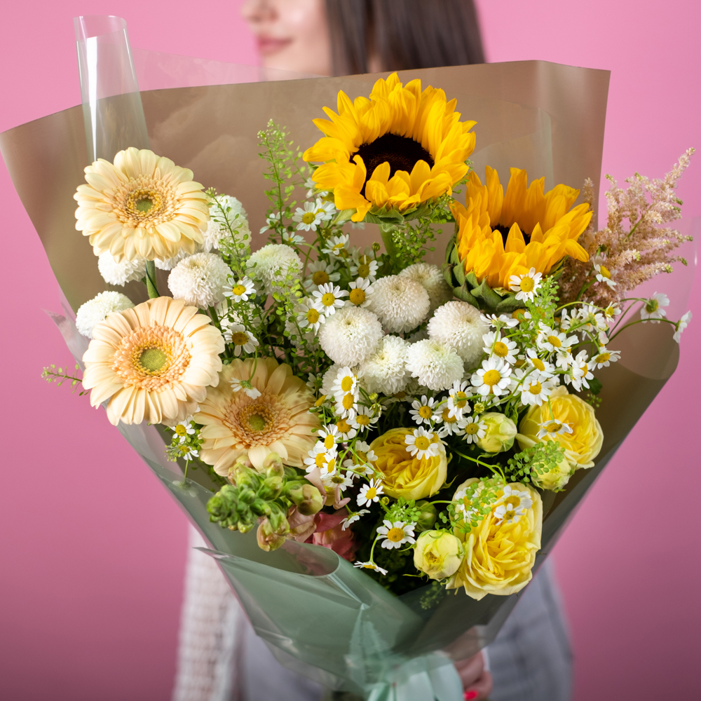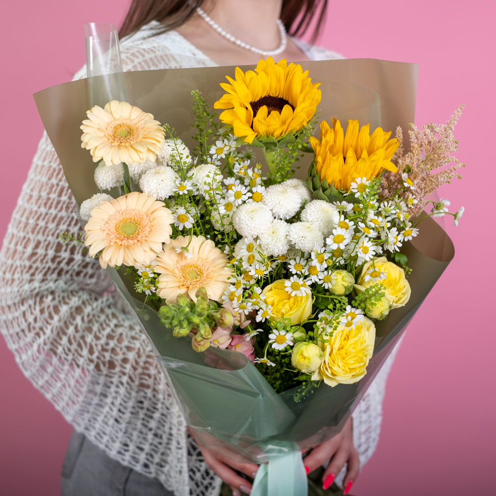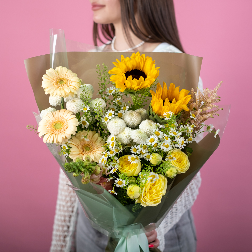 роза кустовая 1, матрикария 3, антирринум 1, астильба 1, подсолнух 2, хризантема кустовая 2, гербера мини 3, тиласпия 2, пистач 2, упаковка, лента