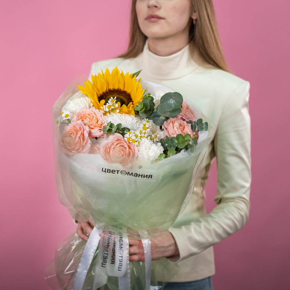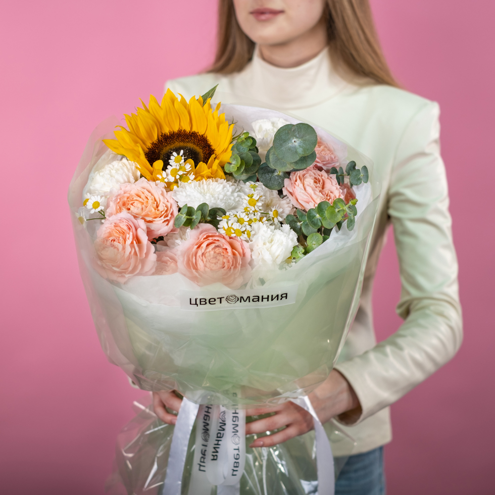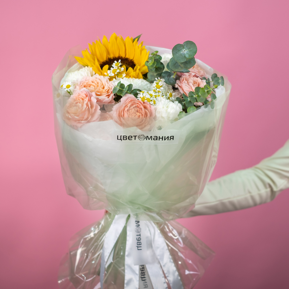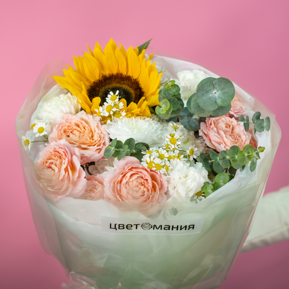 подсолнух 1, кустовая роза джульетта 2, хризантема кустовая 1, матрикария 2, эвкалипт 1, упаковка, лента