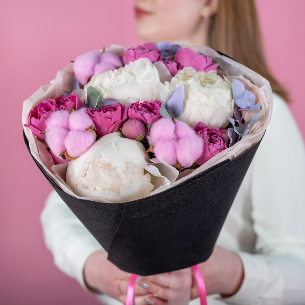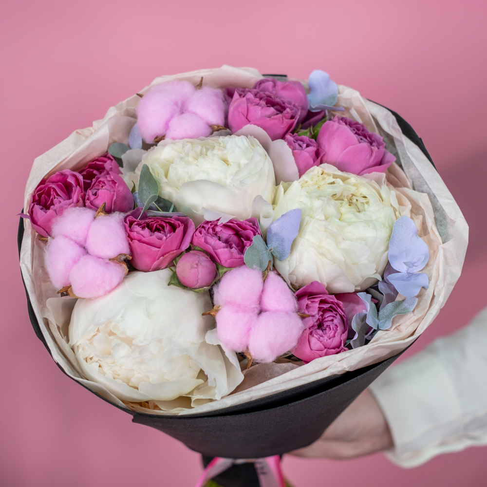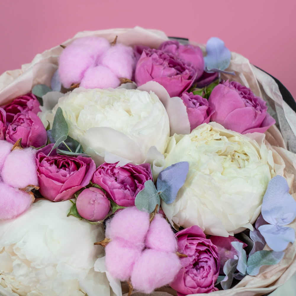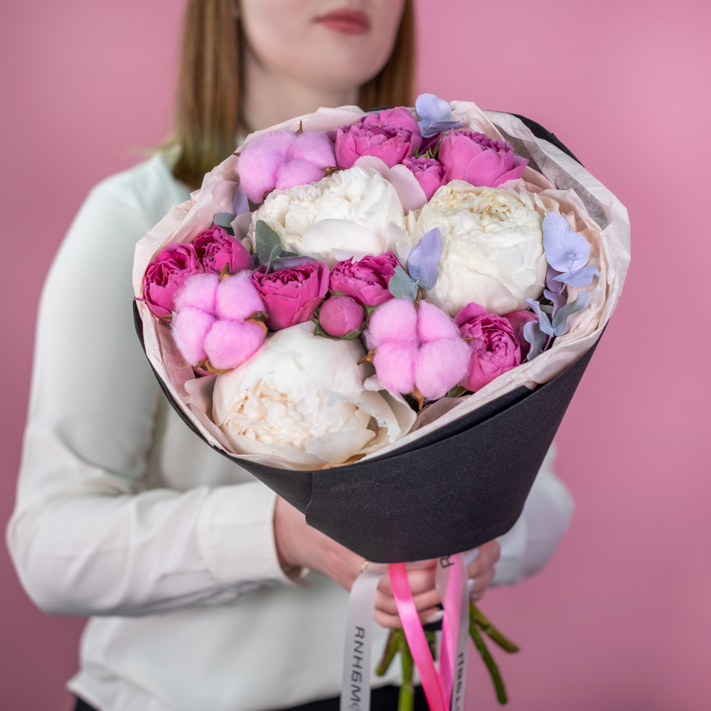пион премиум 3, кустовая роза мисти бабблс 3, хлопок 3, эвкалипт 1, краска 0,3, упаковка, лента