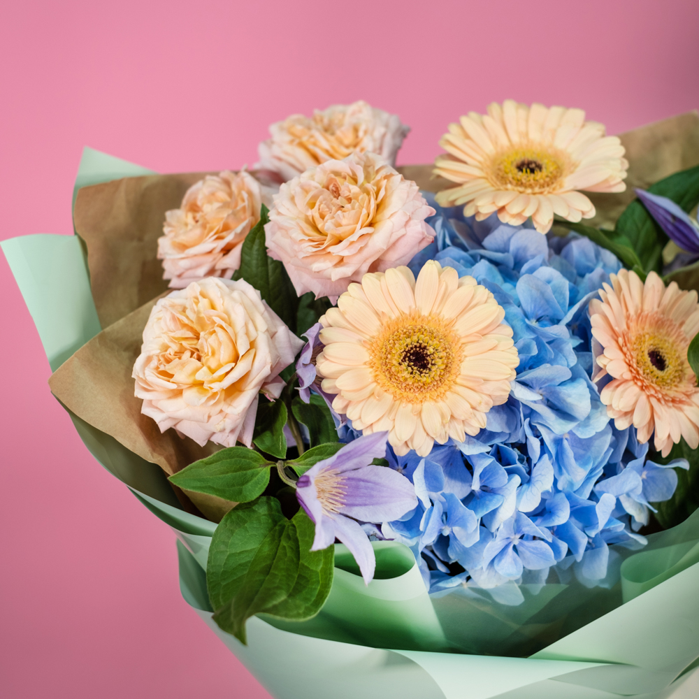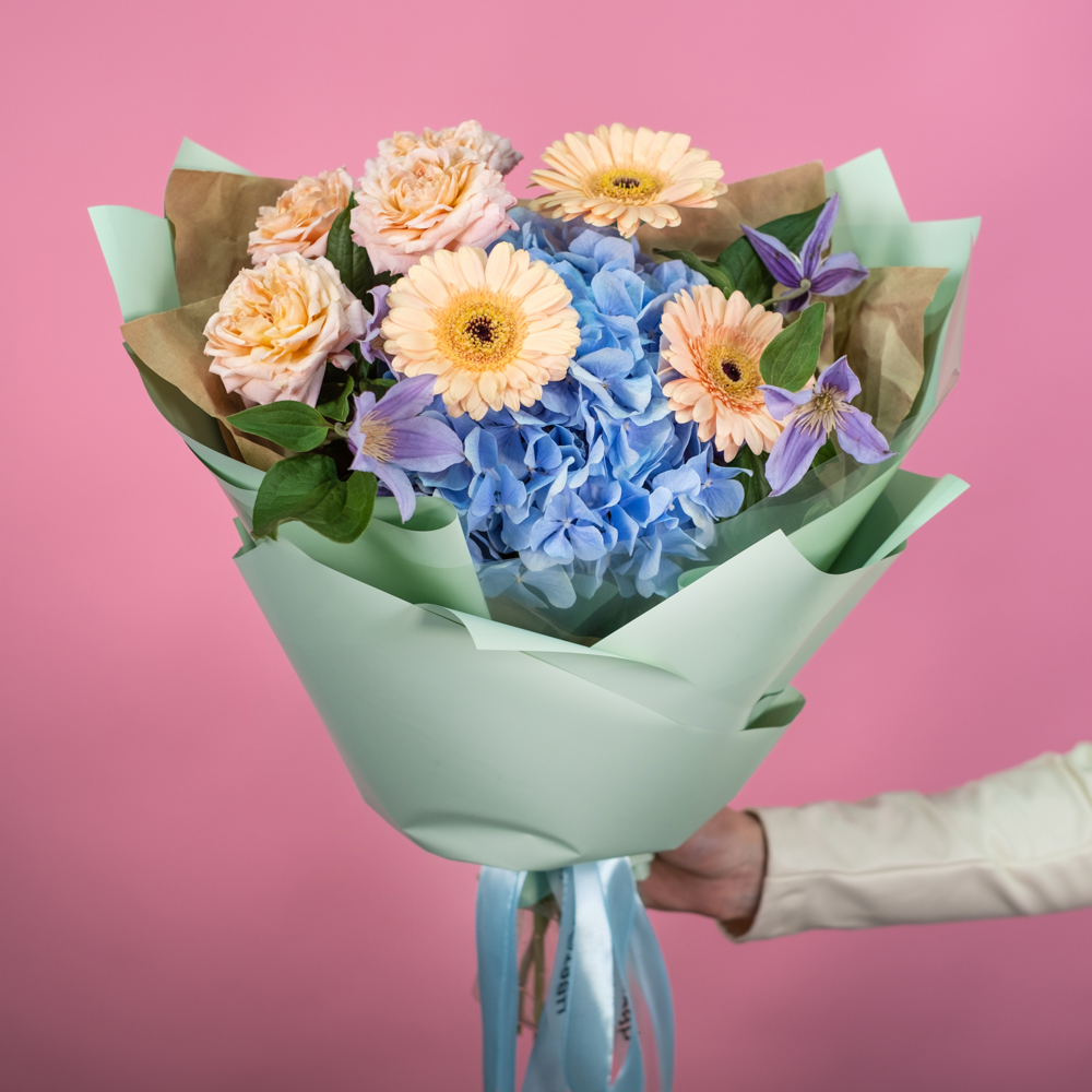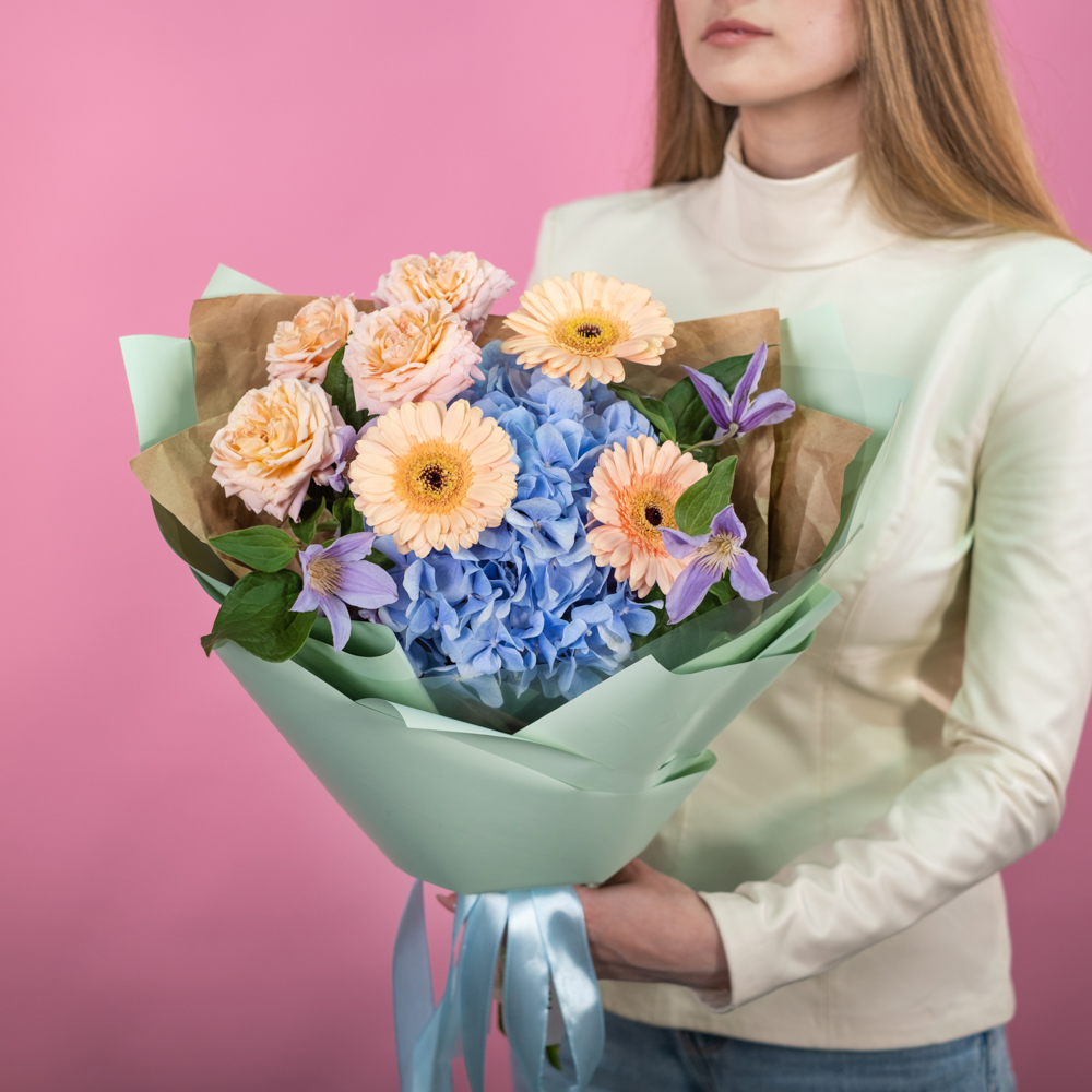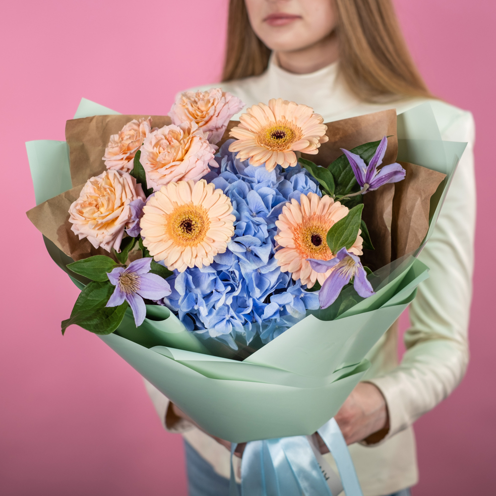 гербера мини 3, гортензия 1, клематис 2, роза кустовая джульетта 1, упаковка, лента