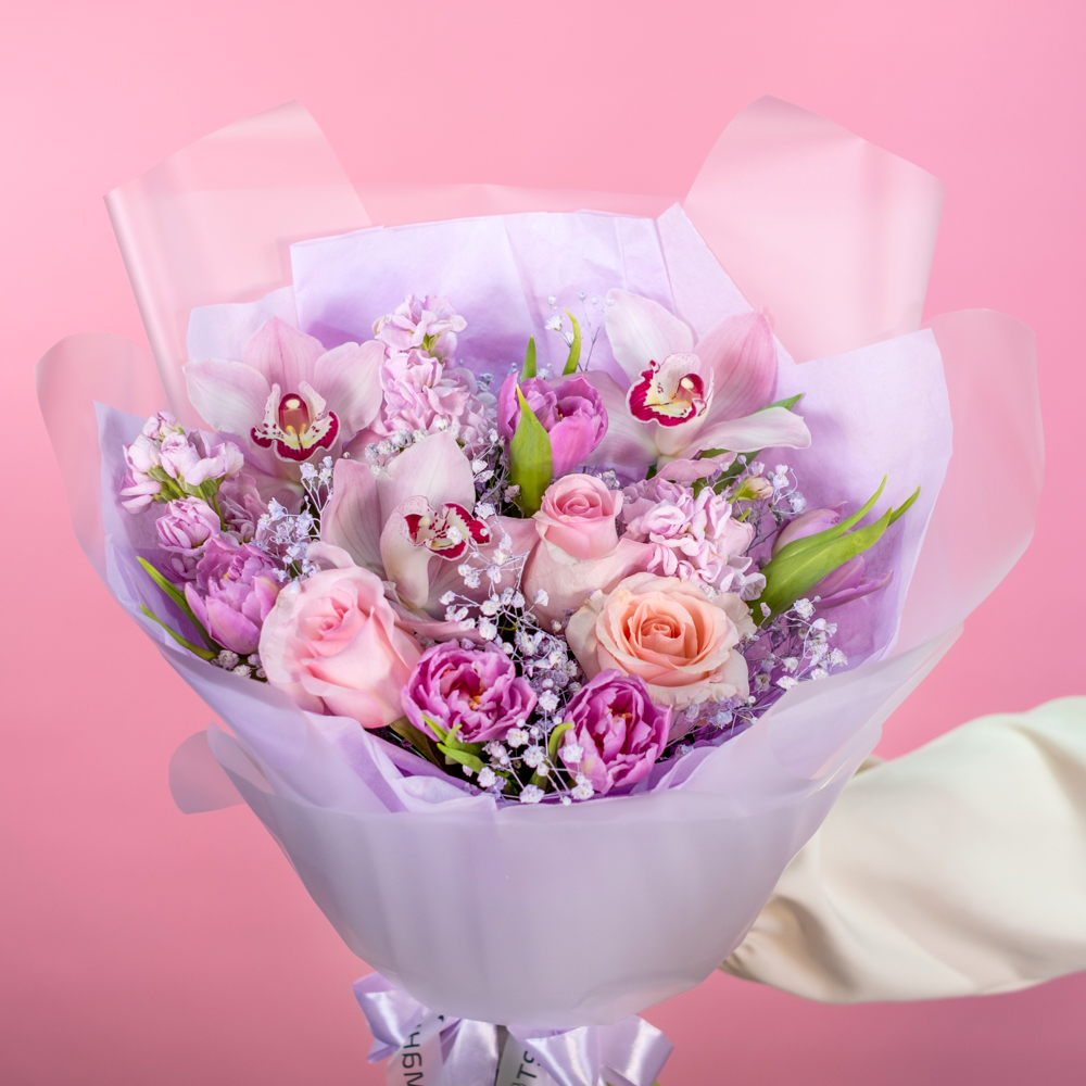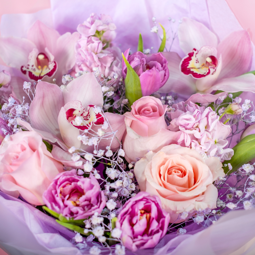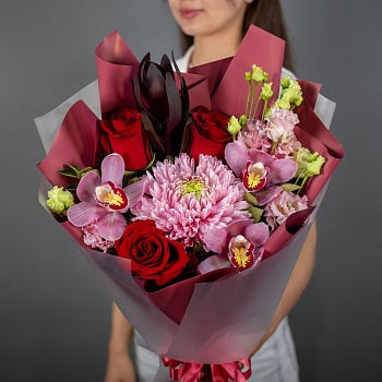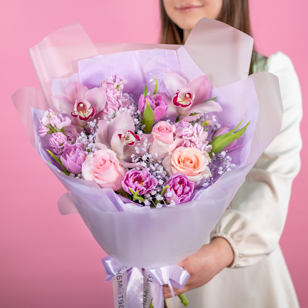 орхидея цимбидиум 3, роза эквадор 50 см 3, гипсофила 1, тюльпан 5, маттиола 3, краска, упаковка, лента, аквабокс, сумка