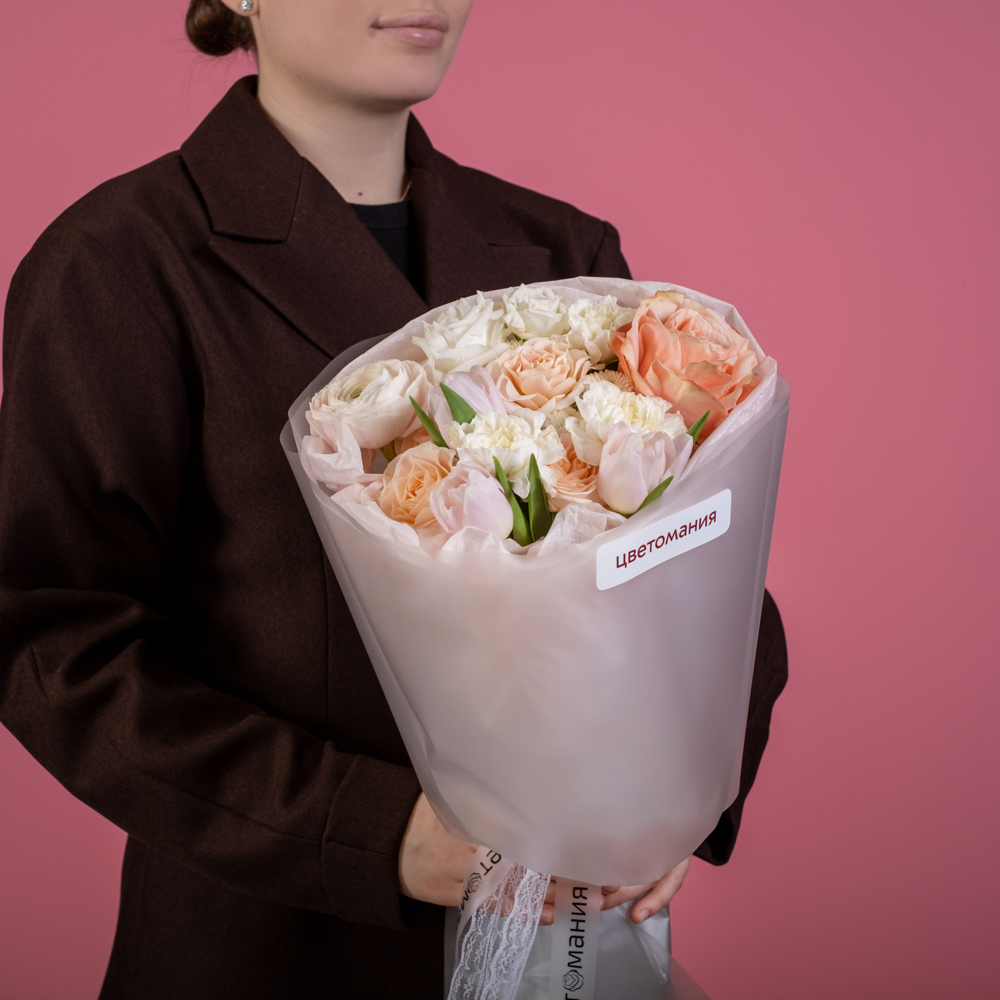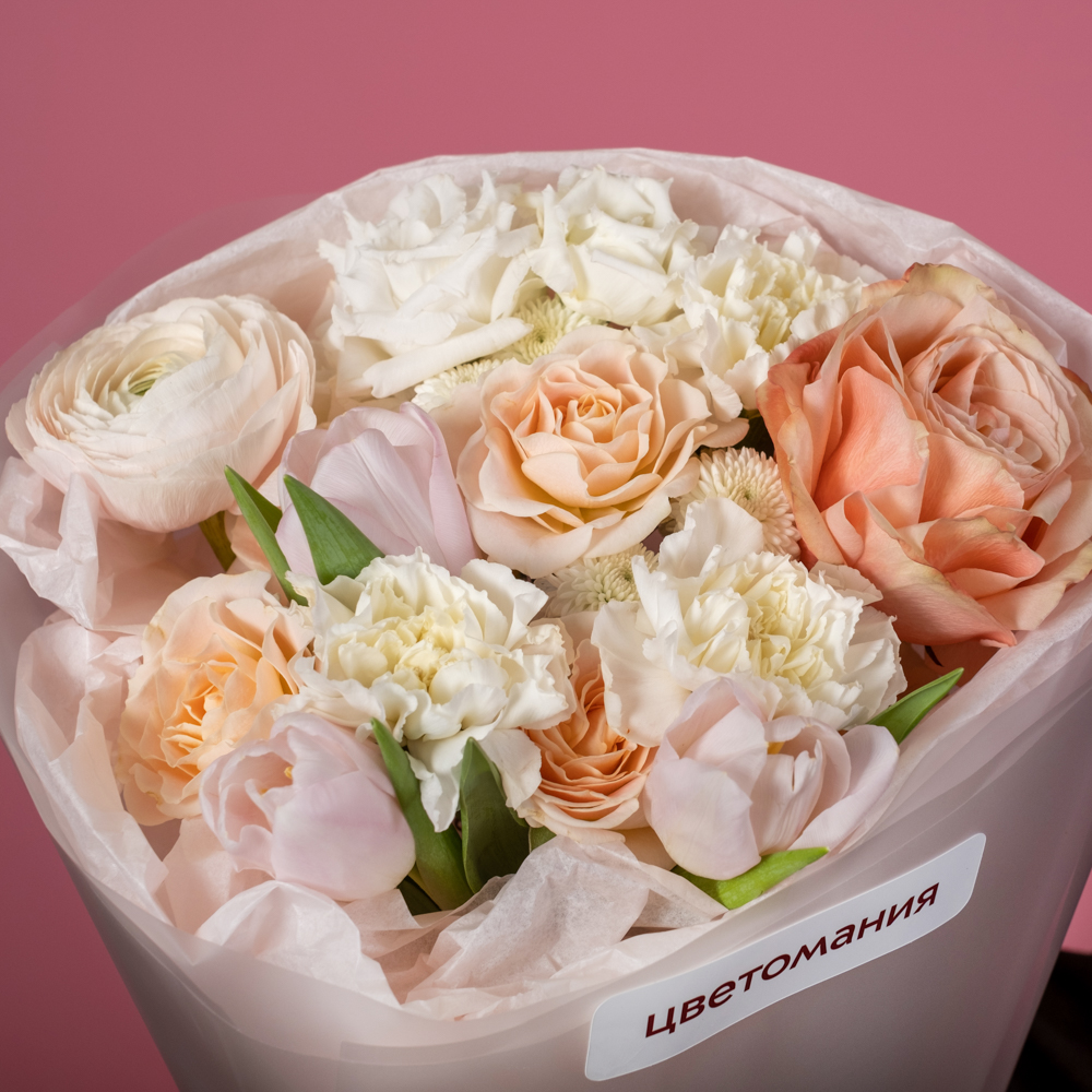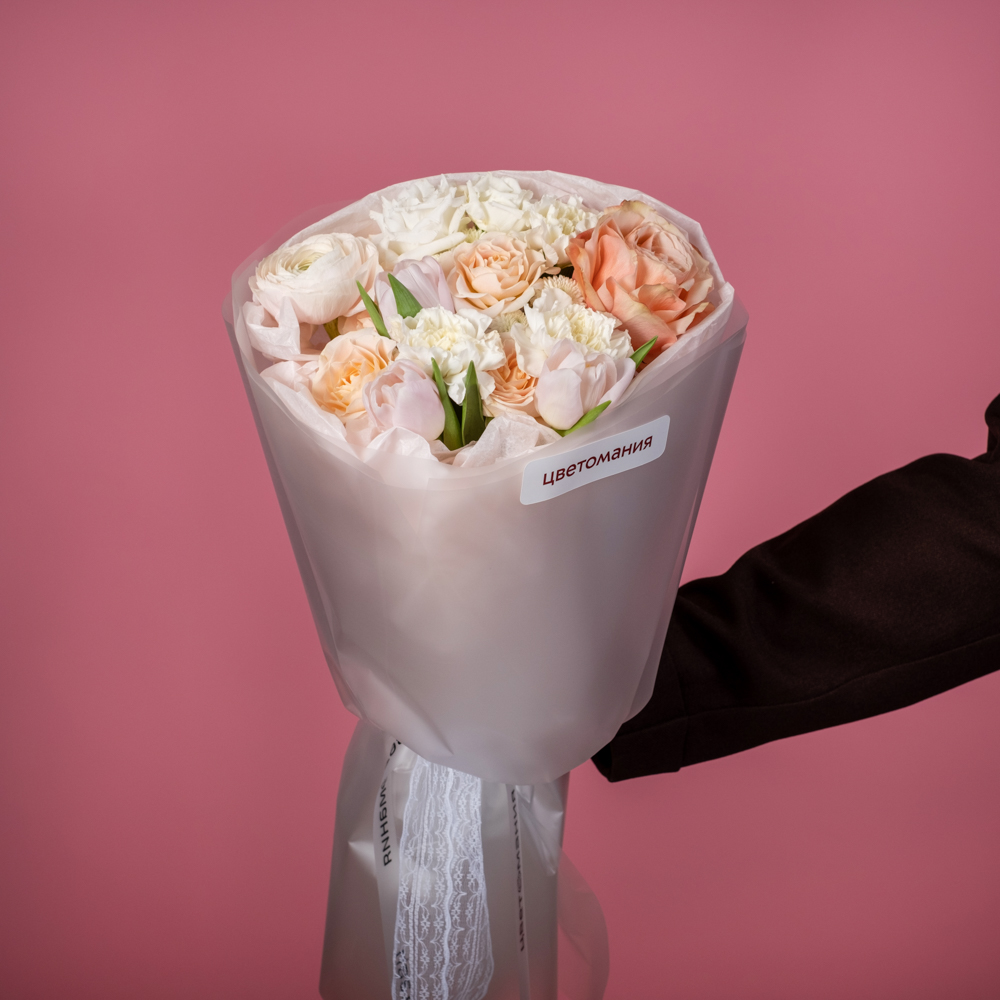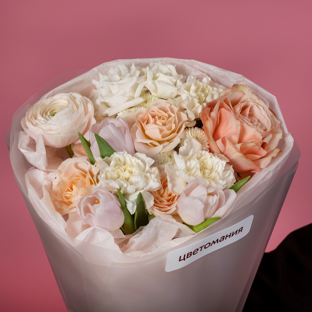 гвоздика 3, тюльпан 3, эустома 1, хризантема кустовая 1, ранункулюс 1, роза эквадор 50 см премиум 1, роза кустовая 1, упаковка, лента