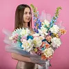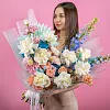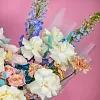 дельфиниум 2, роза французская 9, гортензия стабилизированная 2, ранункулюс 2, эустома 3, роза кустовая 3, гвоздика 5, пистач 7, лист пальмы 1, лагурус 10, упаковка, лентаКомплектация: