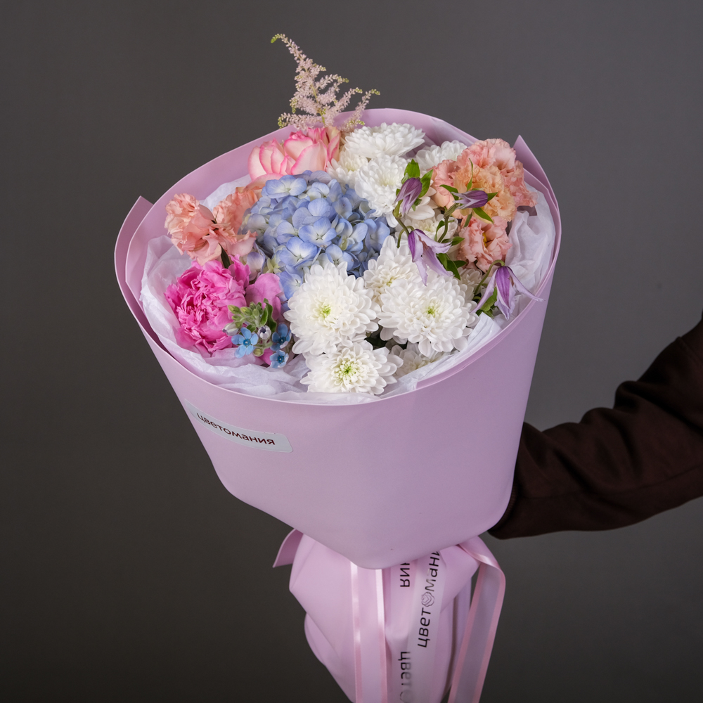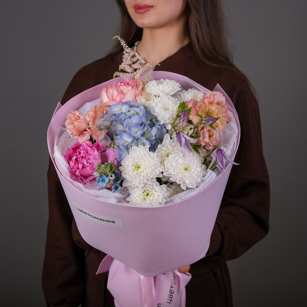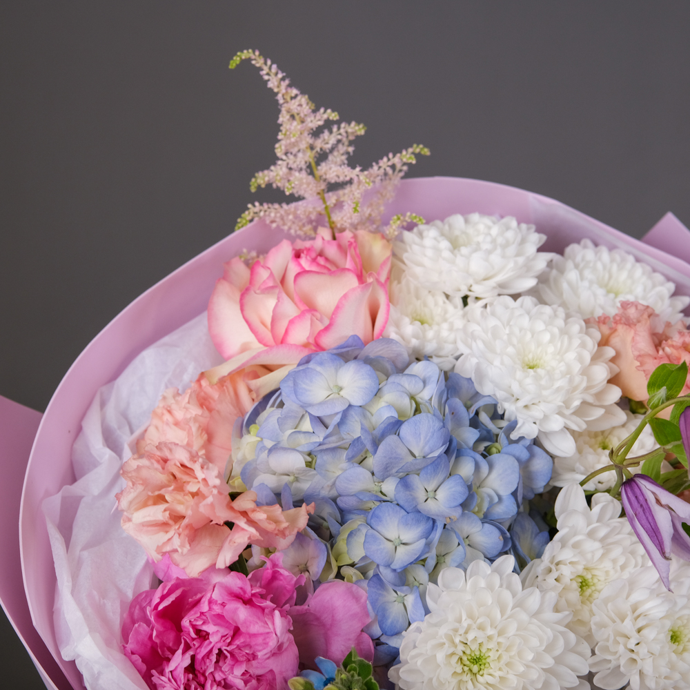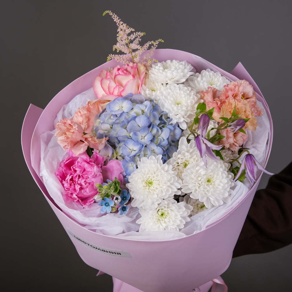 гортензия 1, пион 1, оксипиталум 1, роза французская 1, хризантема кустовая 2, клематис 1, эустома 2, пистач 2, астильба 1, упаковка, тишью, лента