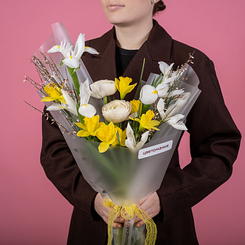Яркая и ароматная композиция из главных весенних цветов. Весенние букеты цветов не могут не радовать, ведь нежнее, трепетнее, красивее, чем первые цветы, появившиеся после зимней стужи, нет. Упаковка может незначительно отличаться.