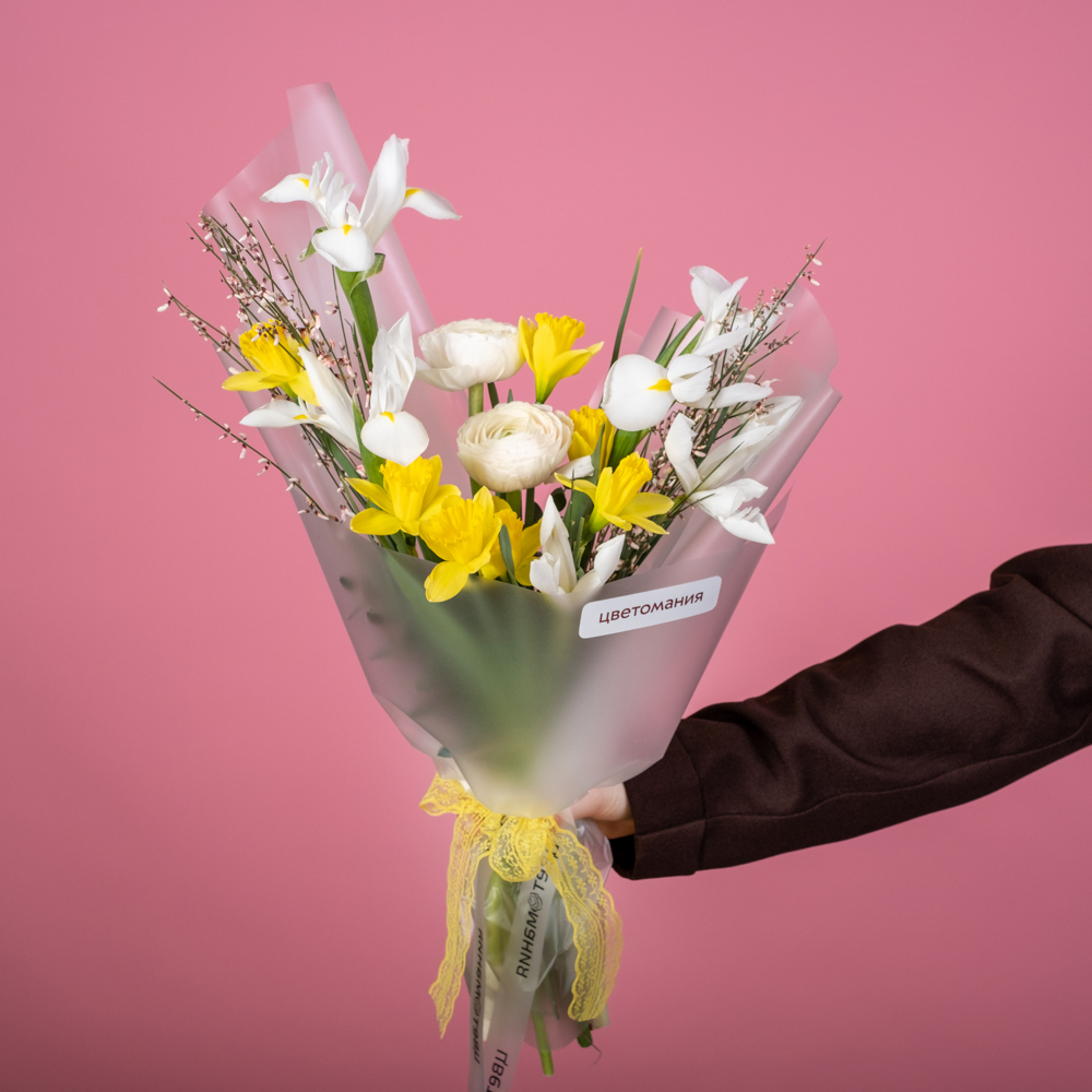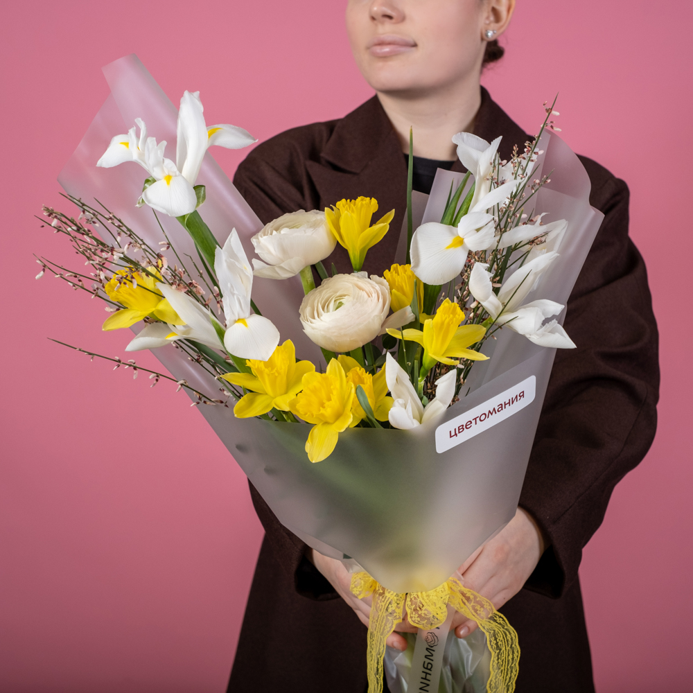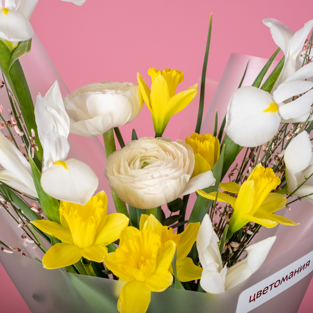 нарцисс 7, ирис 5, ранункулюс 2, гениста 2, эвкалипт 0,5, упаковка, лента