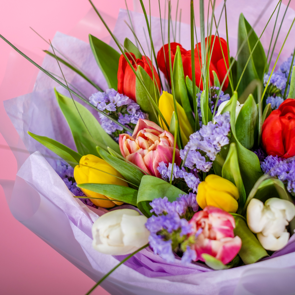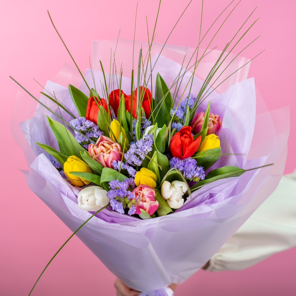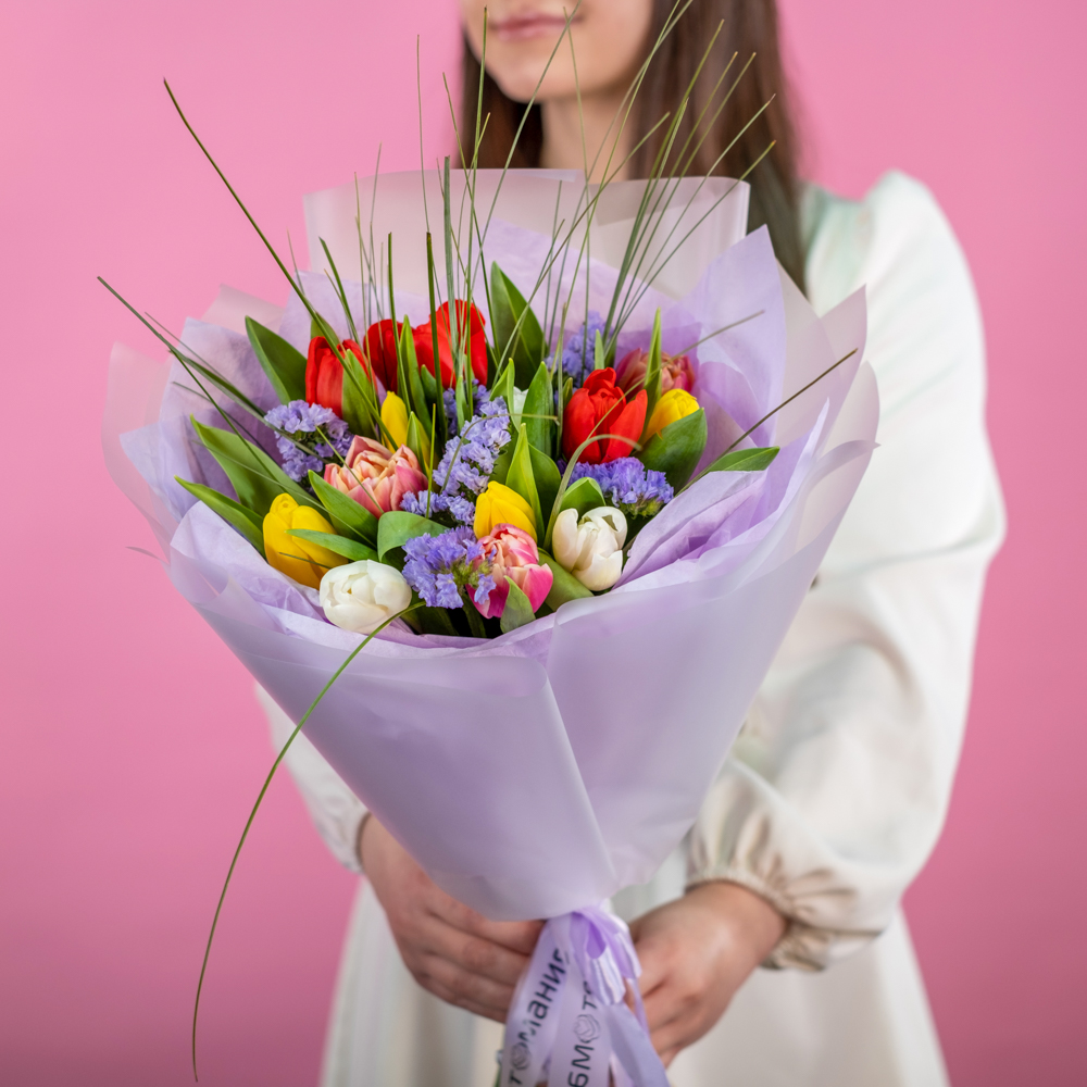 тюльпан микс 13, статица 2, берграсс 0,5, упаковка, лента, аквабокс, сумка