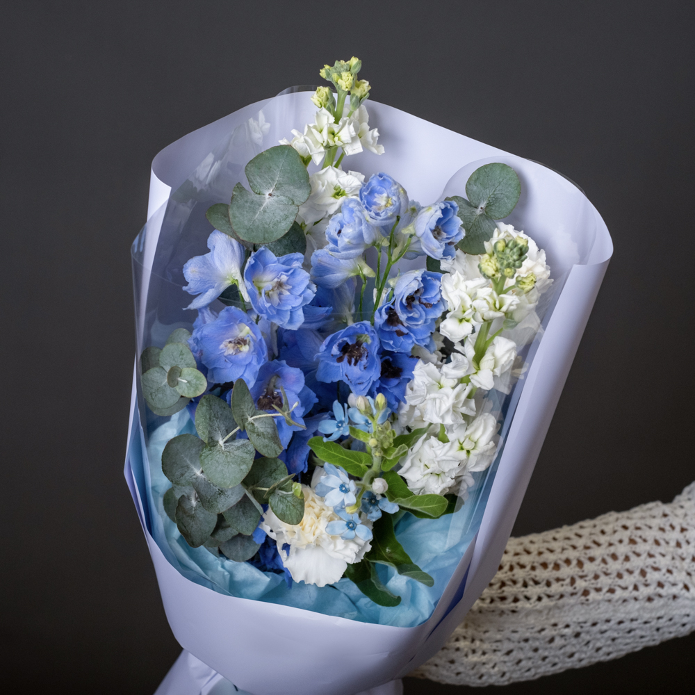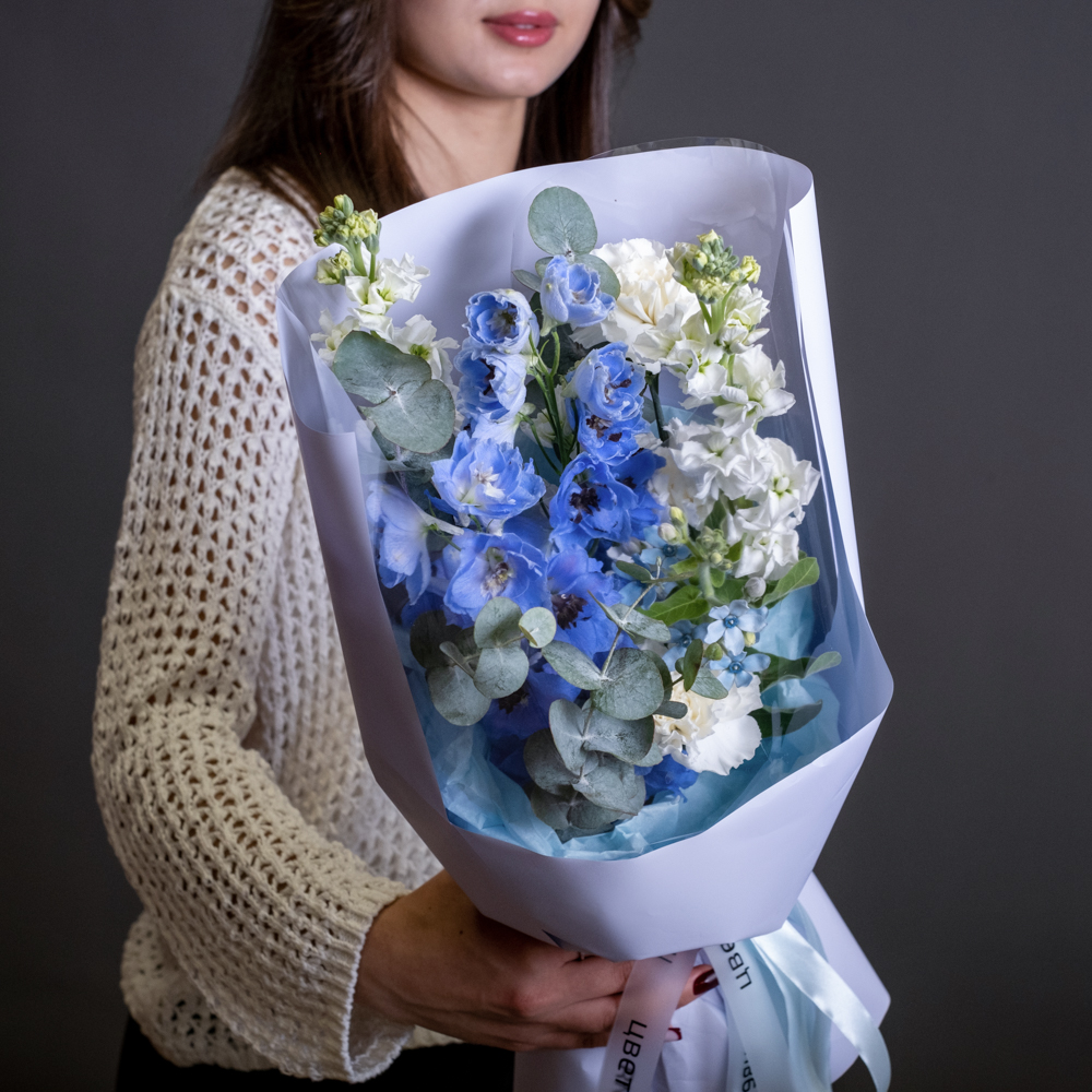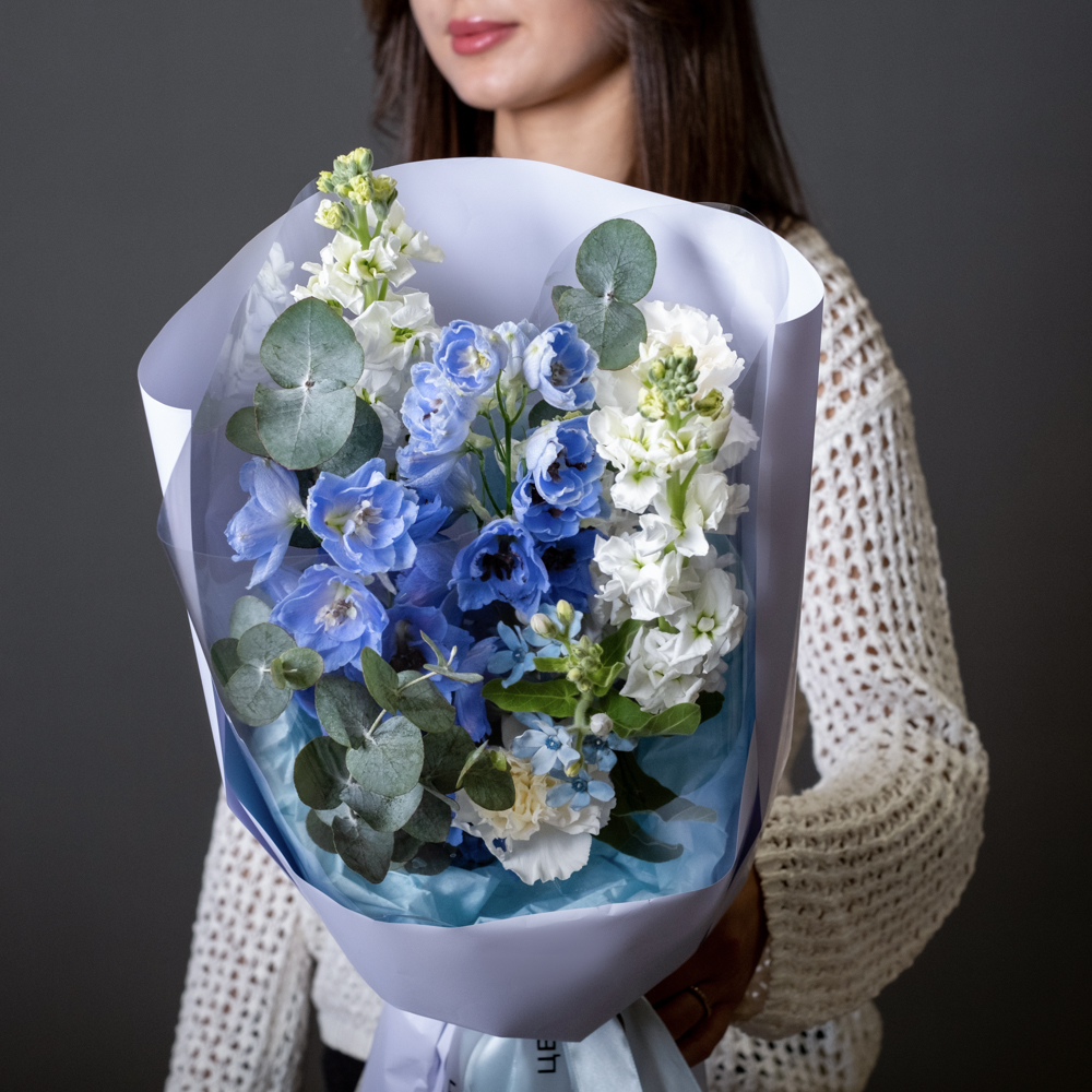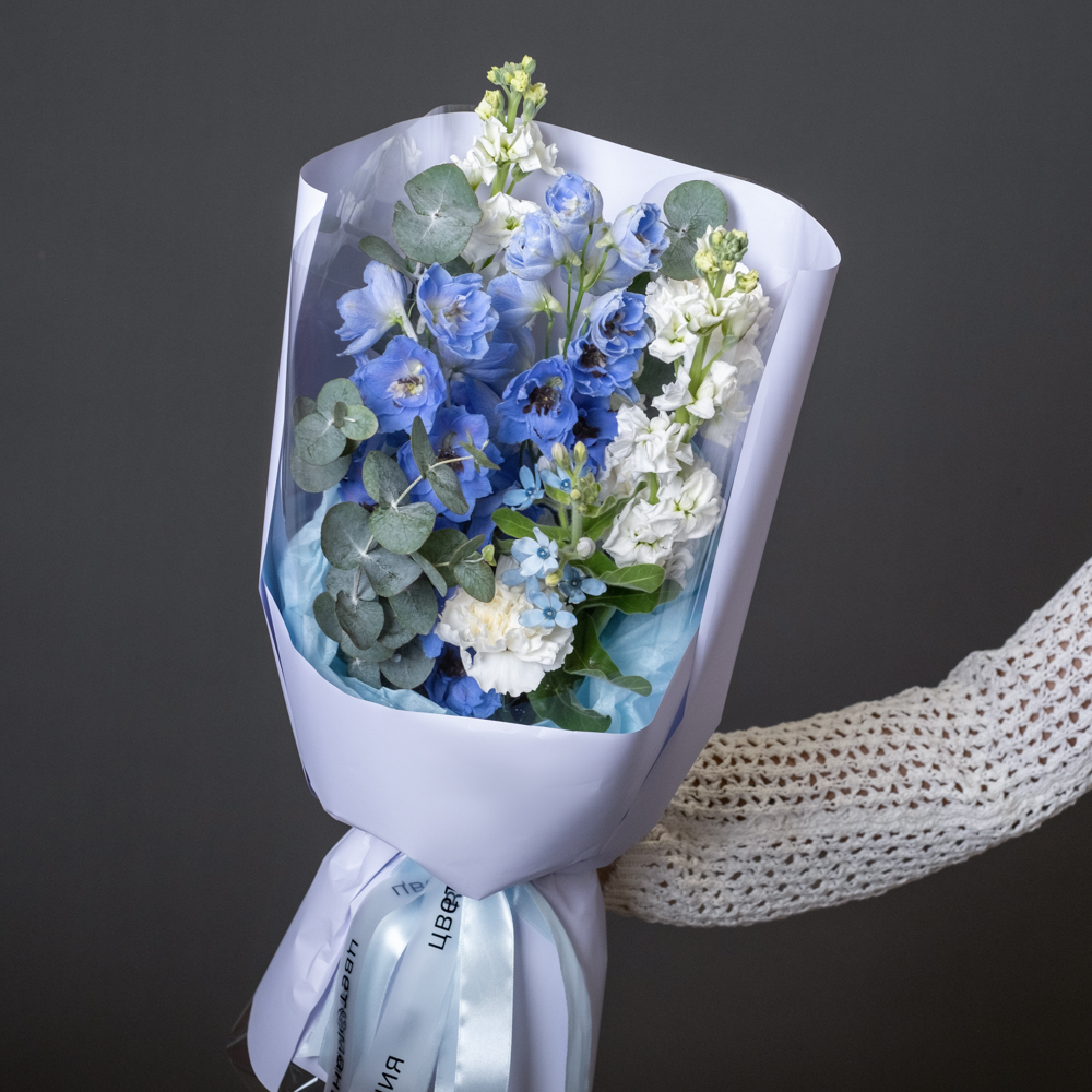 дельфиниум 2, маттиола 3, эвкалипт 1, оксипеталум 1, упаковка, лента