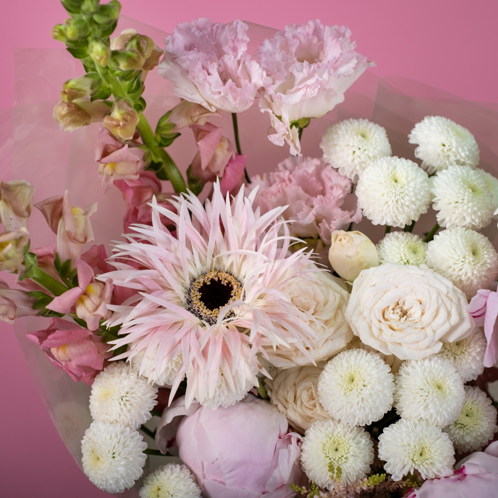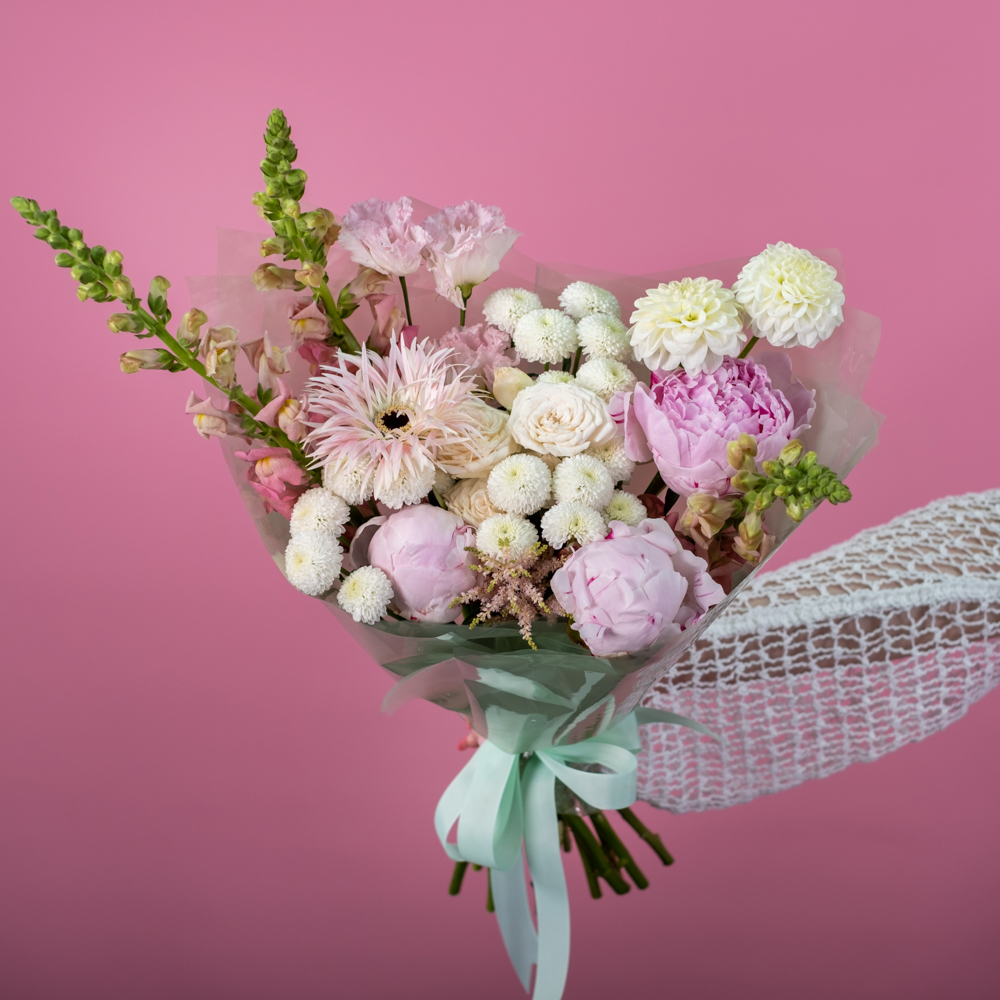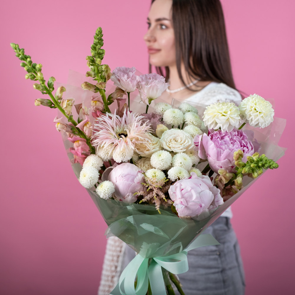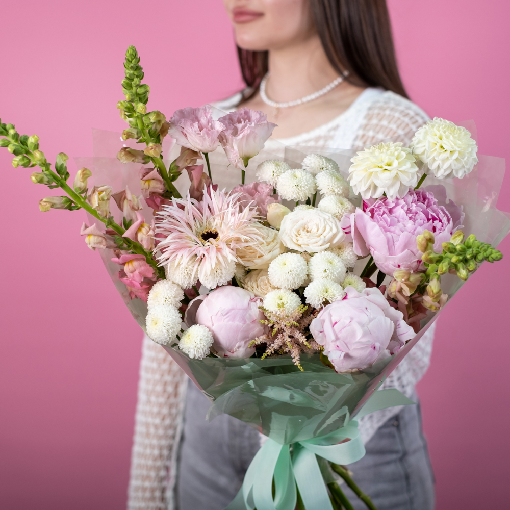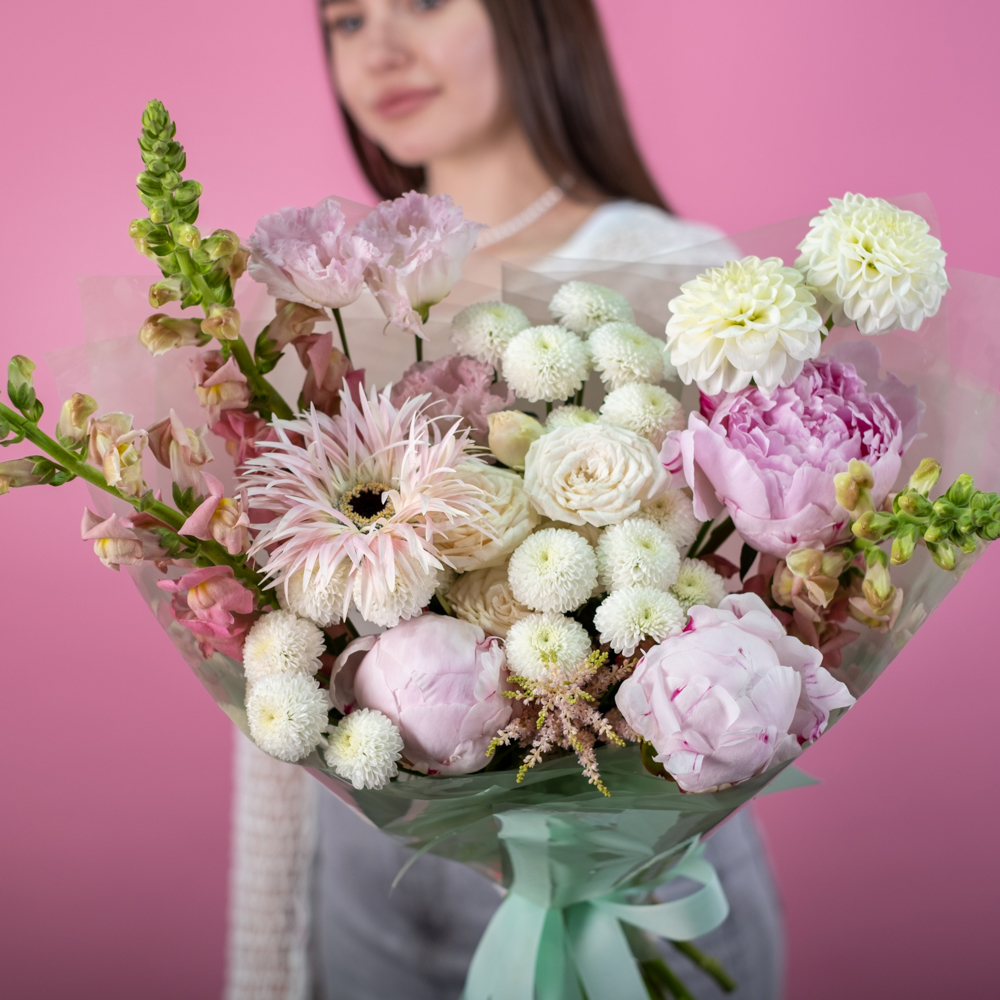 хризантема кустовая 3, георгин 2, антирринум 3, эустома 1, астильба 1, пион 3, кустовая роза 1, гербера 1, пистач 3, упаковка, лента