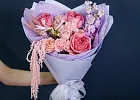 роза эквадор 50 см 3, нерине 1, маттиола 2, роза кустовая 2, гвоздика 3, пистач 3, сухоцвет, лагурус 5, упаковка, лента