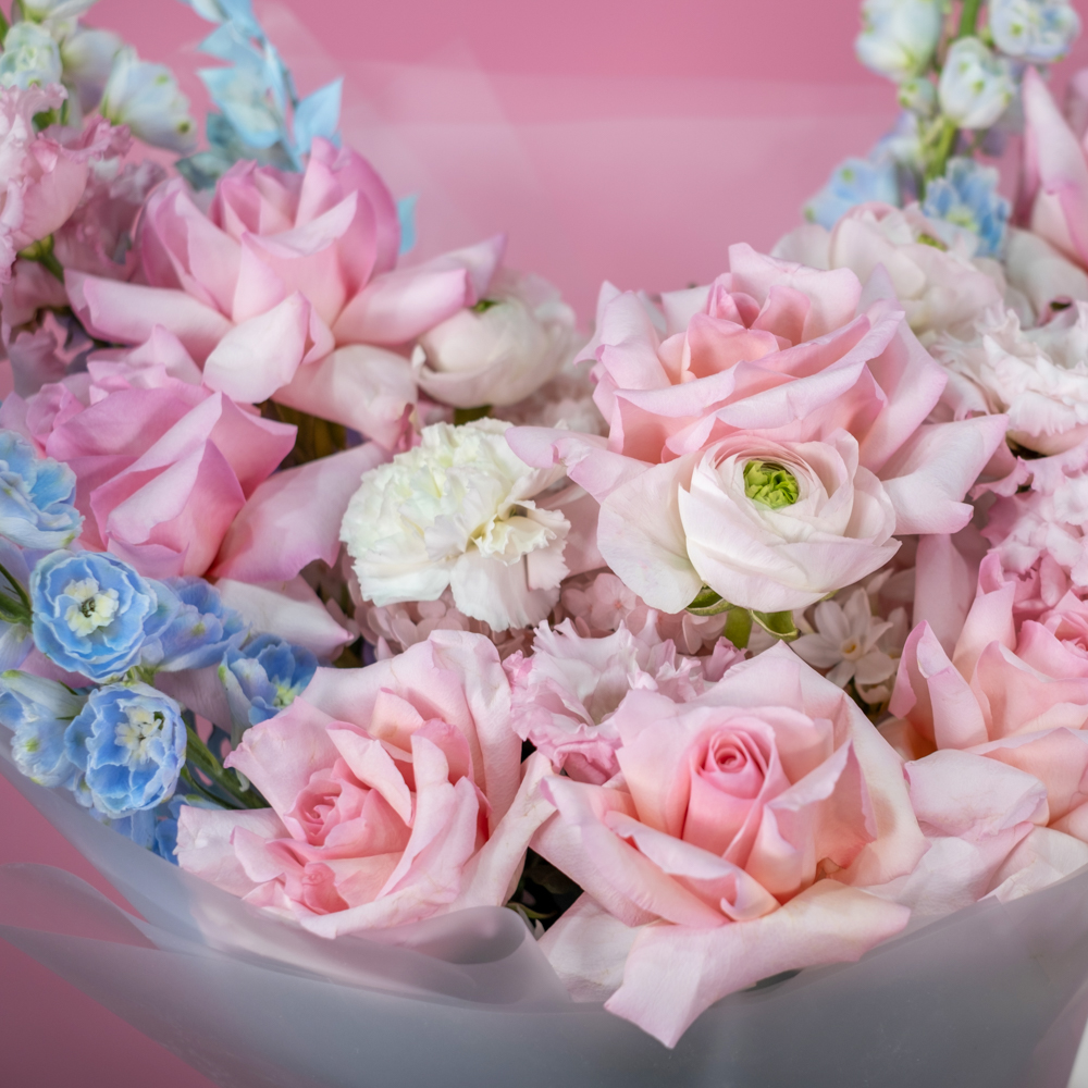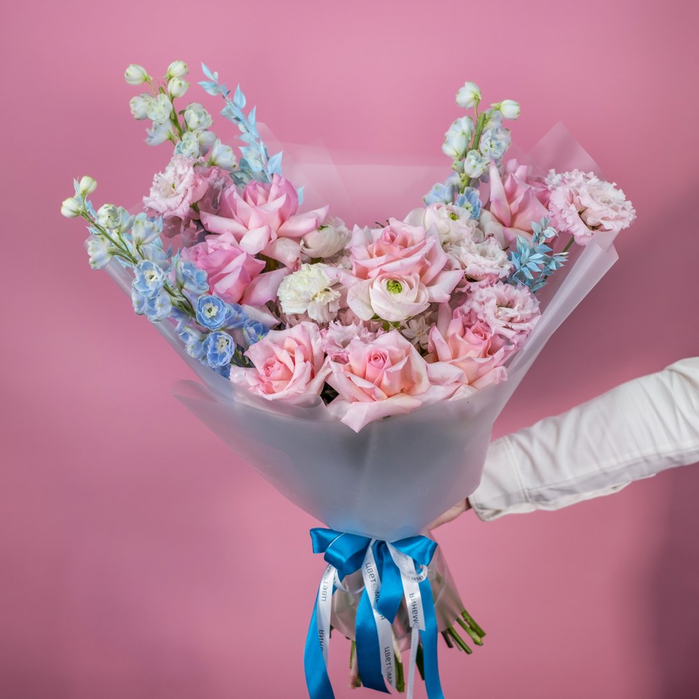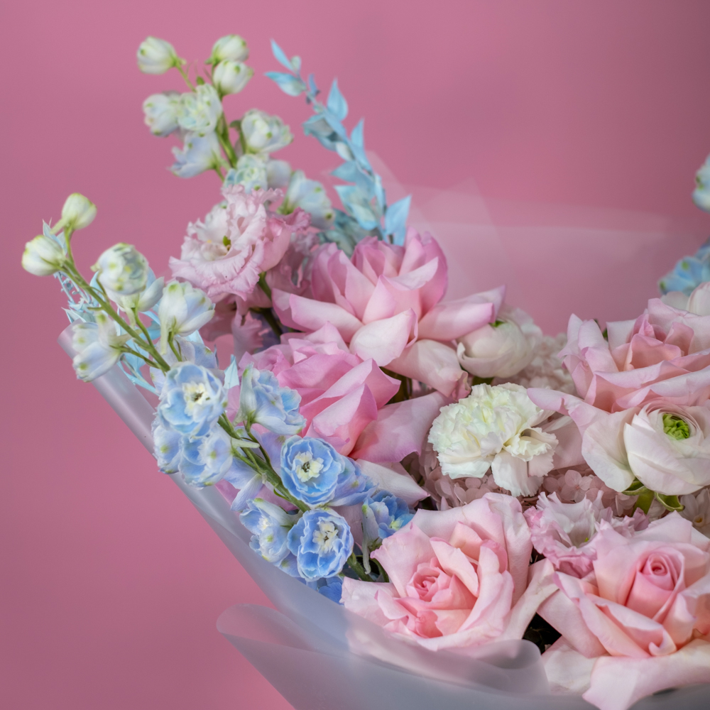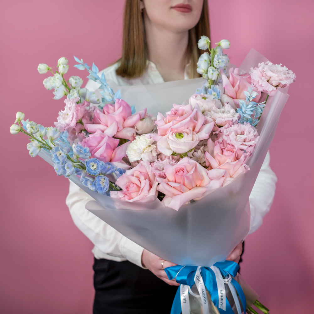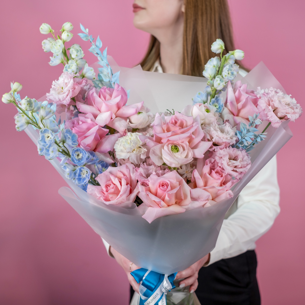 французская роза 7, дельфиниум 3, рускус декоративный 2, ранункулюс 3, гвоздика 3, эустома 3, гортензия стабилизированная 1, гипсофила 1 пистач 5, краска 0,3, упаковка, лента