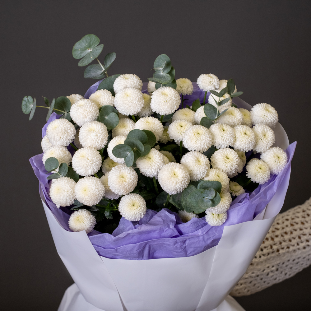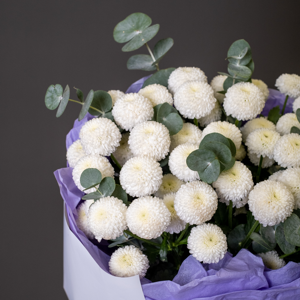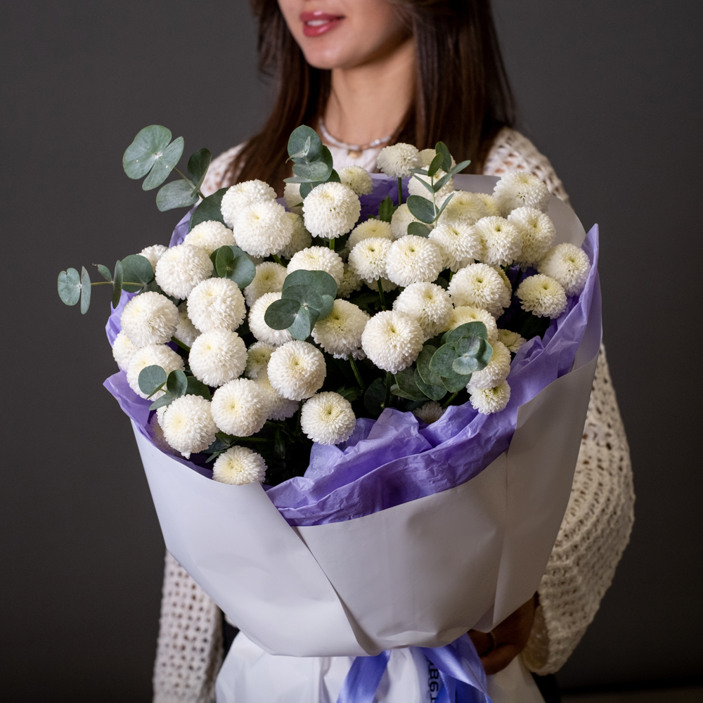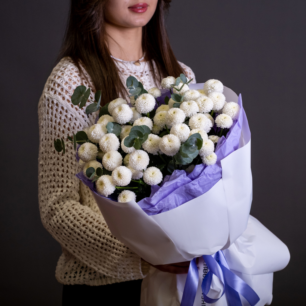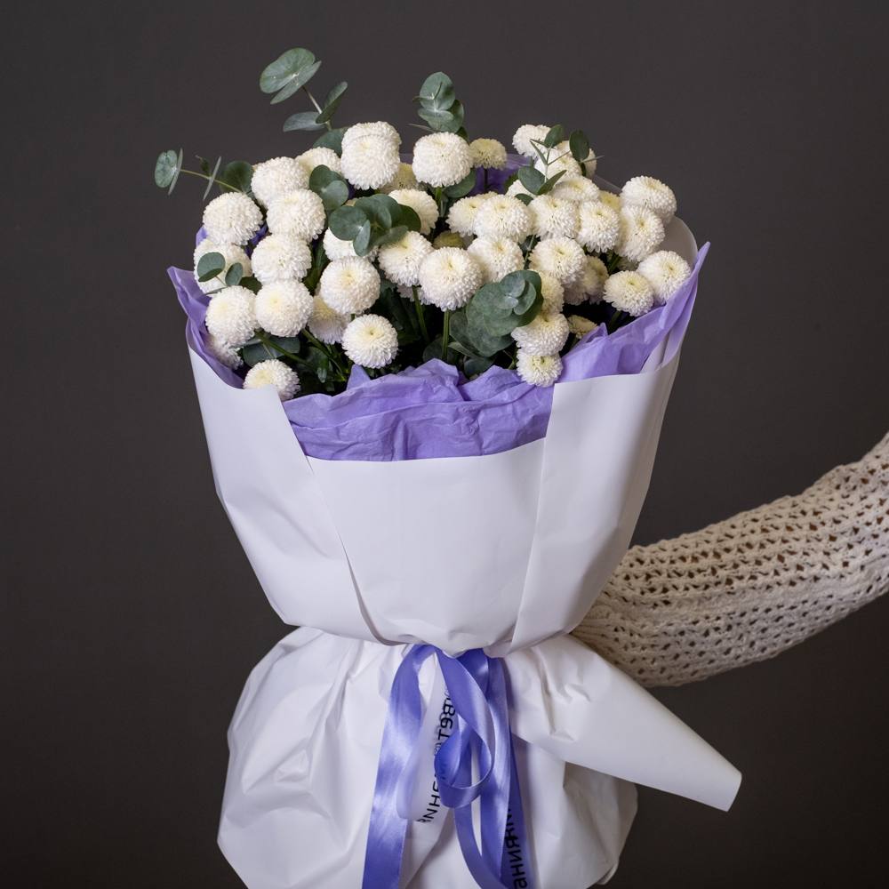 хризантема кустовая 7, эвкалипт 1, упаковка, лента