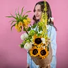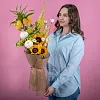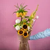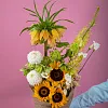 эустома 1, подсолнух 3, пистач 1, вибурнум 1, хризантема стандарт 2, эремурус 2, фаларис 20, фритиллярия 1, хелеборус 1, упаковка, лентаКомплектация:
