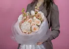 пион 3, маттиола 2, роза кустовая 2, тюльпан 3, пистач 2, упаковка