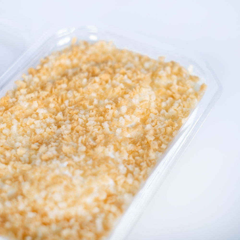 Лёгкий, воздушный бисквит. Нежный крем, по вкусу напоминающий мороженое "Пломбир". Десерт украшен сверху вафельной крошкой.