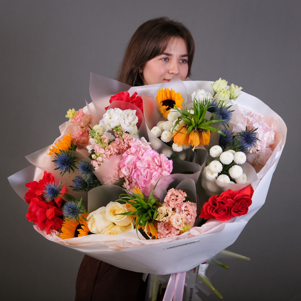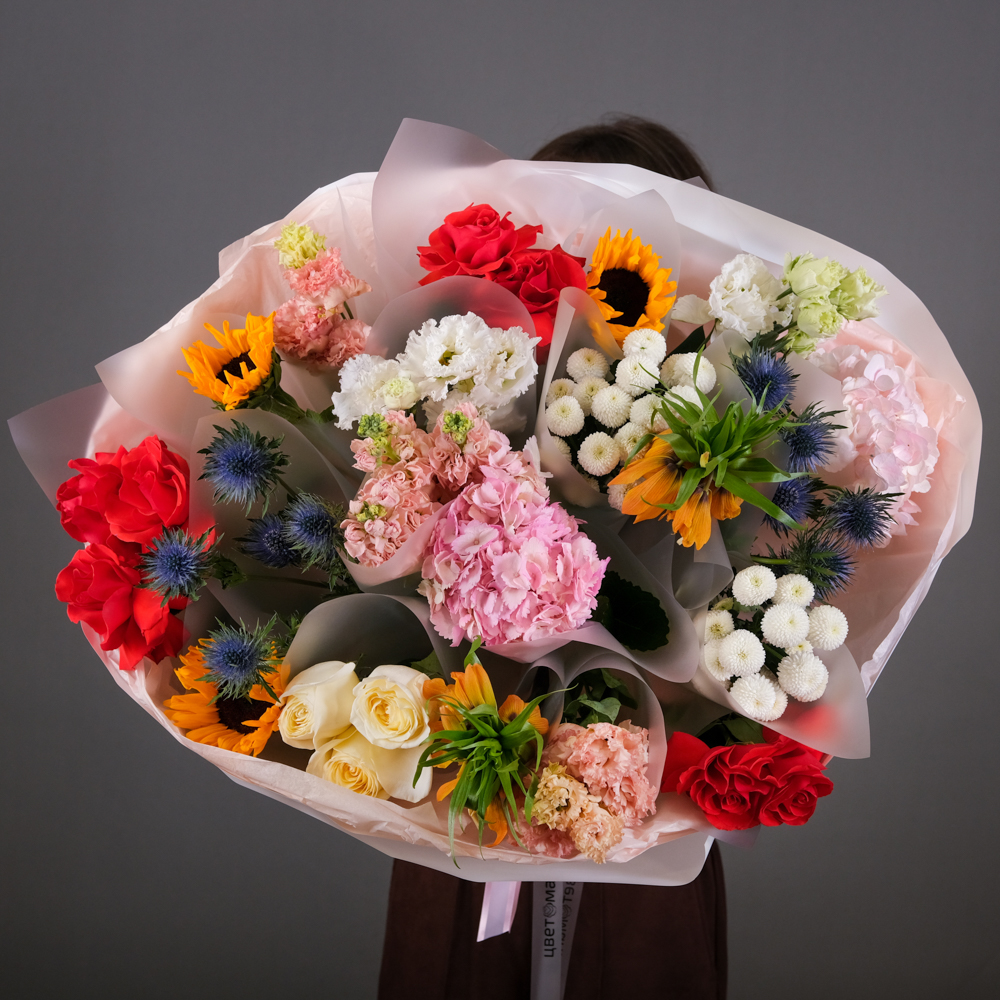 французская роза 10, подсолнух 3, эрингиум 3, фритиллярия 2, хризантема кустовая 3, эустома 7, маттиола 3, гортензия 2, упаковка, лента