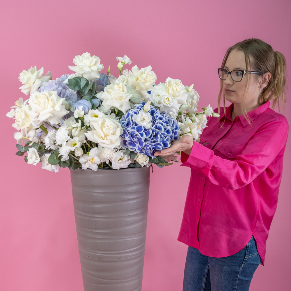 Цвет и состав композиции могут быть изменены по Вашему желанию. Высота вместе с кашпо - 110 см, диаметр букета - 80 см.