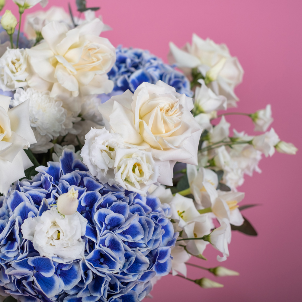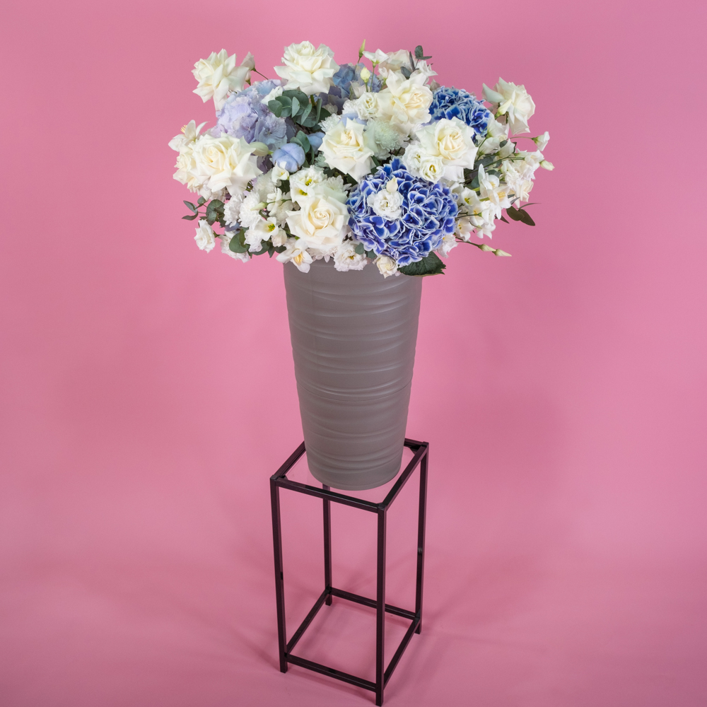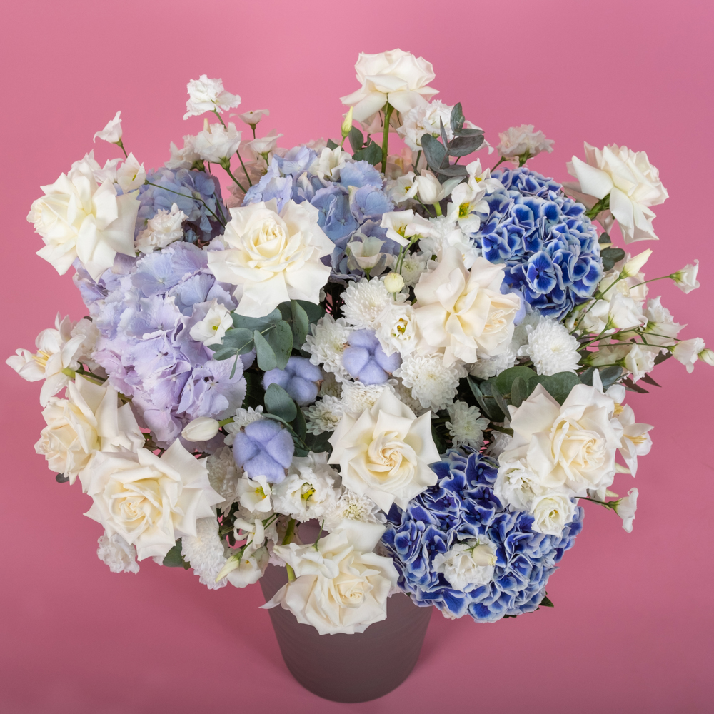 гортензия 5, эустома 20, хризантема кустовая 10, французская роза 13, тюльпан 13, эвкалипт 5, хлопок 10, оазис, кашпо