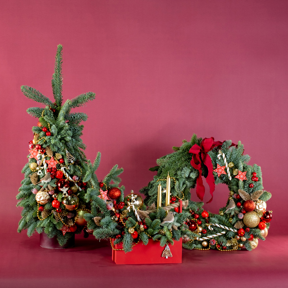 В коллекцию №1 входят следующие композиции: 1. Венок "Снежное царство", 2. Ёлка "Зимняя симфония", 3. Композиция "Рождественская песня". Состав композиций: нобилис, ёлочные украшения, оазис, ленты