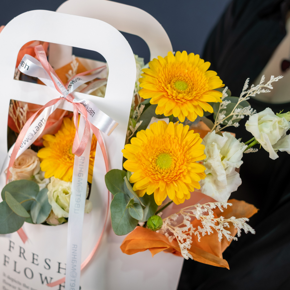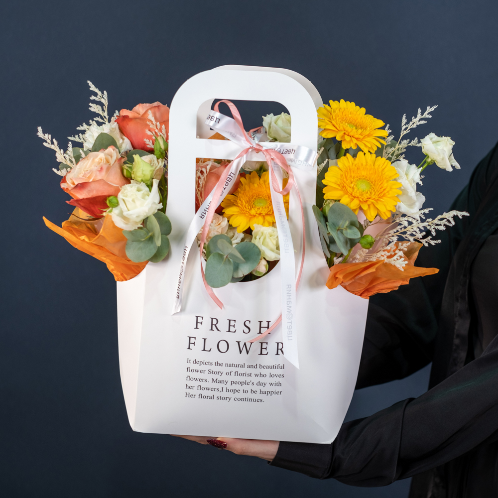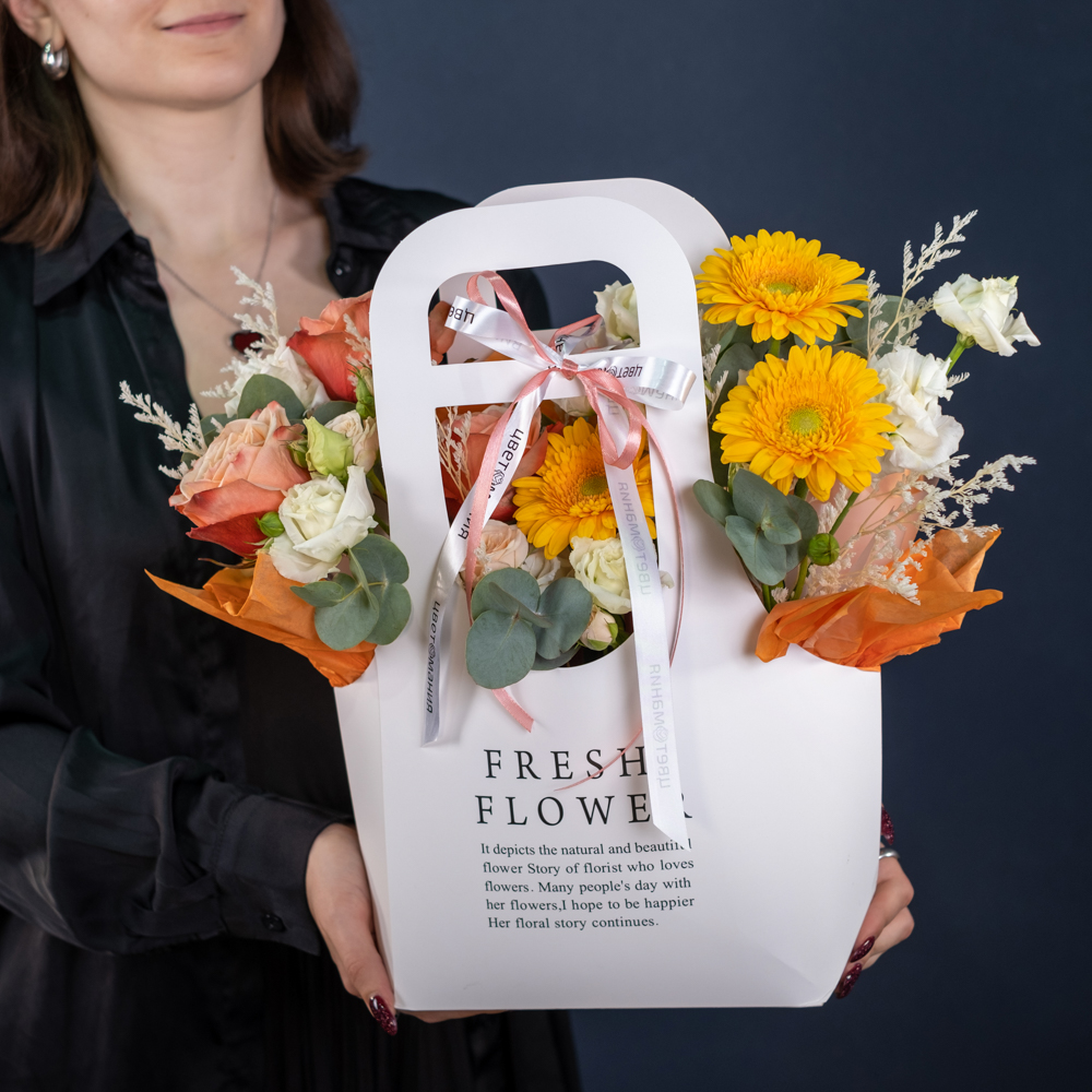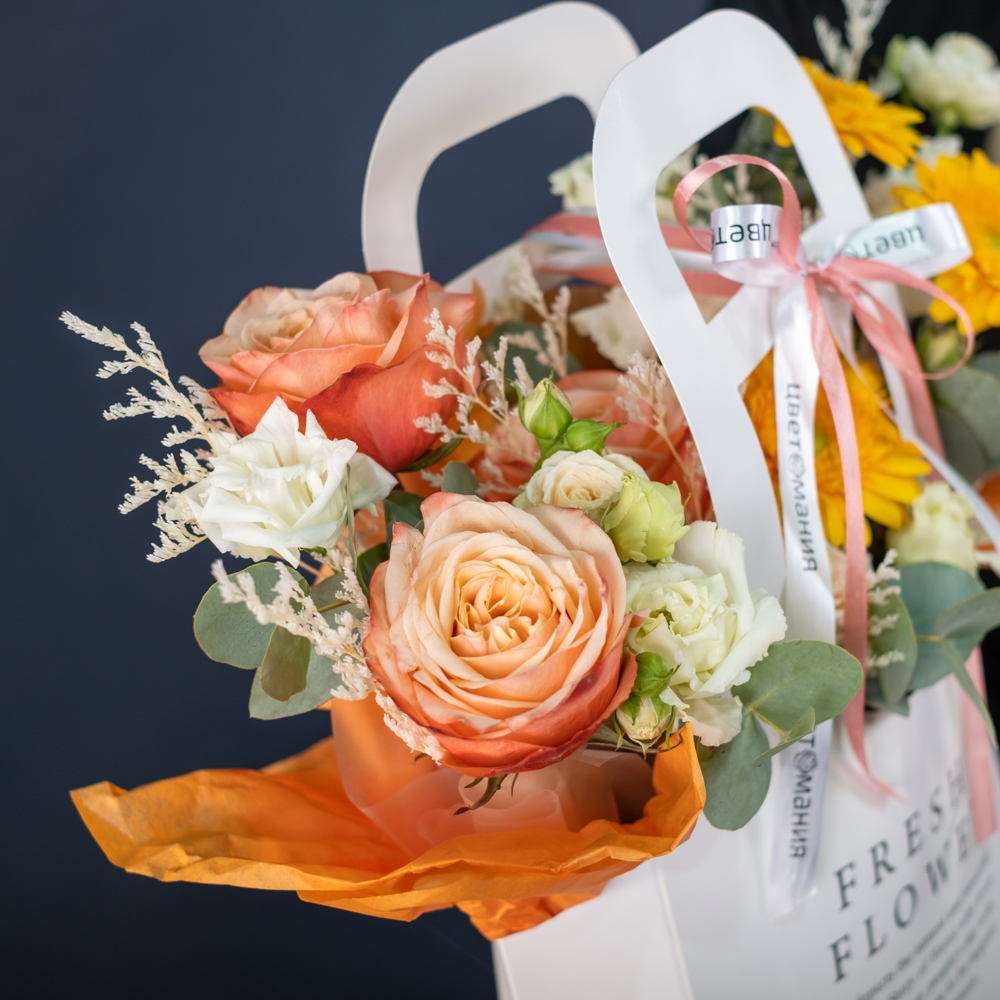 роза эквадор 50 см 3, гербера мини 3, эвкалипт цинерея 1, лимониум сухоцвет (белый) - 0,5, эустома 2, тишью, лента, сумочка, оазис 2