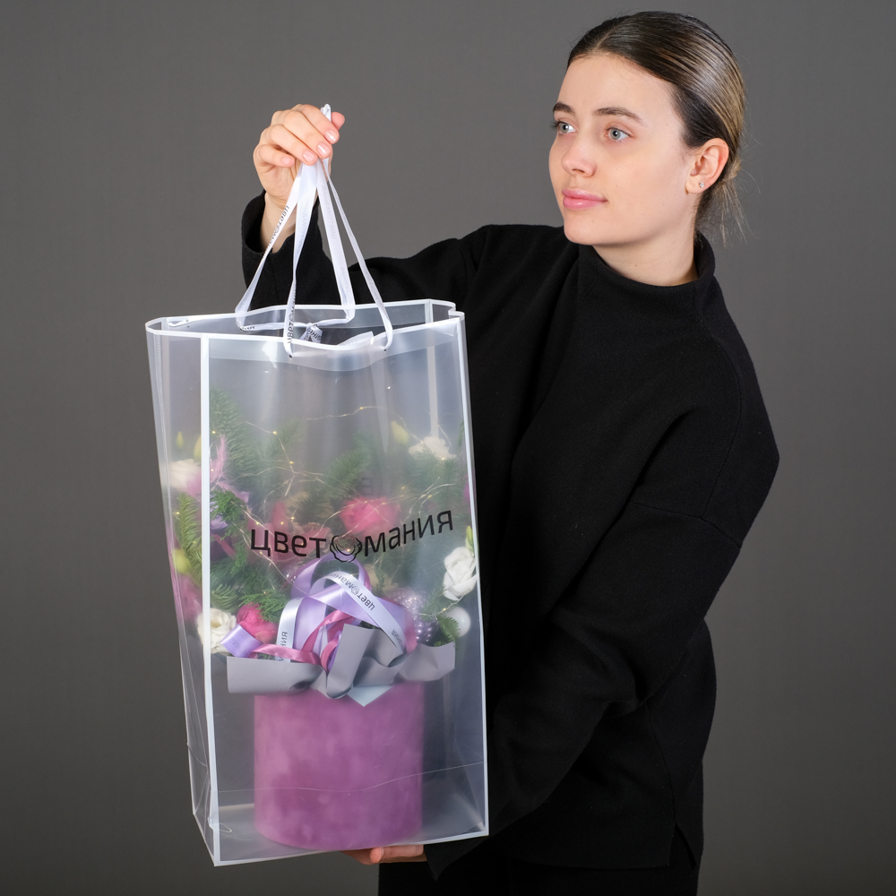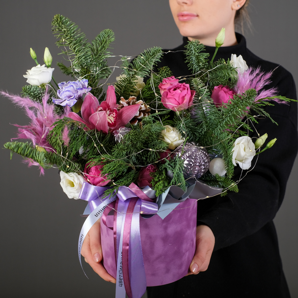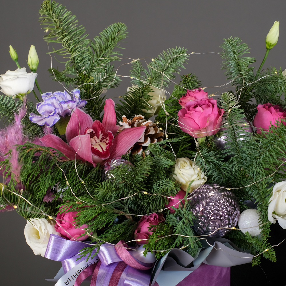 орхидея цимбидиум 1, эустома 1, роза кустовая 1, гвоздика стандарт 1, краска 0,1, можжевельник 0,2, нобилис 0,2, гирлянда роса 1, шар средний 1, шар маленький 3, ковыль 0,2, шишка 1, коробка, оазис, лента, сумочка