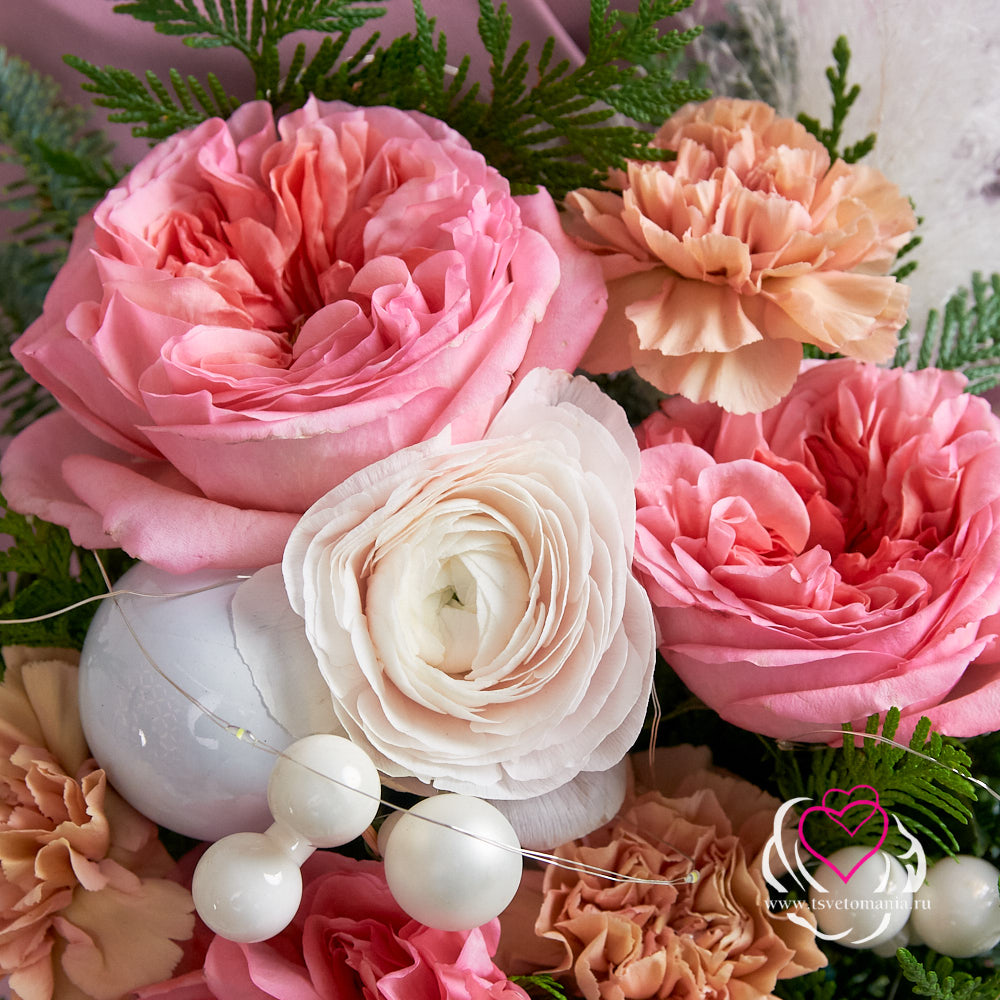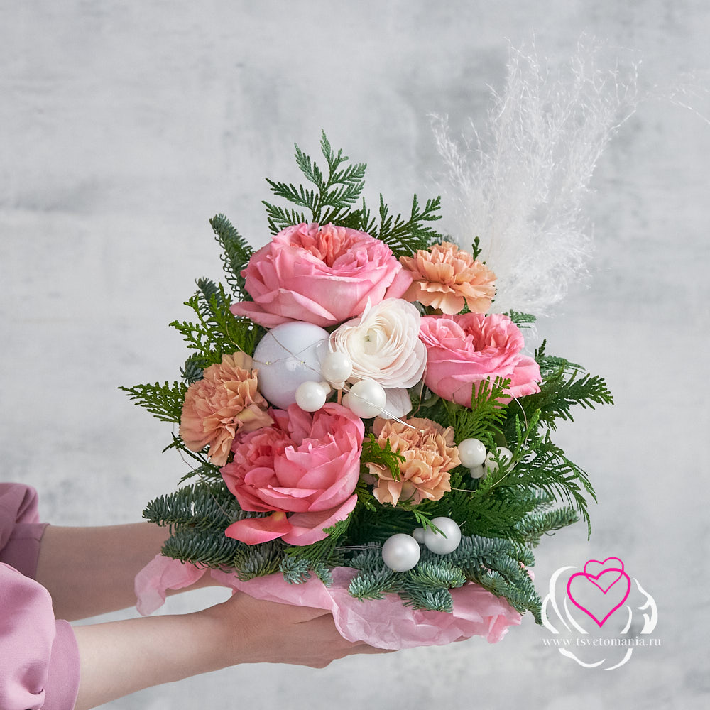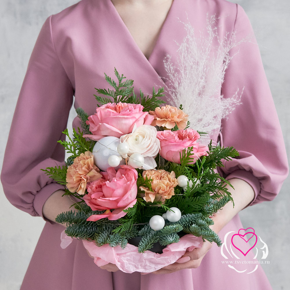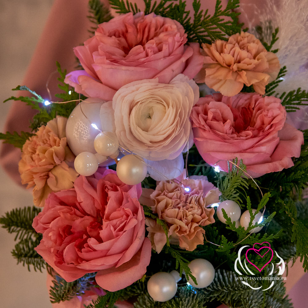 Состав композиции: оазис 1, тишью, светящаяся гирлянда, шарик 13, гвоздика голландия 3, нобилис 1, подарочный пакет, пампас 0.5, ранункулюс 1, роза эквадор 50см 3, туя 0.5