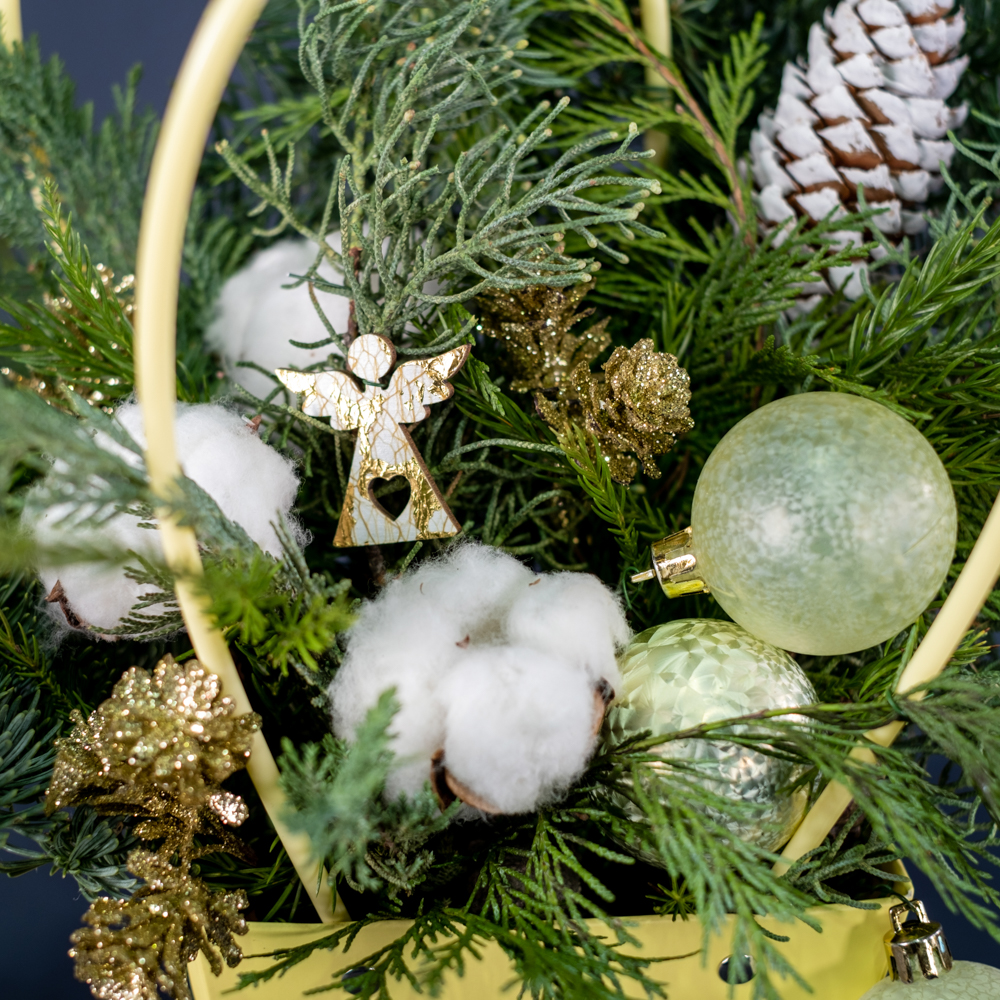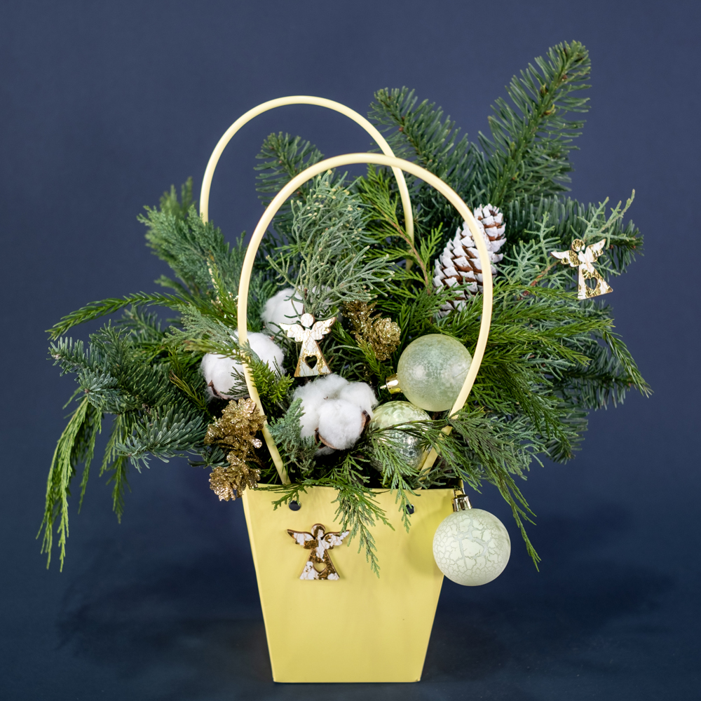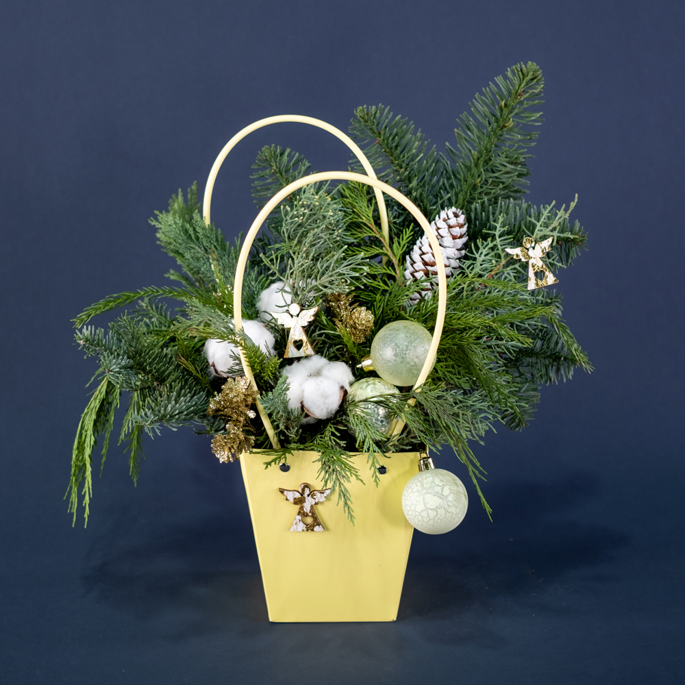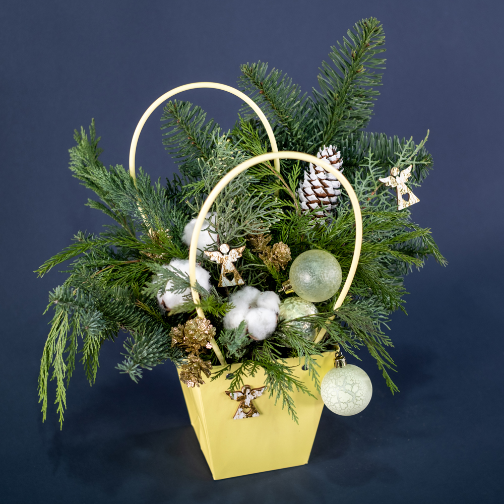 Нобилис, флористическая сумка, ёлочные игрушки, сухоцвет хлопок, туя, можжевельник, криптомерия, шишки