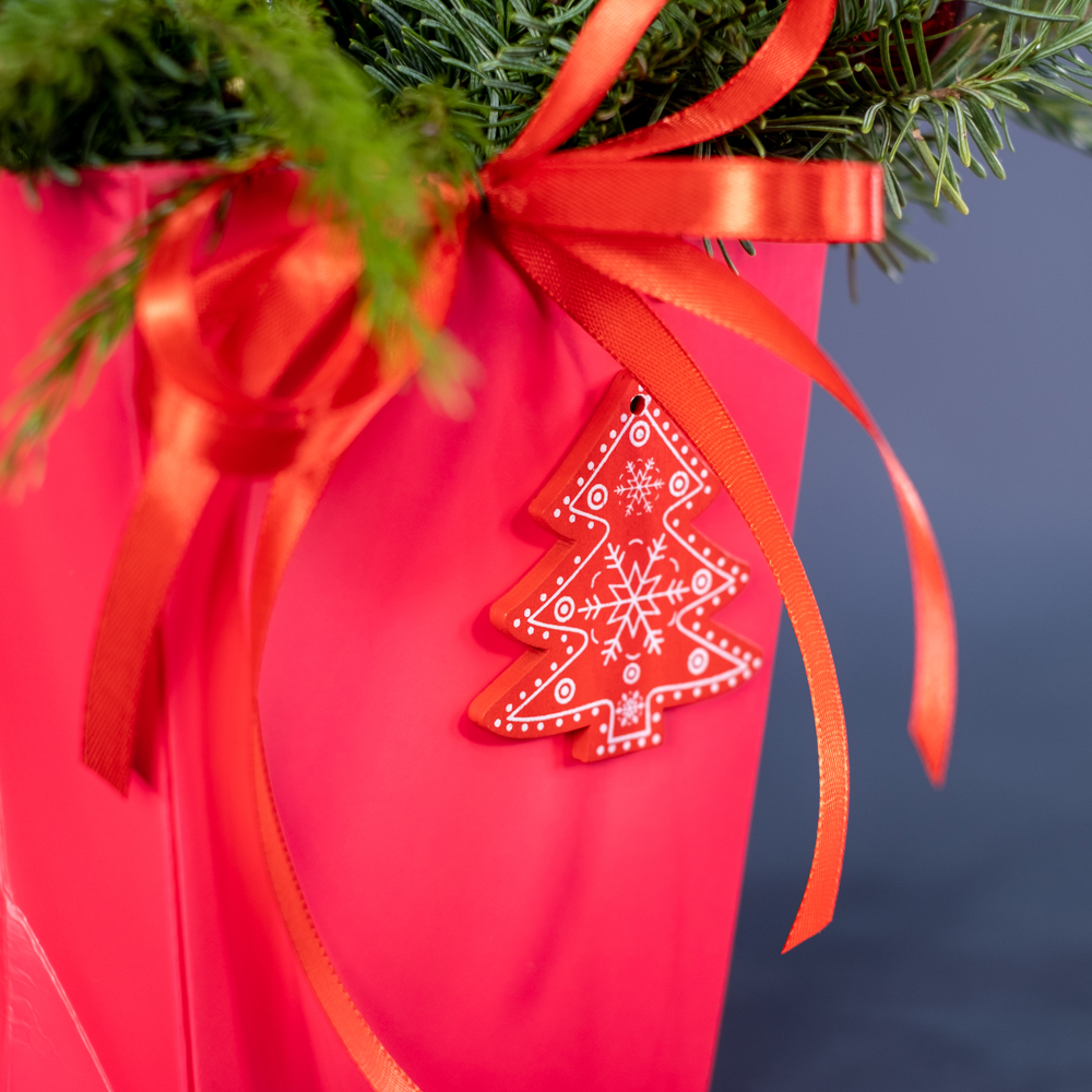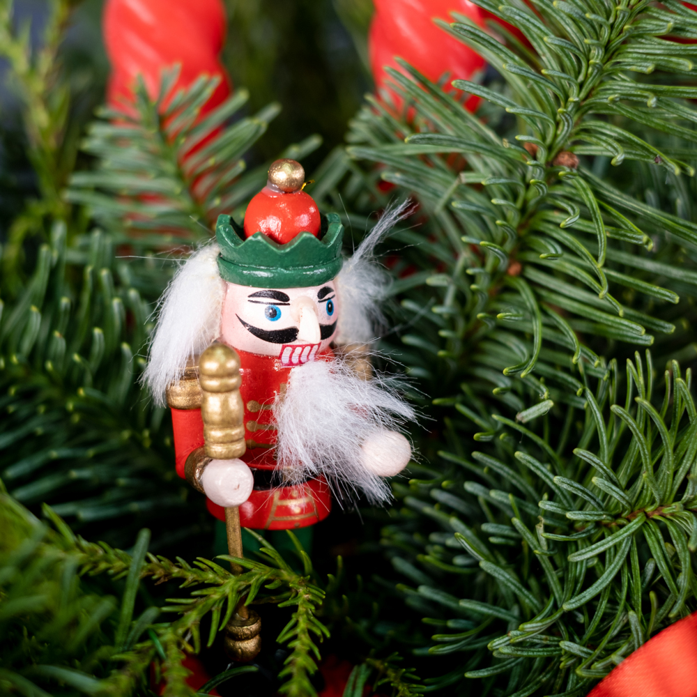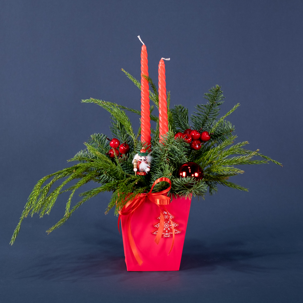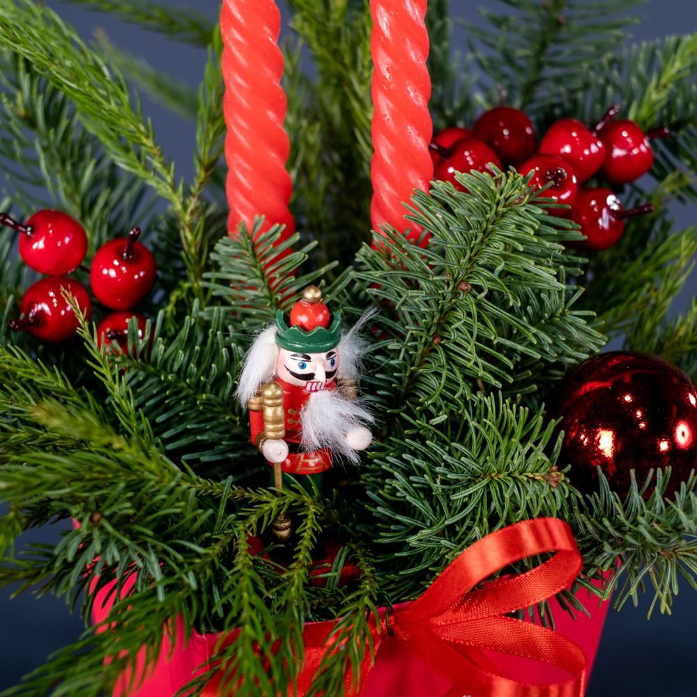Состав композиции: нобилис, криптомерия, ёлочные украшения, фигурка Щелкунчик, оазис, сумочка флористическая, тишью