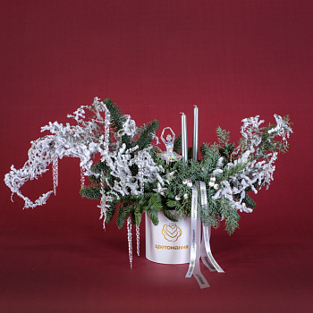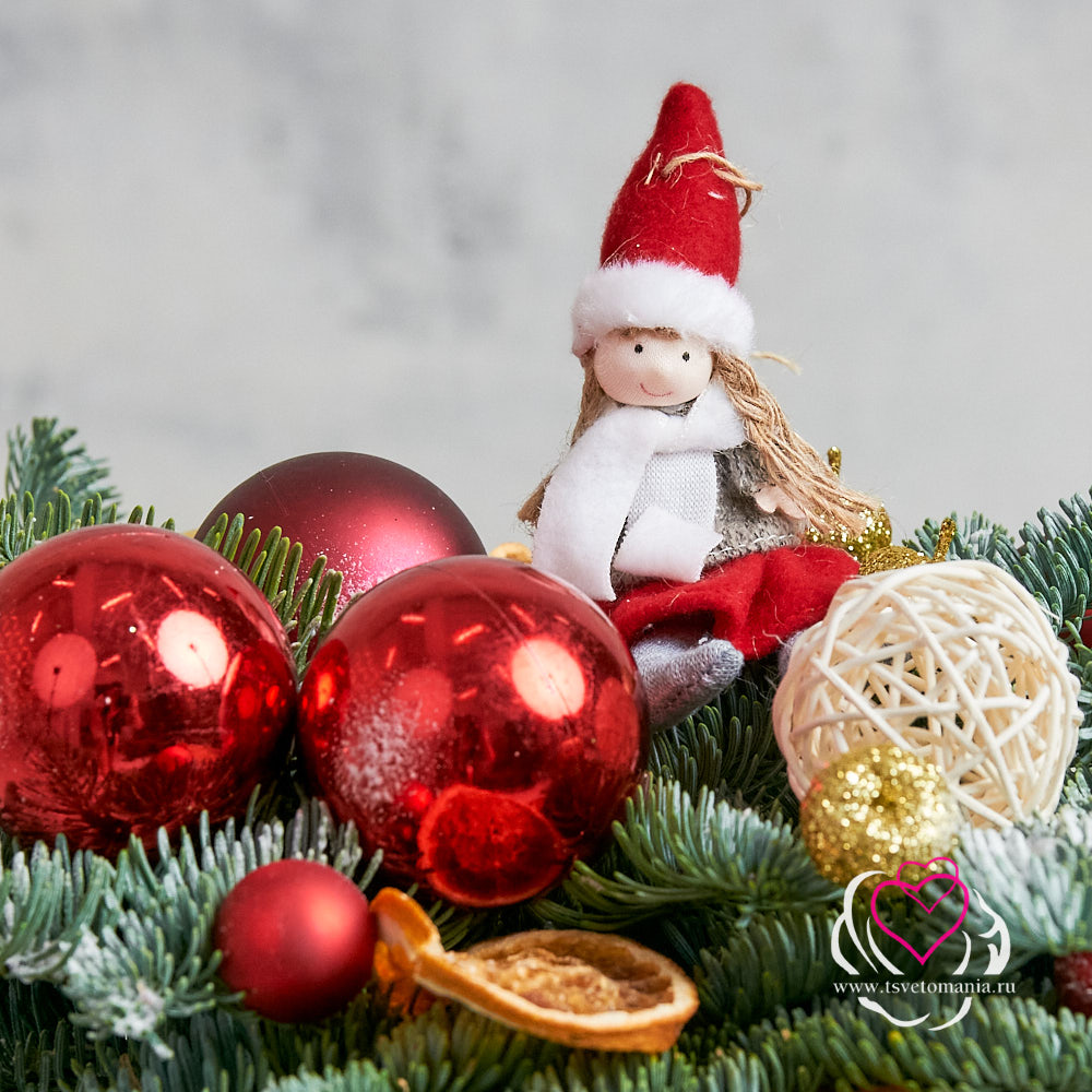 Состав композиции: игрушка лист, шар, девочка, шарик, нобилис 2, снег-спрей, апельсин, ягоды