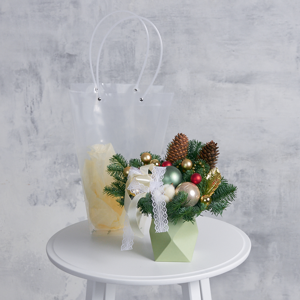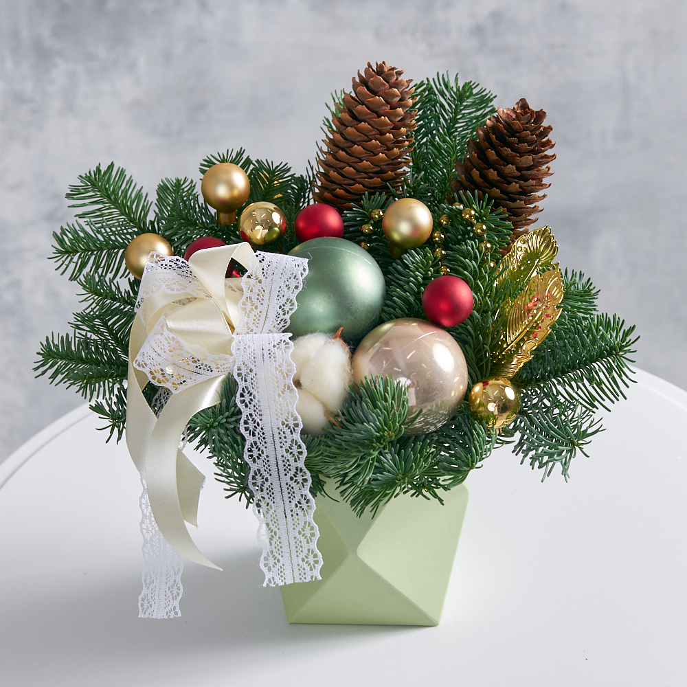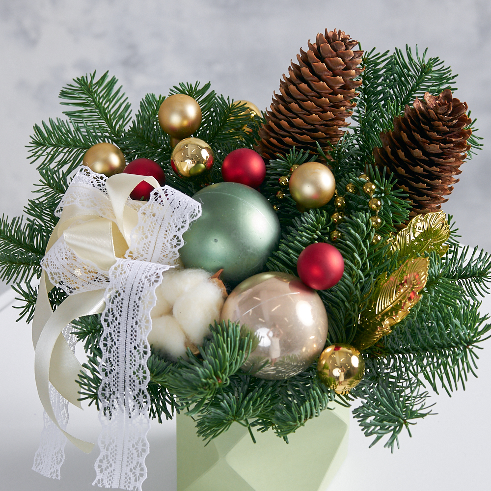 нобилис 1, хлопок 1, игрушки: листья 2, шар 2, шарик 8, шишки 2; оазис, ленты, коробка, прозрачная сумка