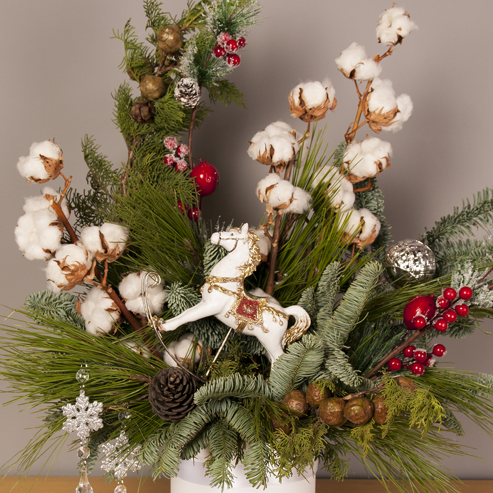 нобилис -1, кипарис -1, сосна -1, ветка заснеженная -2, шар пластик 80 -2, лошадка-качалка -1, подвеска снежинка -2, хлопок -19, коробка, оазис -2