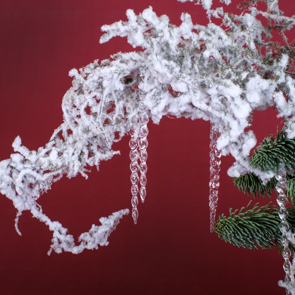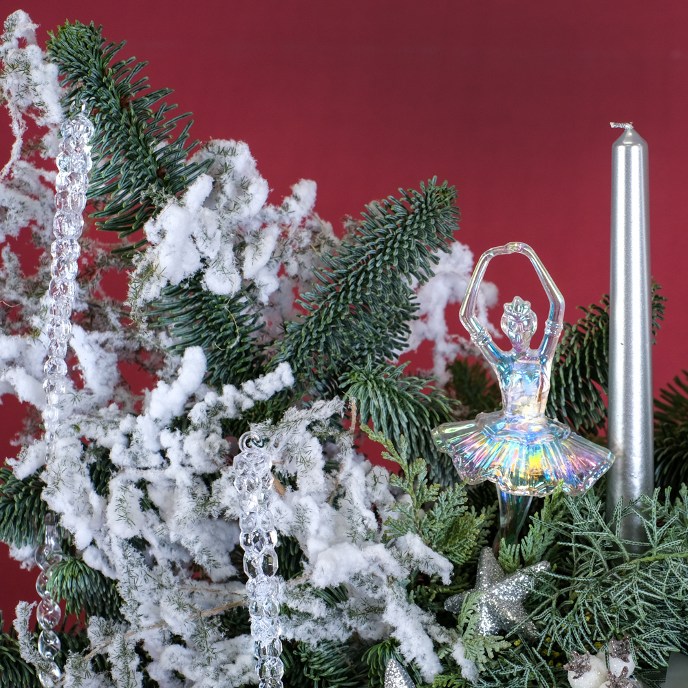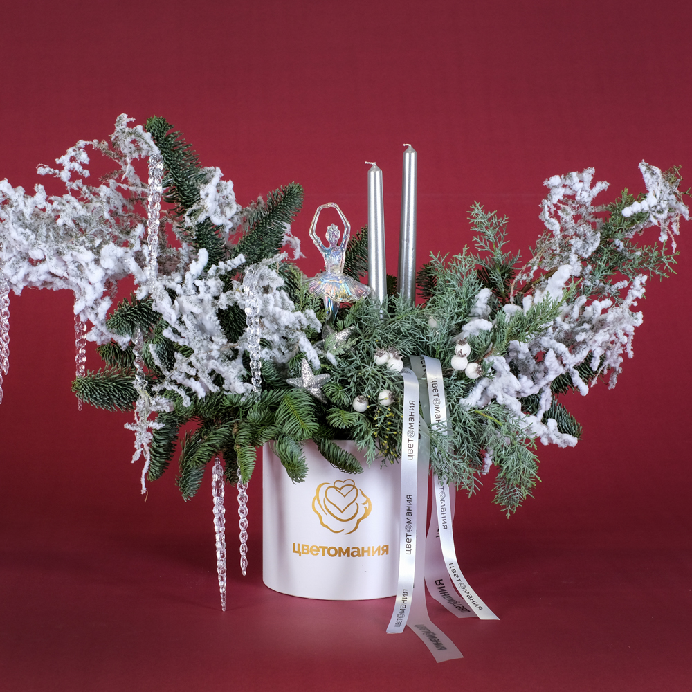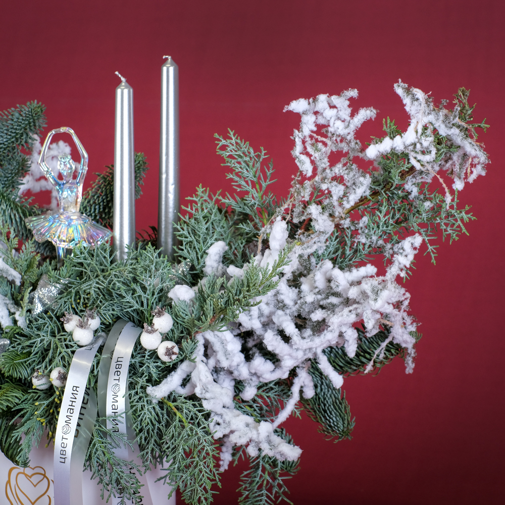 кипарис 1, нобилис 1,5, звезда на вставке 3, ягоды на проволоке 10, аспарагус заснеженный 1, сосульки 8, балерина 1, свеча 2, коробка шляпная 1, лента, оазис 3