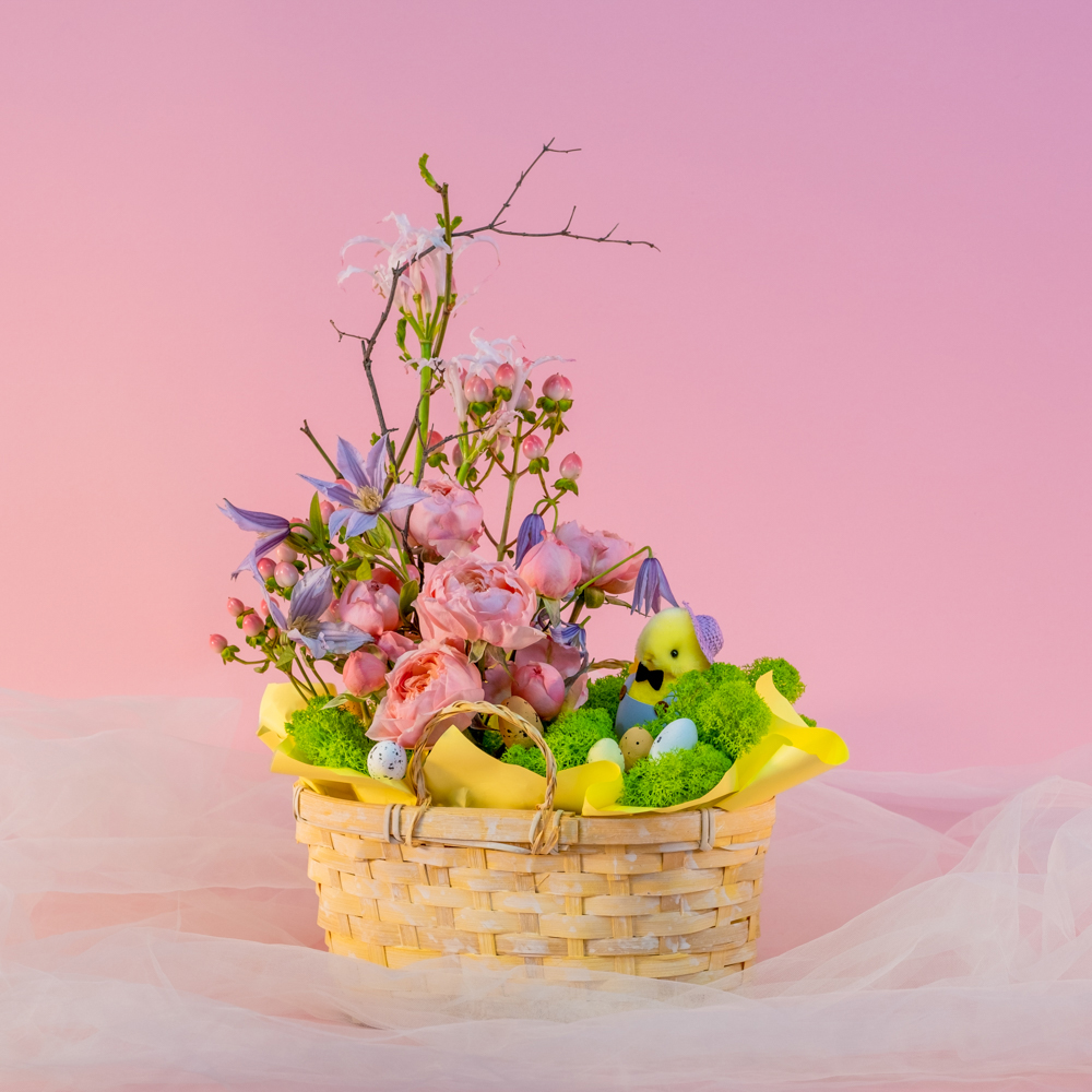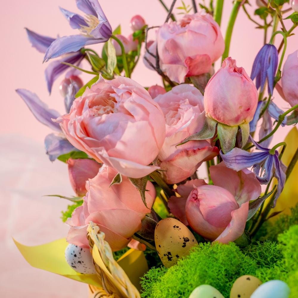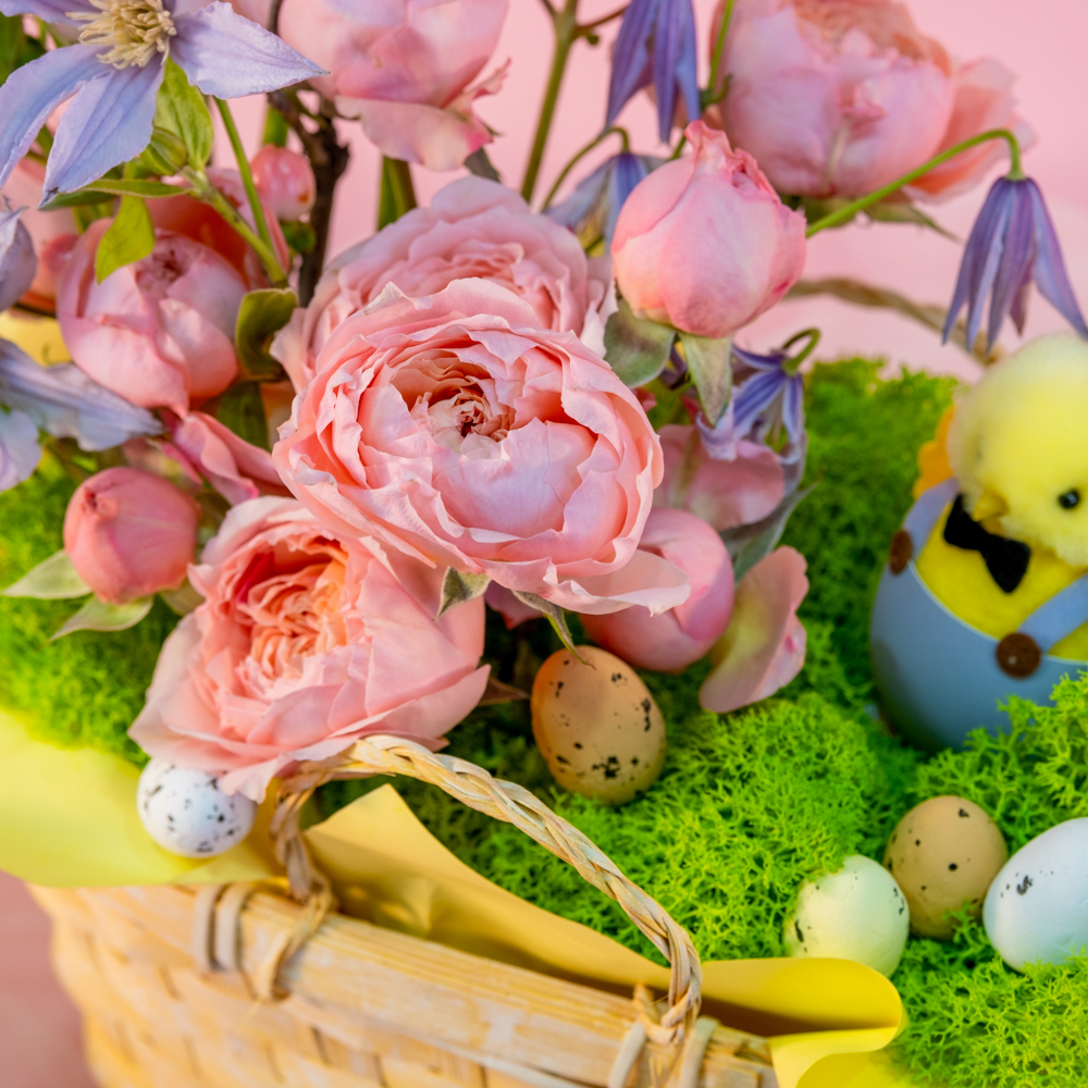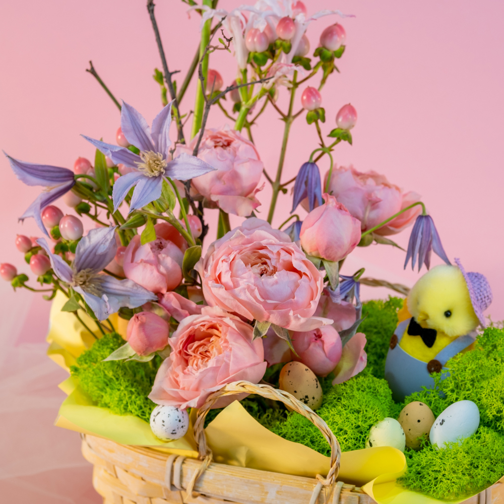 роза кустовая Джульетта - 2, клематис - 2, нерине - 2, цыпленок в скорлупе - 1, яйцо набор 12шт. - 2, яйцо набор 36шт - 4, сухоцветы мох - 0,1, гиперикум - 2, ветка персика 1, оазис - 2, корзина