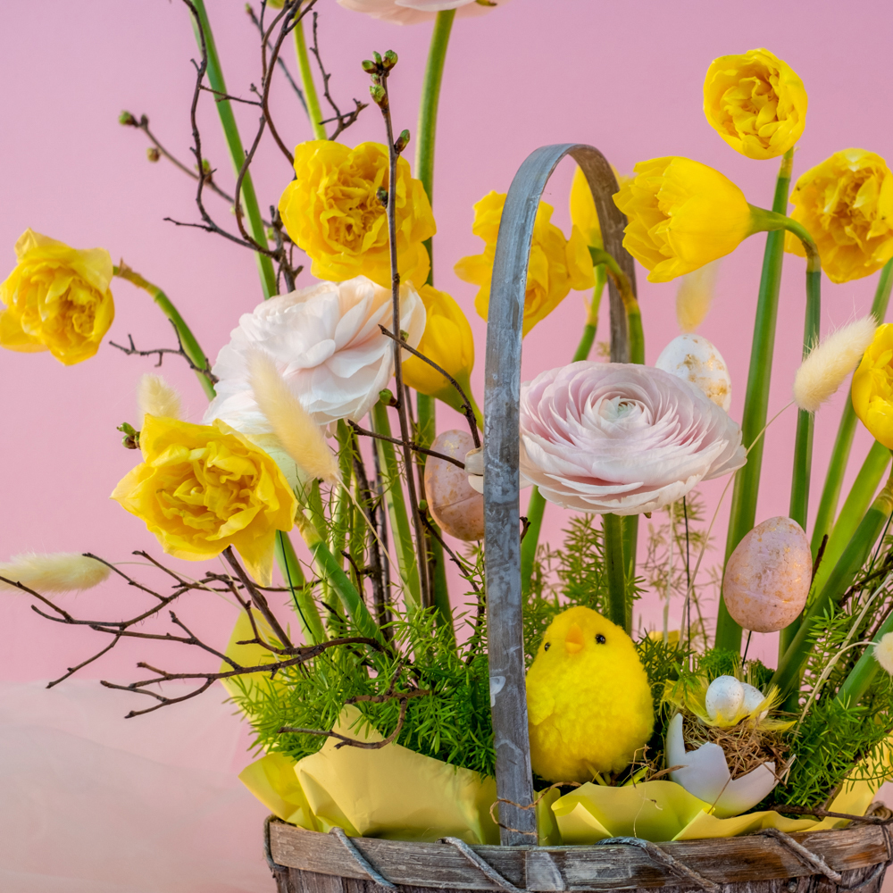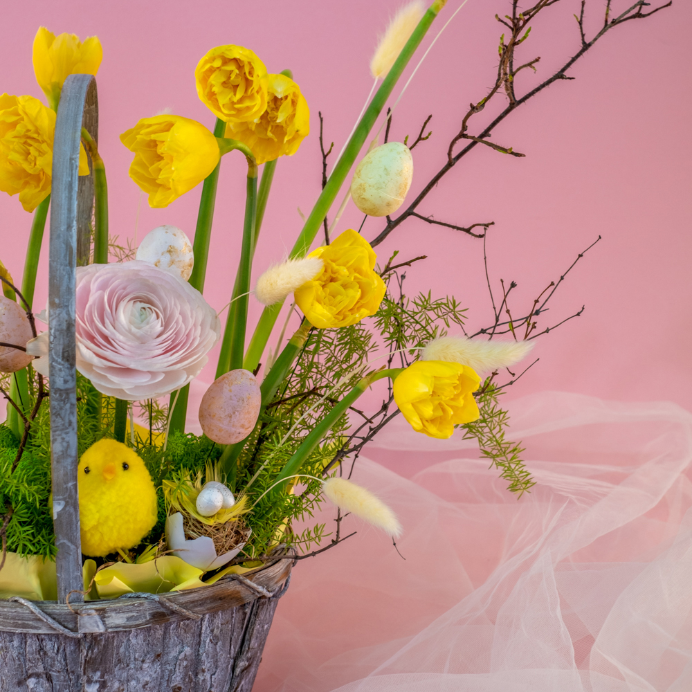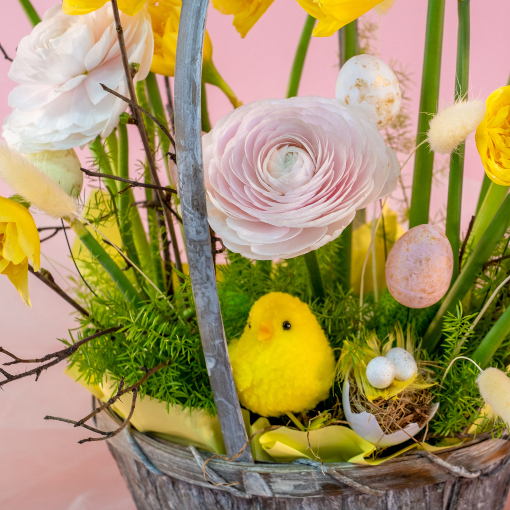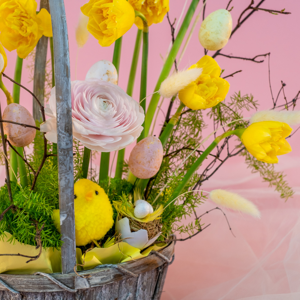 аспарагус - 1, лагурус - 9, нарцисс - 11, ранункулюс - 3, ветка персика - 1, цыплята в гнезде - 1, Яйцо набо 12шт - 5, оазис - 2, корзина