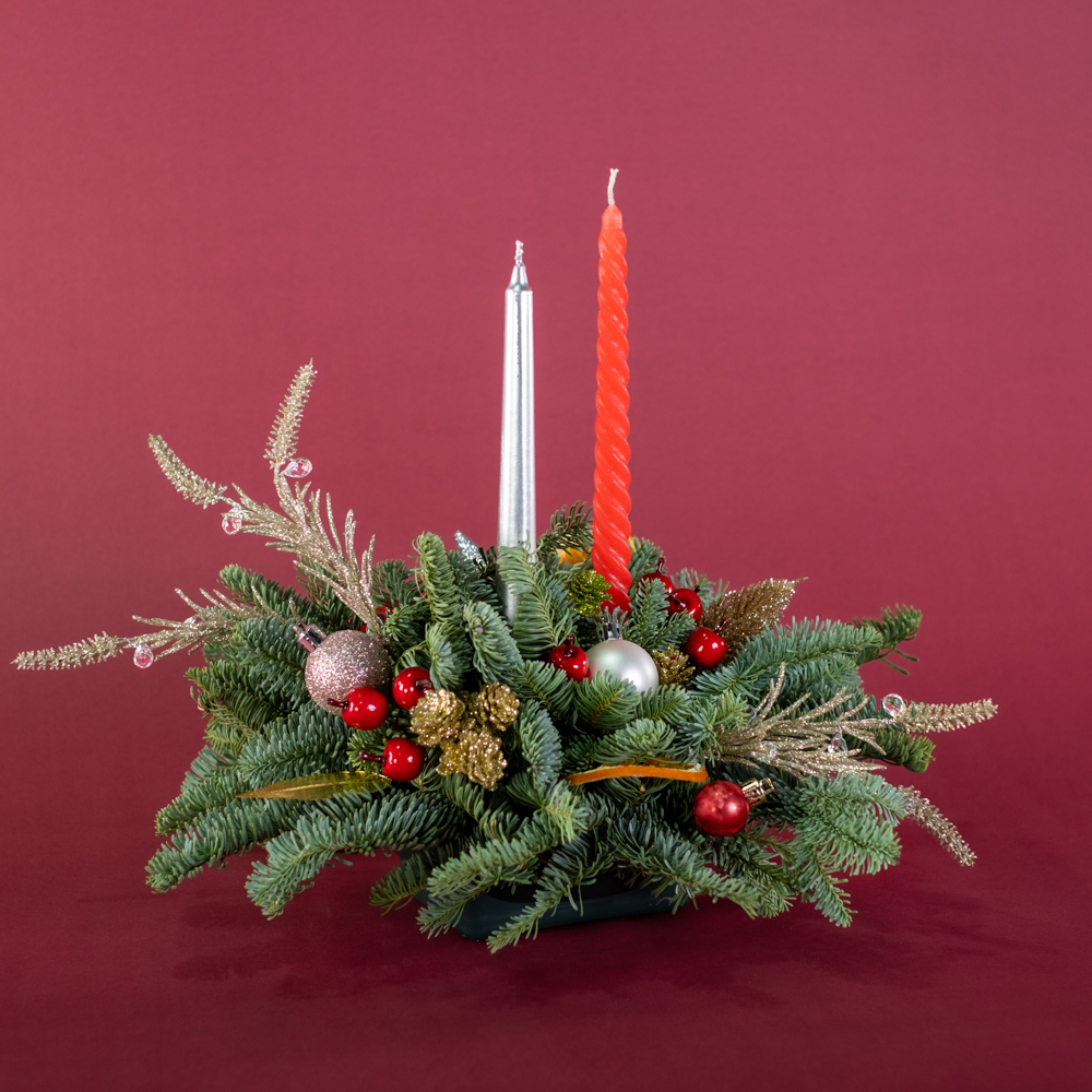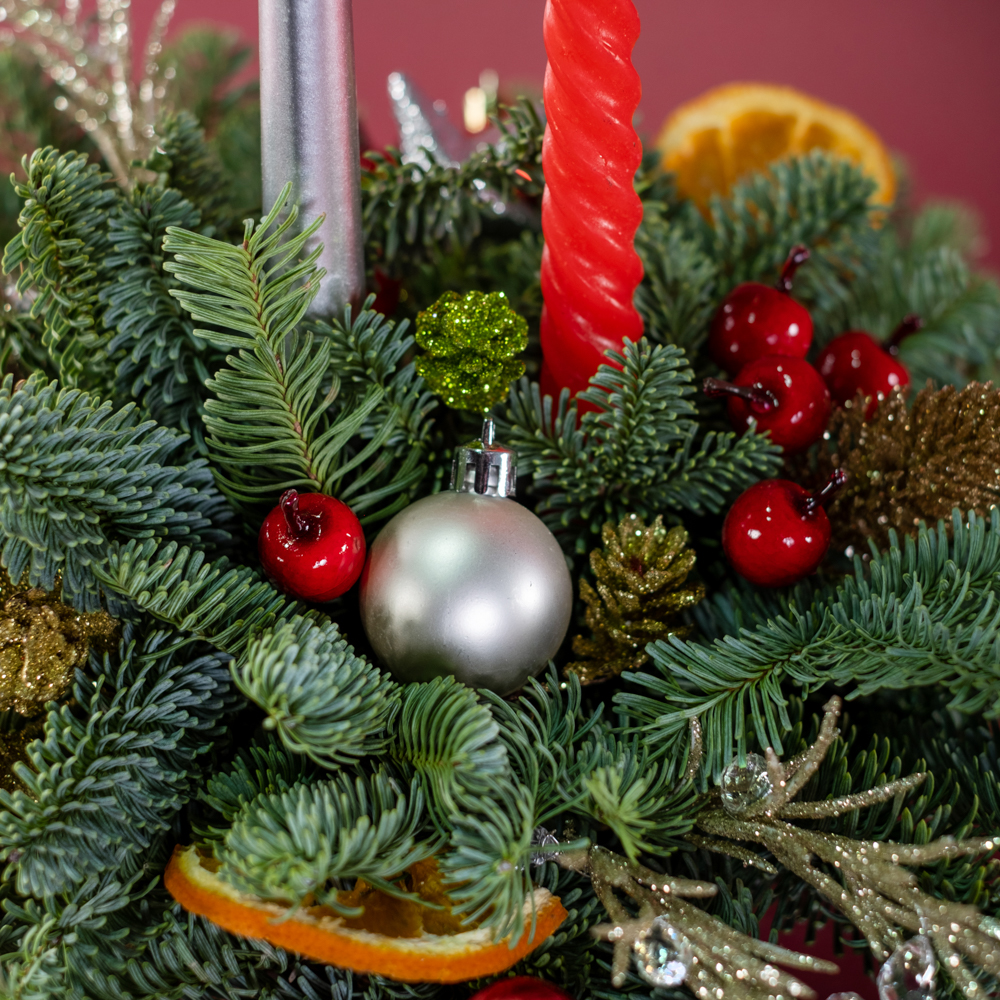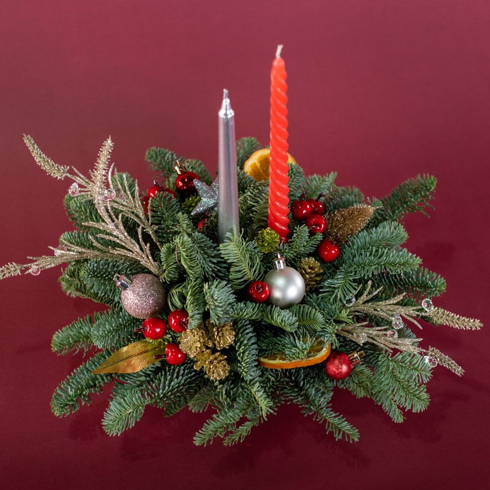 Состав композиции: нобилис, ёлочные украшения, оазис, свечи