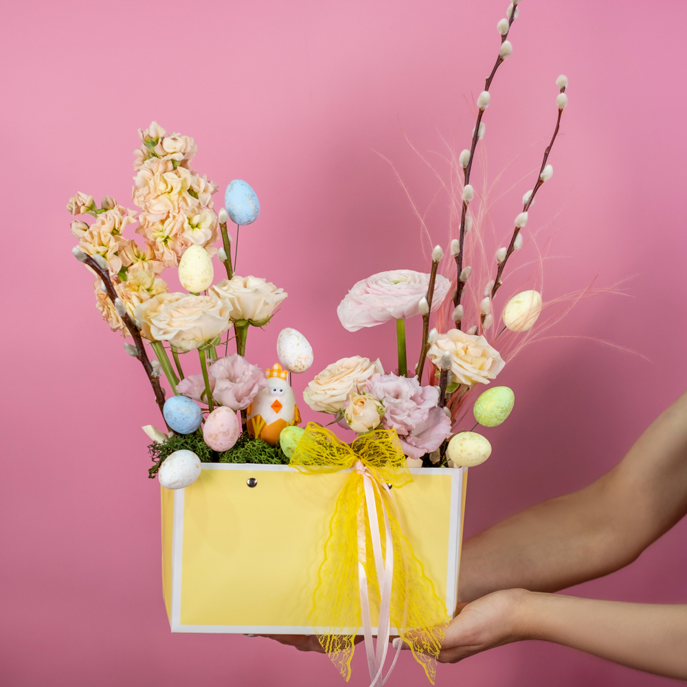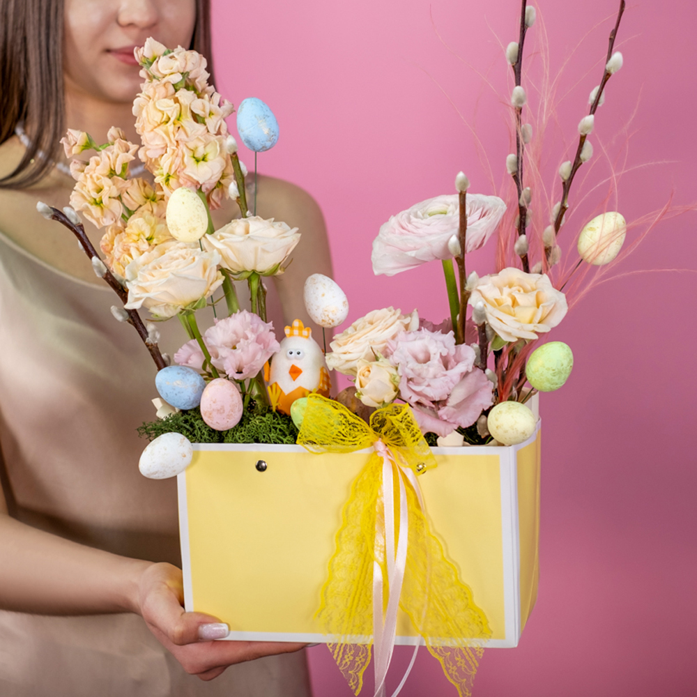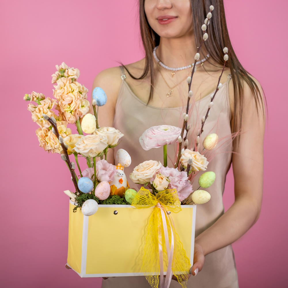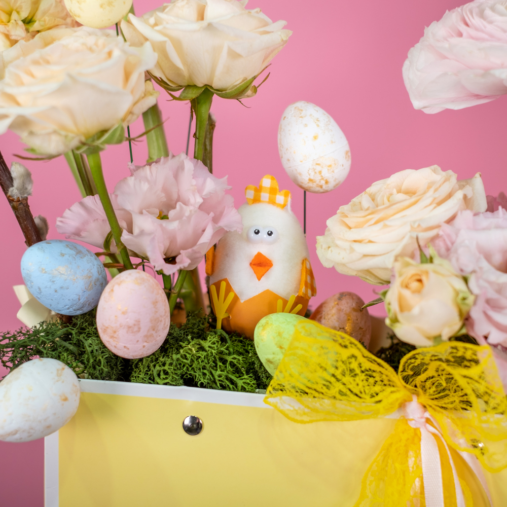 роза куст 2, маттиола 2, ранункулюс 1, верба 5, цыпленок в скорлупе 1, пасхальное яйцо декор 9, ковыль 0,5, сумочка, оазис