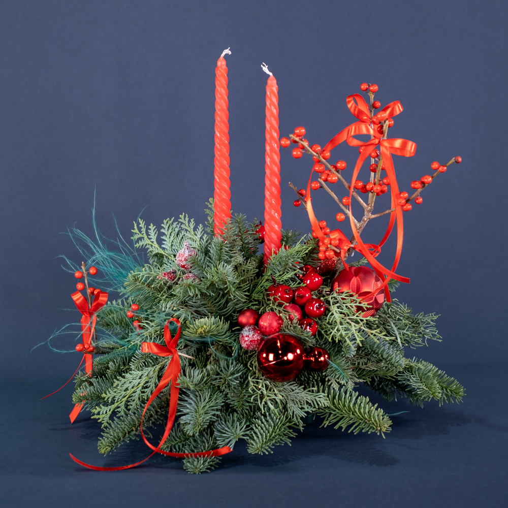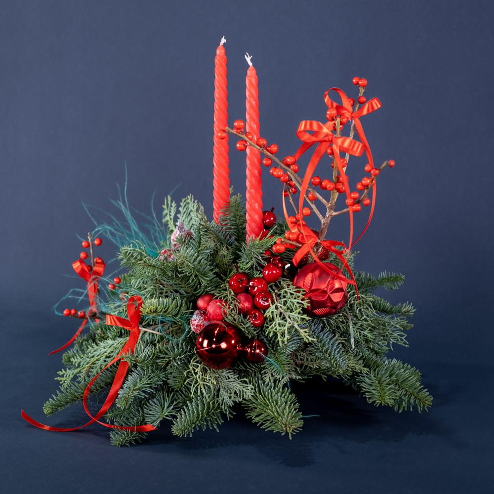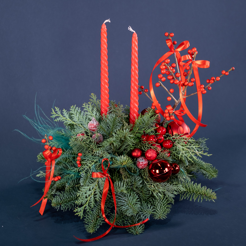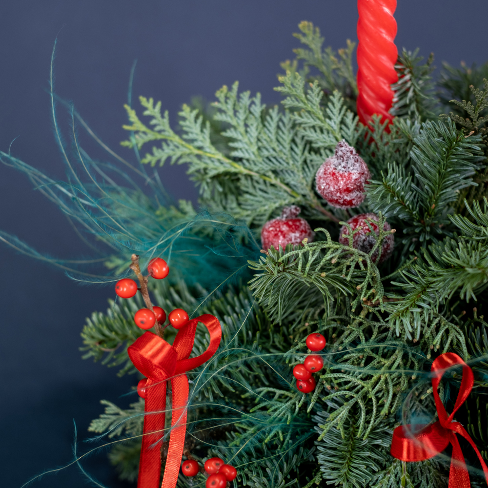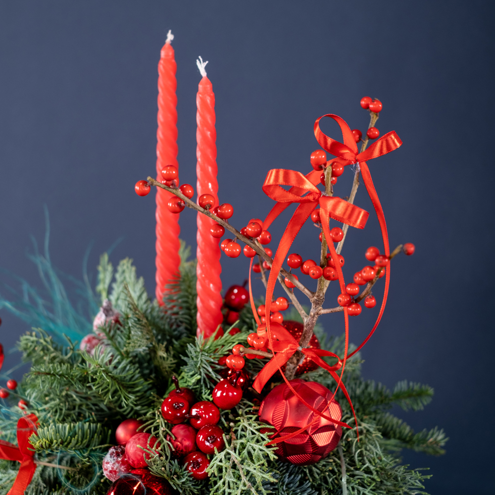 Состав композиции: нобилис, ёлочные украшения, свечи, ленты, сухоцветы