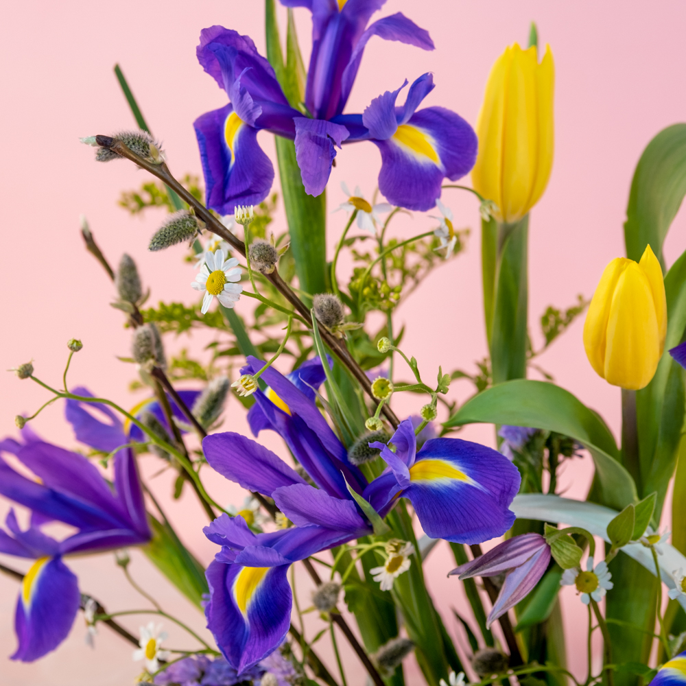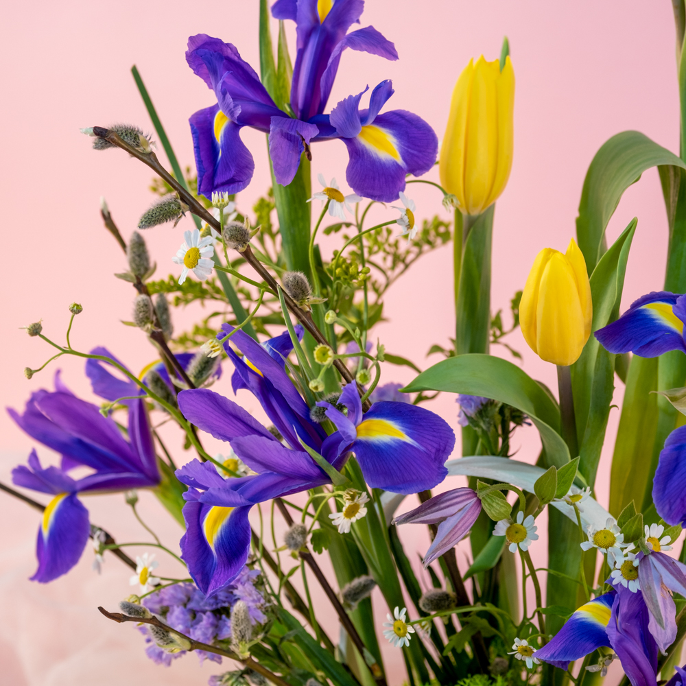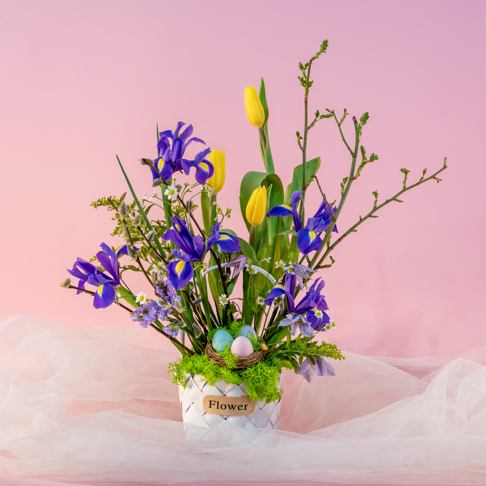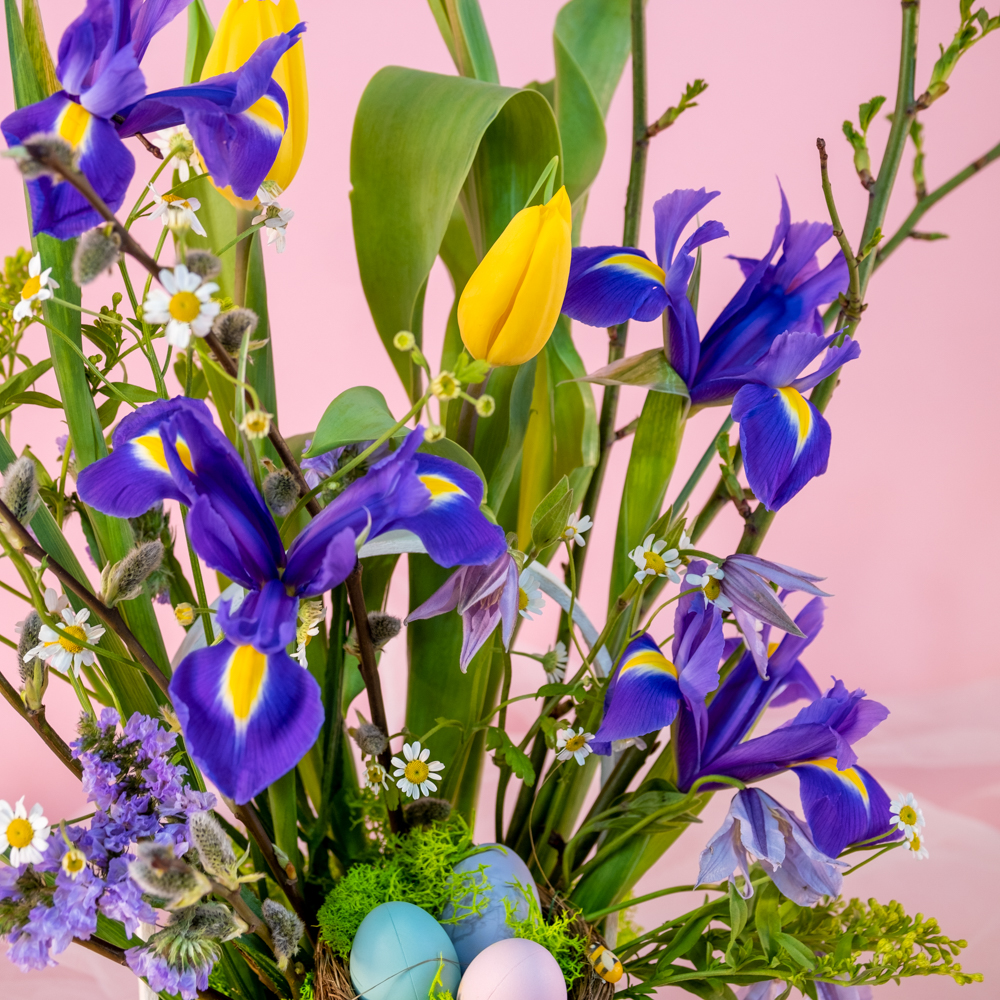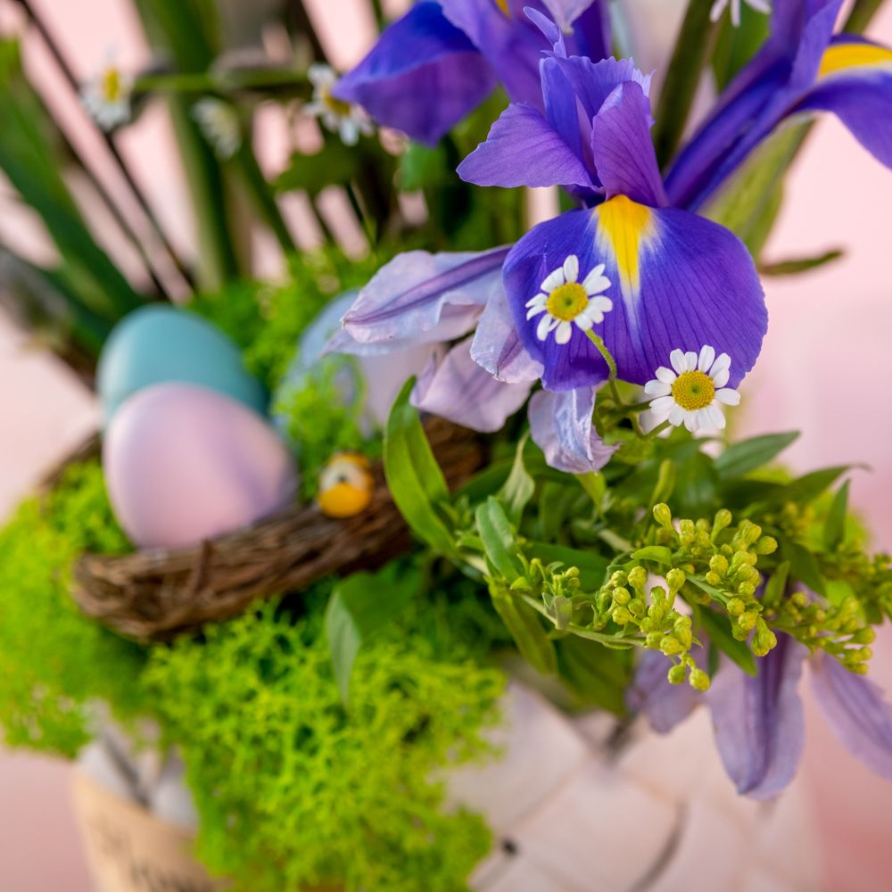 клематис - 1, ирис - 5, матрикария - 1, тюльпан - 3, солидаго - 1, статица - 1, ветка персика - 1, гнездо с яйцами - 1, мох - 0,05, оазис - 1, коробка