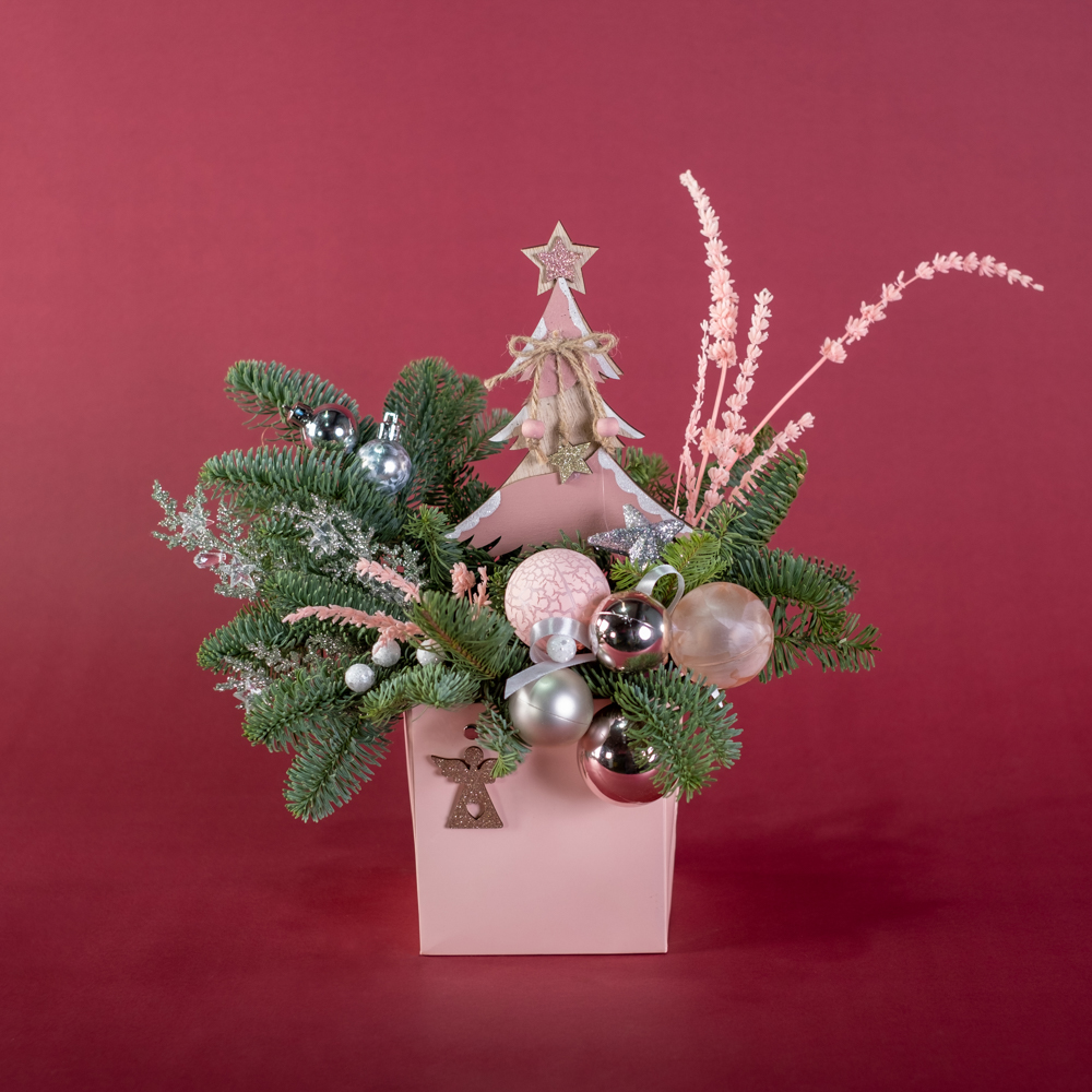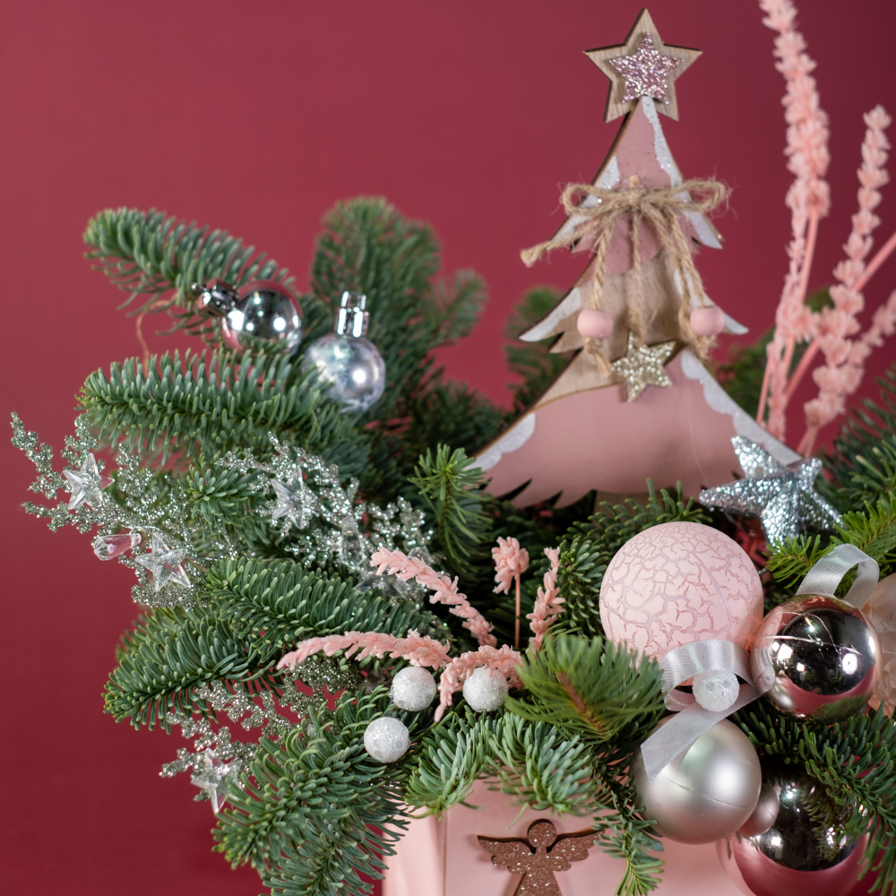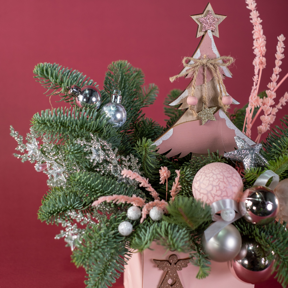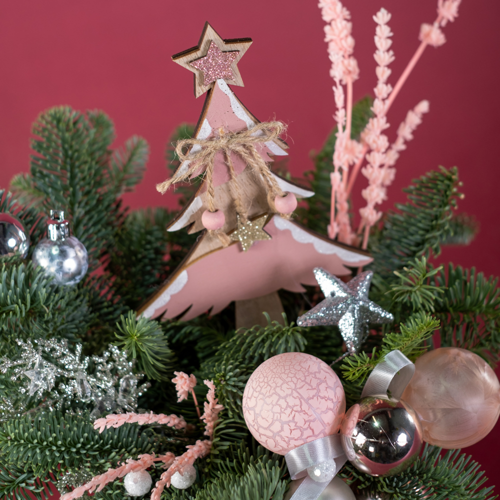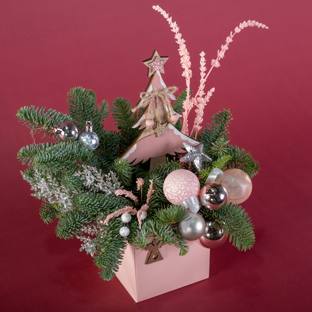 Состав композиции: нобилис, ёлочные украшения, оазис, деревянная фигурка ёлки