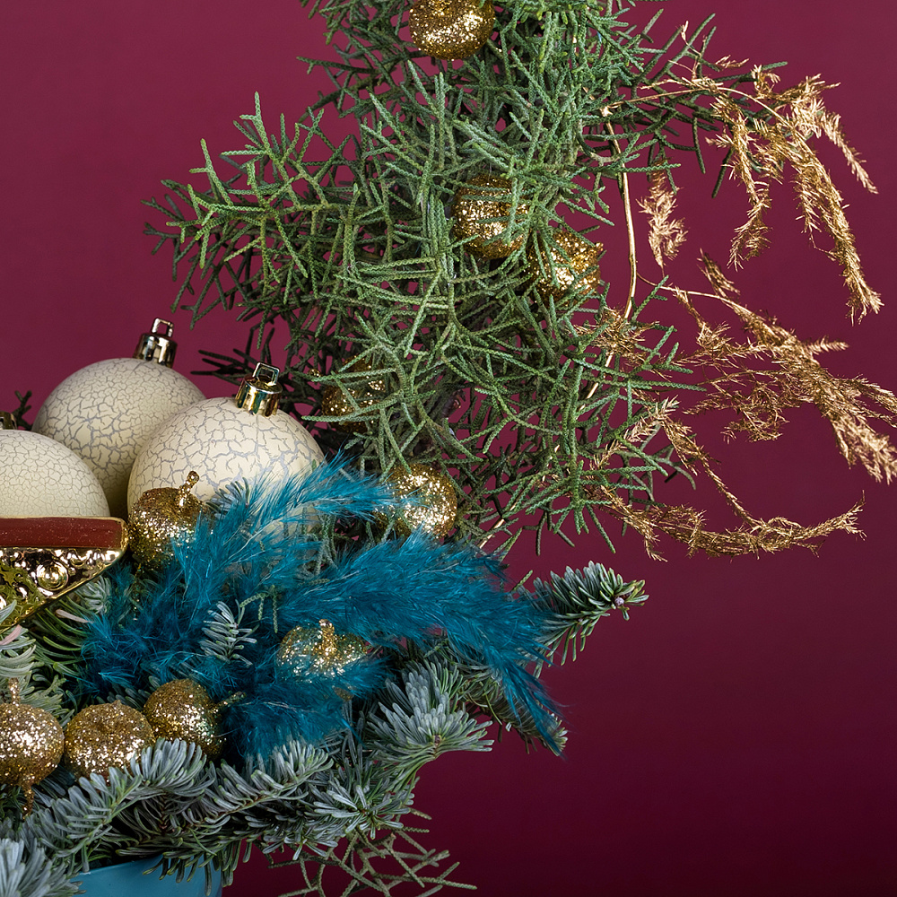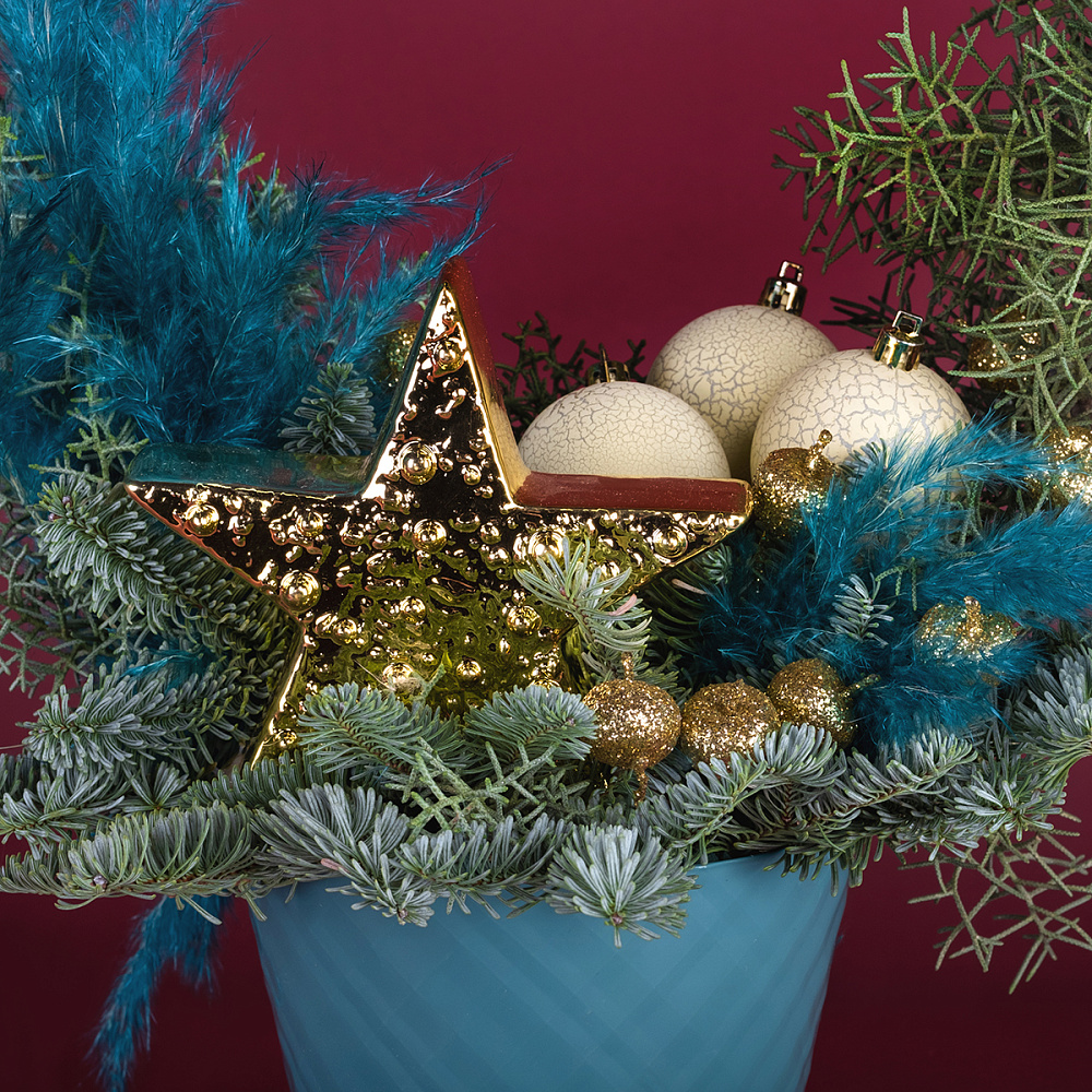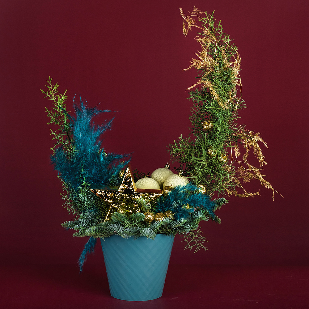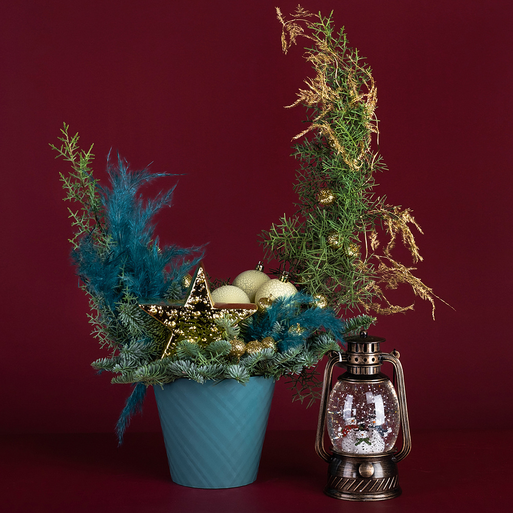 Кипарис - 2, нобилис - 0,5, аспарагус голд - 1, кортадерия - 0,3, золотая звезда 13,8*4,4*14,8 - 1, ягоды на вставке - 12, шар - 3, оазис - 3, горшок пластик - 1, фонарь - 1.