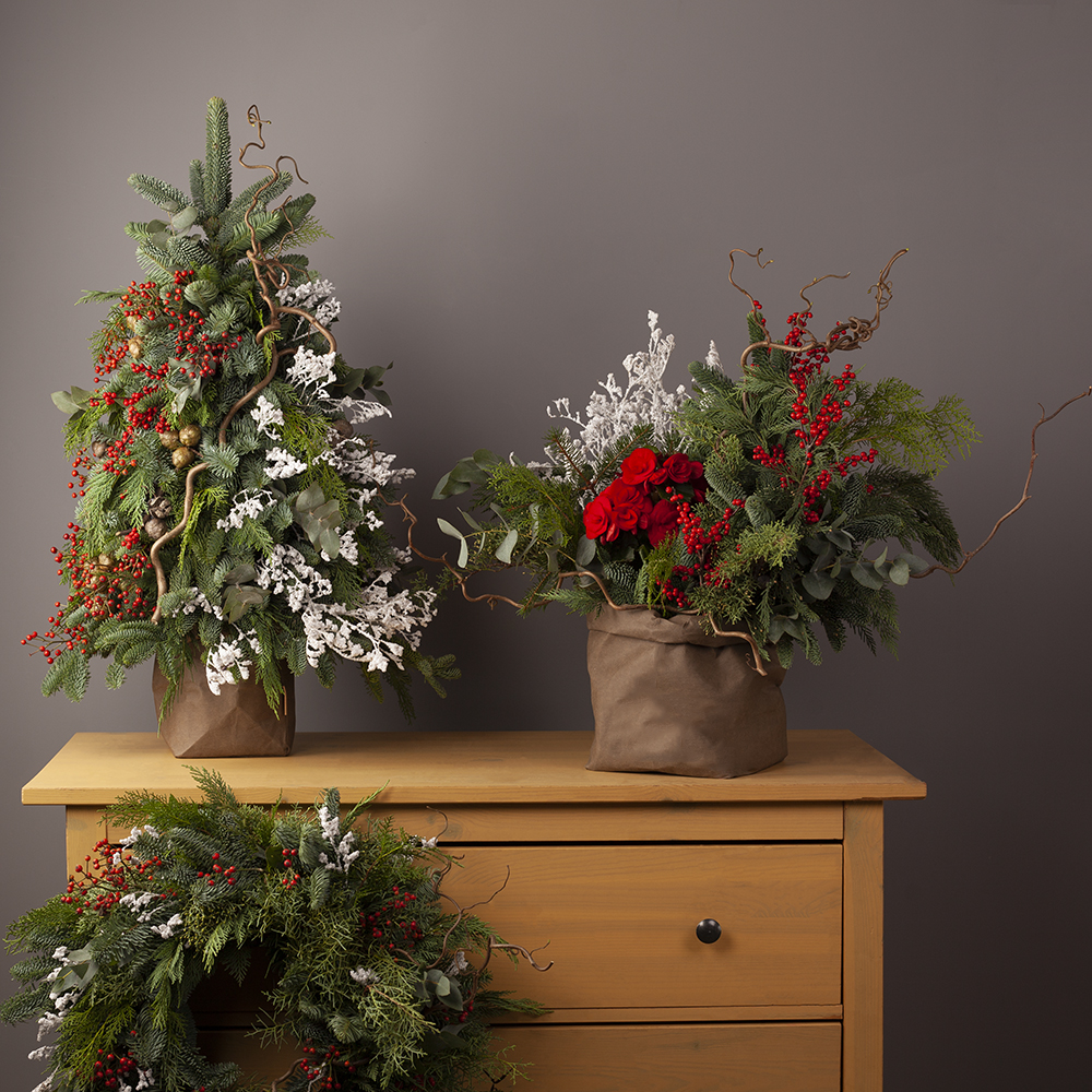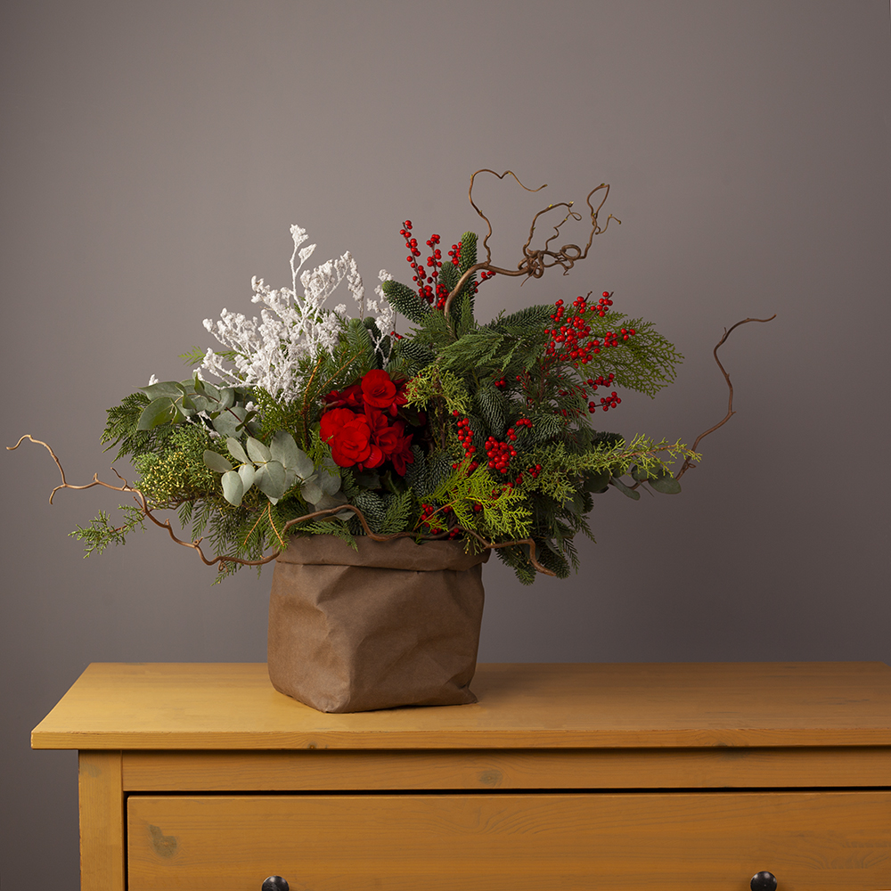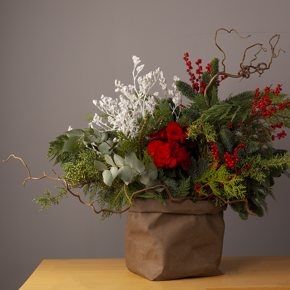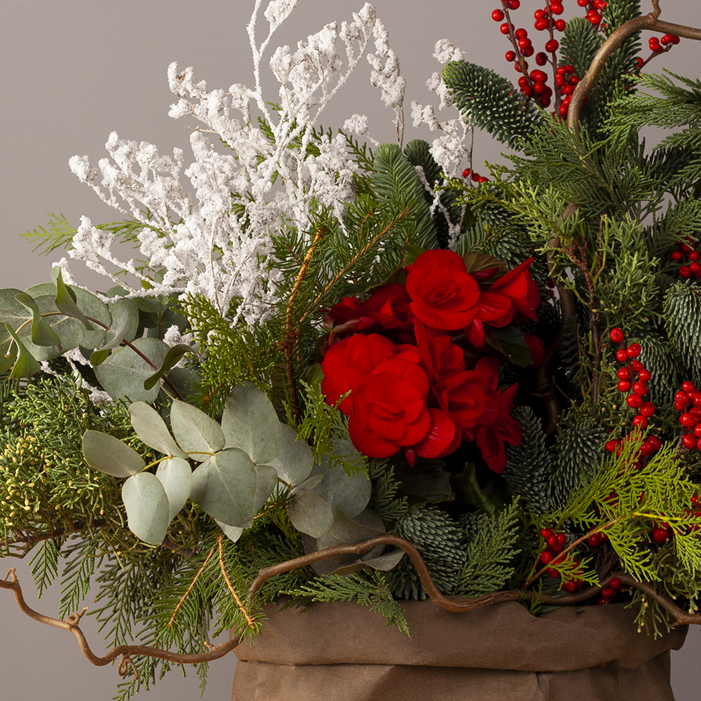 бегония микс 1, илекс 3, кипарис 2, корилиус 3, нобилис 4, сухоцветы 5, туя 6, оазис 6, коробка под композицию