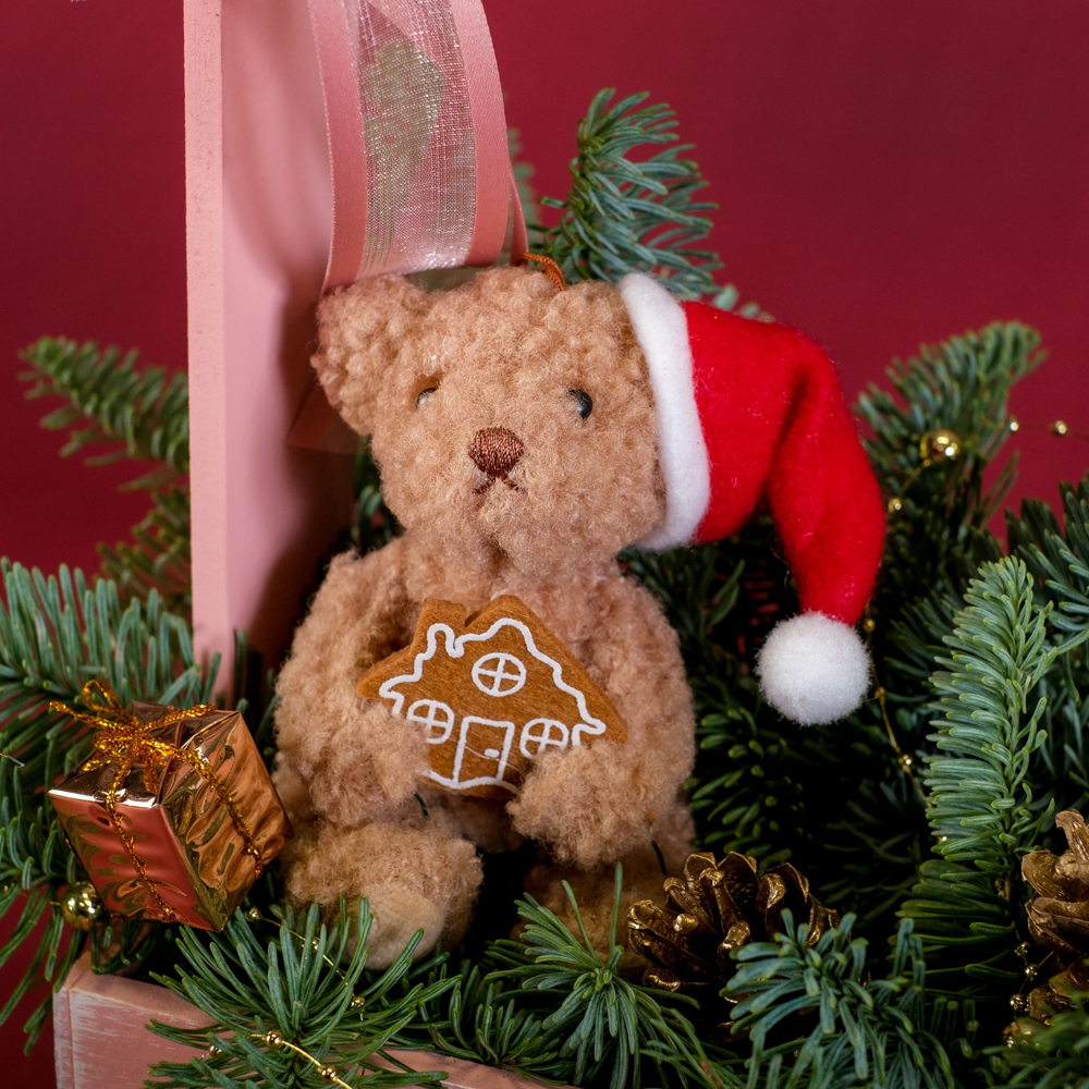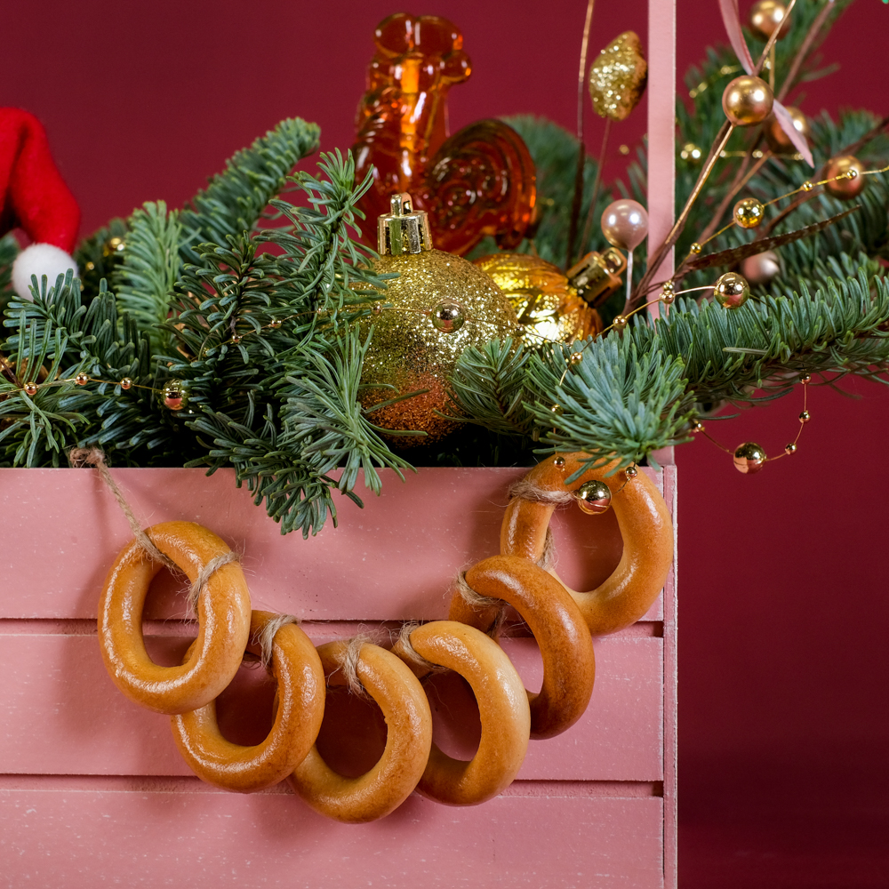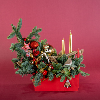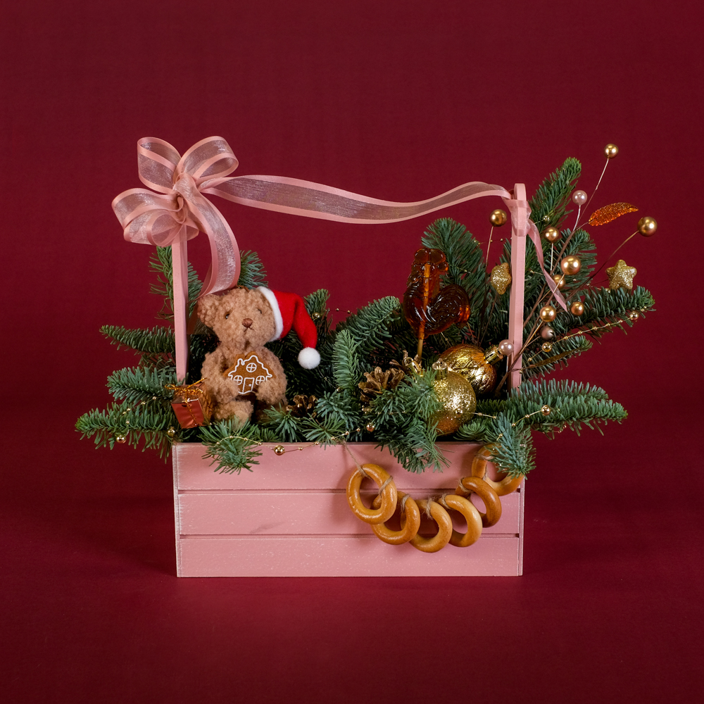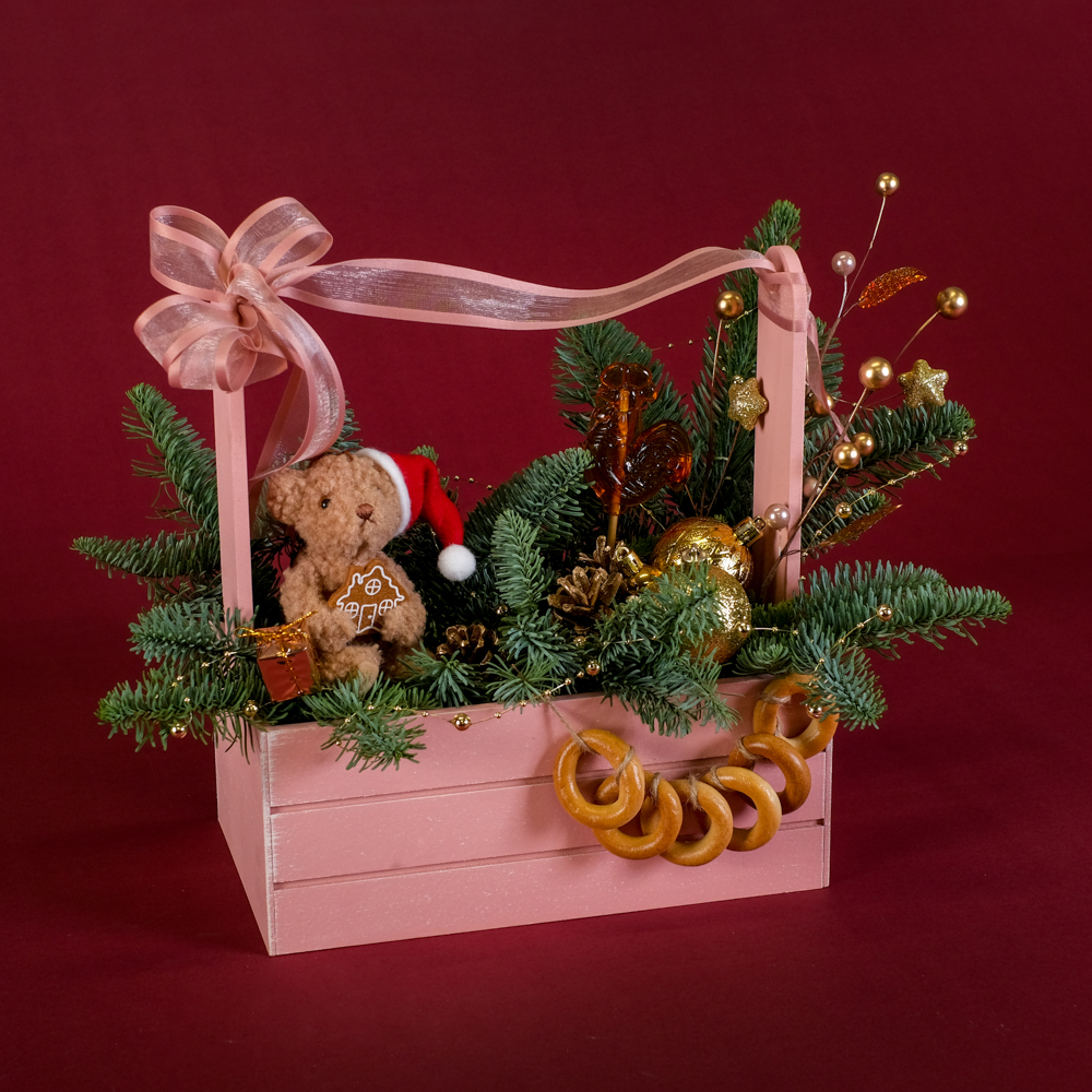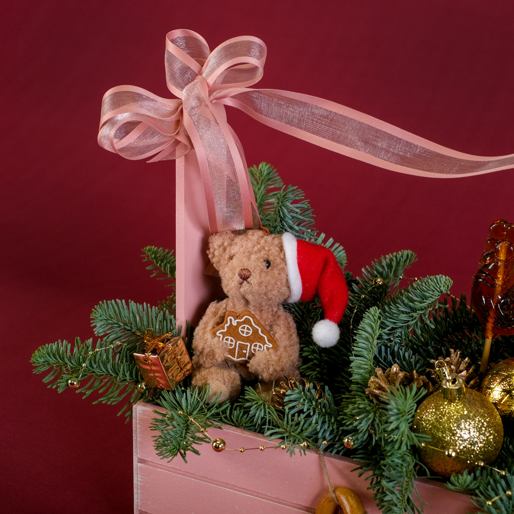 шар 1, шар 2, ветка декоративная 1, мишка 1, бусы 0,2, нобилис 1, шишка 3, сушки, леденец петушок 1, ящик, оазис 3, лента