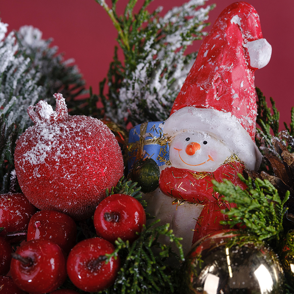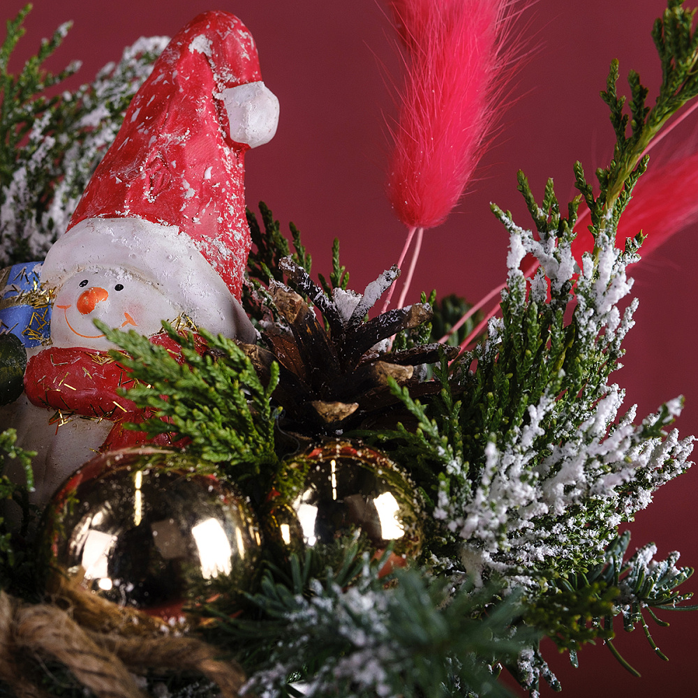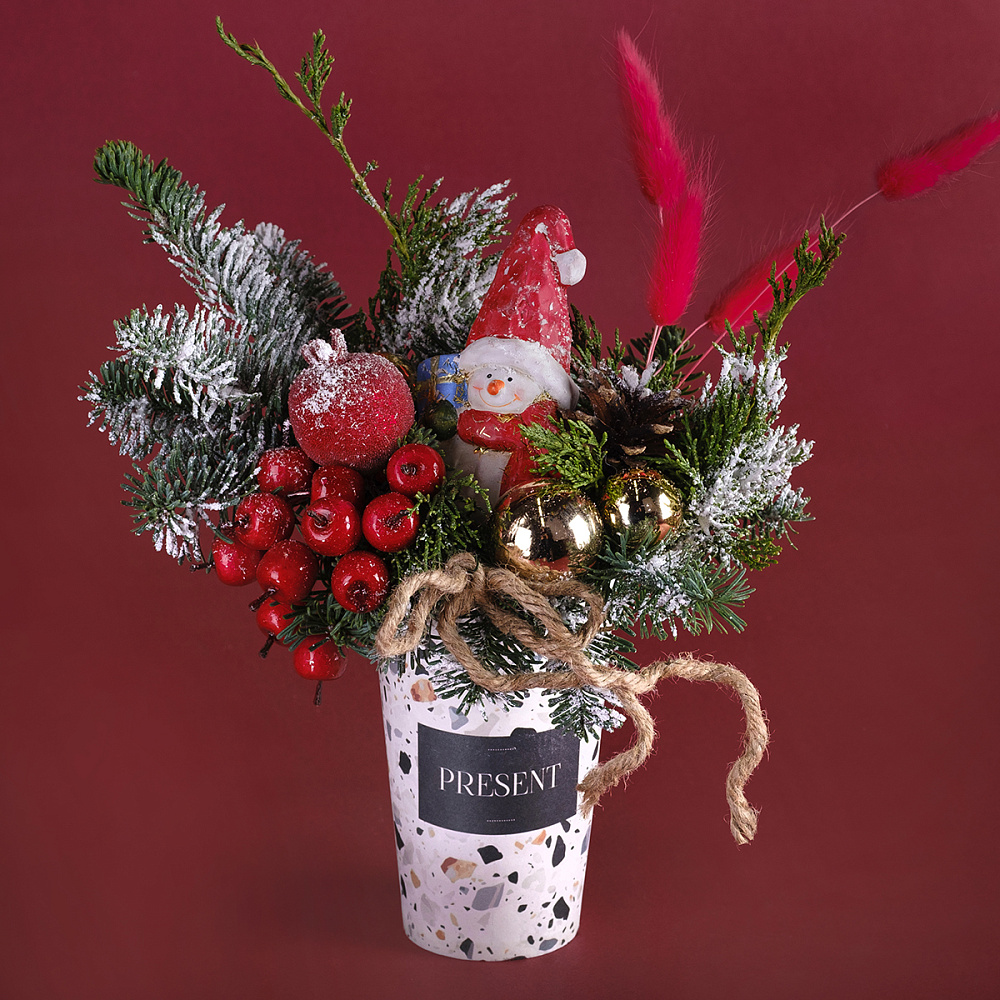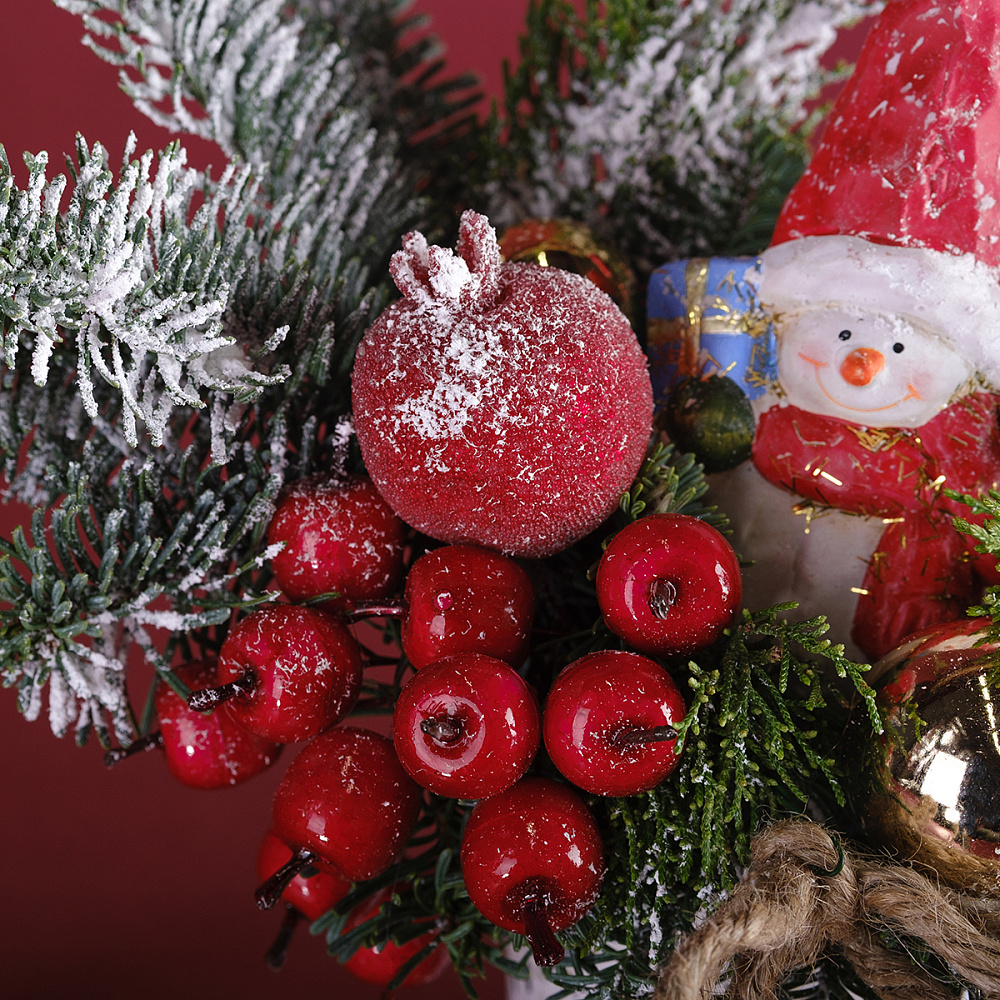 Гранаты засахаренные на проволоке - 1, Елочное украшение Шар - 3, Лагурус брусника - 4, можжевельник - 0,3, нобилис - 0,3, шишка сосновая - 1, снеговик в колпаке - 1, ягодная вставка - 12, оазис - 1, стаканчик маленький.